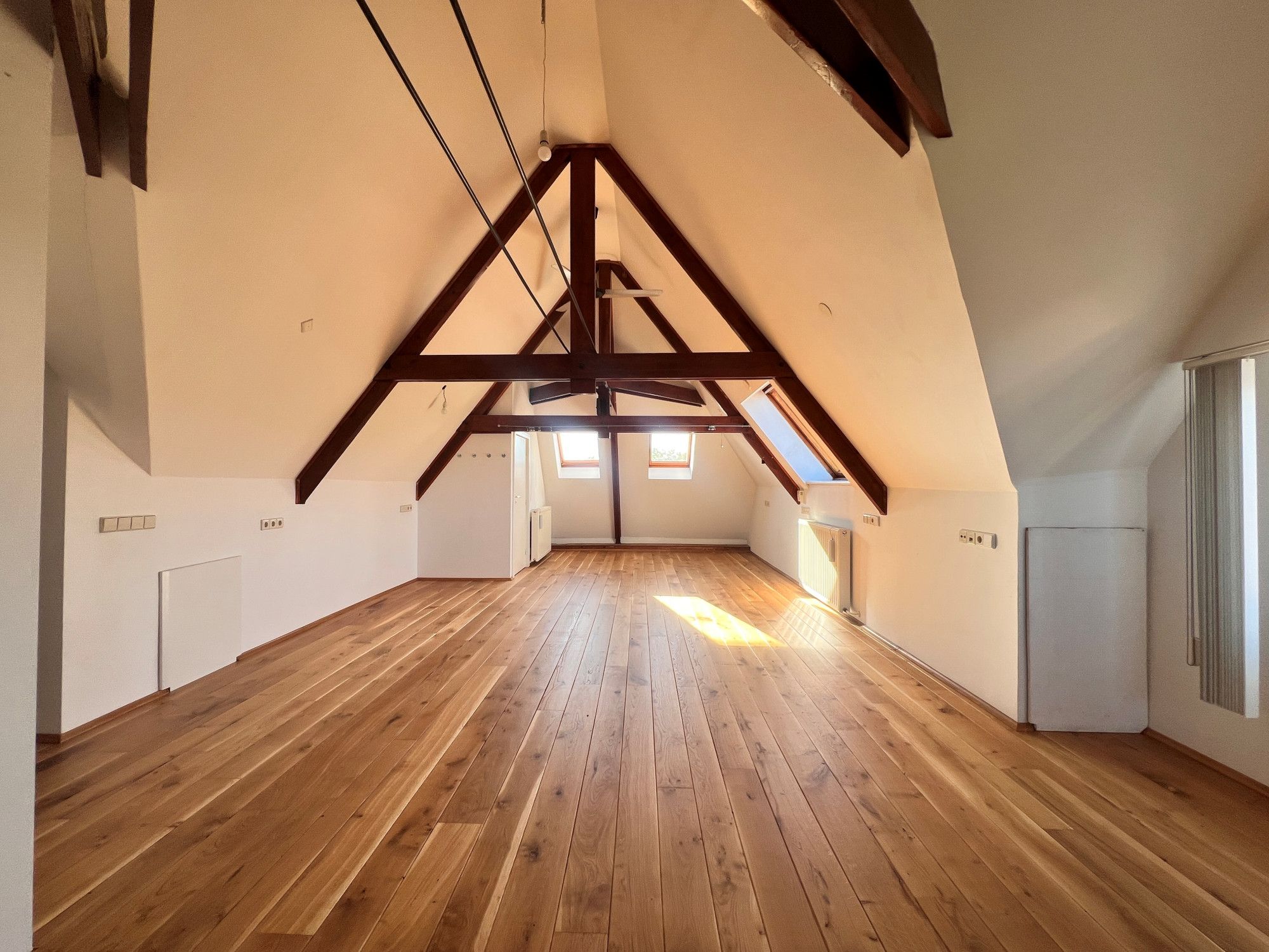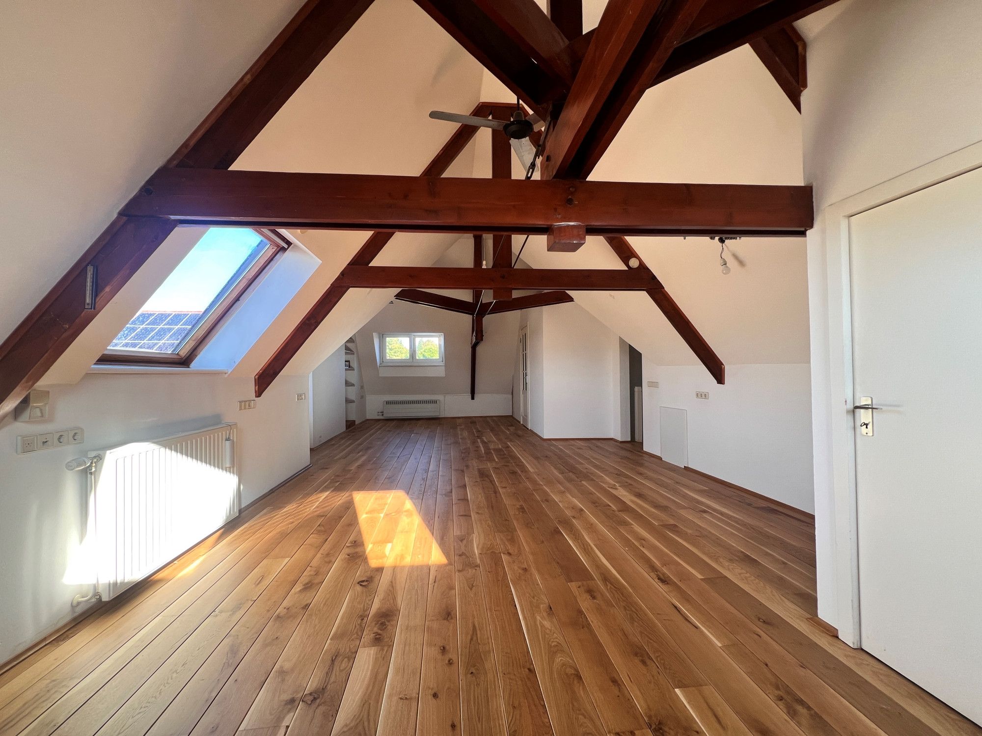 Very spacious (approx. 40m²) and atmospheric bedroom with exposed ceiling beams, offering multifunctional use. This room also provides access to the second bathroom, which includes a shower, second toilet, washbasin, and designer radiator.