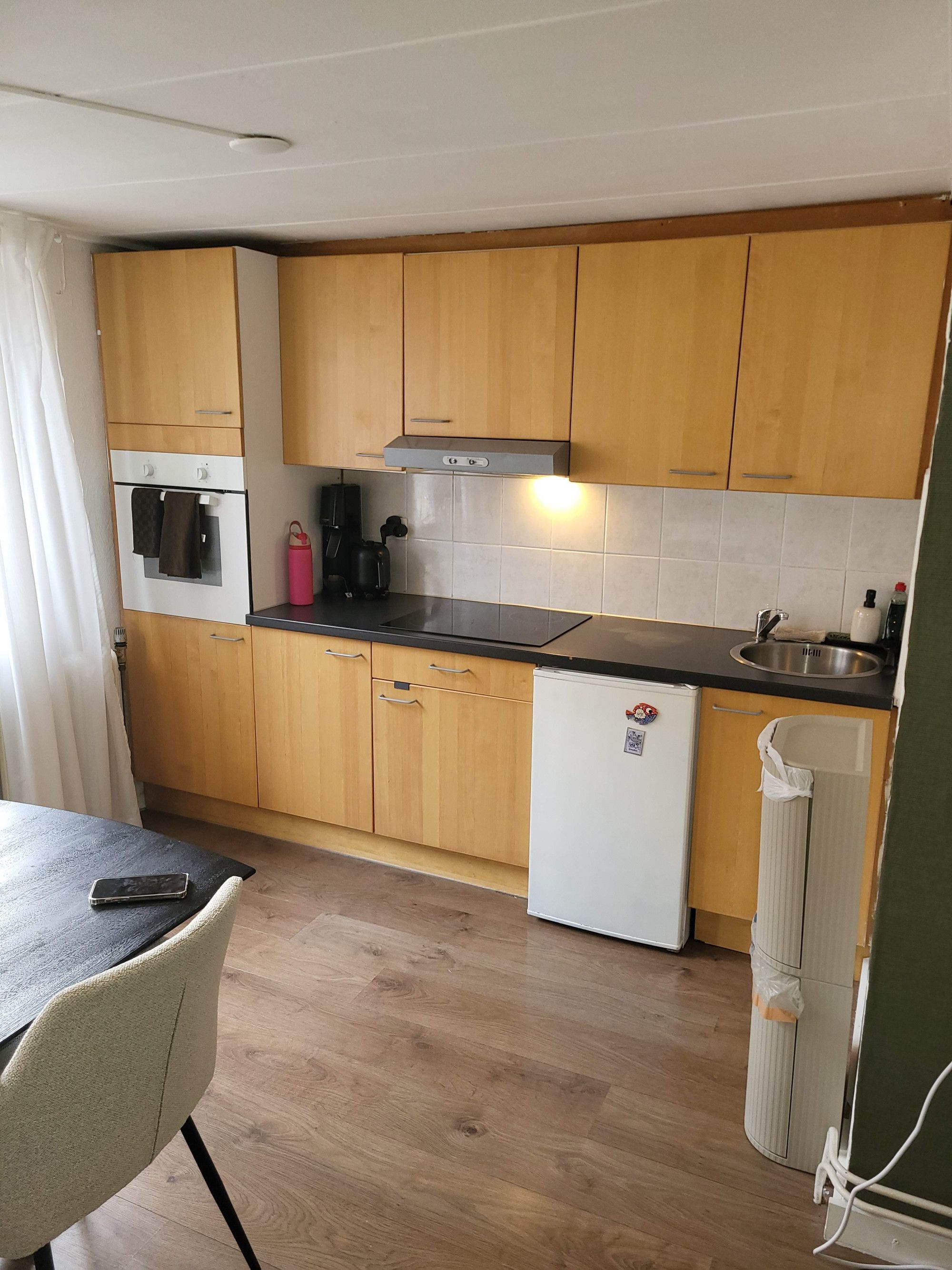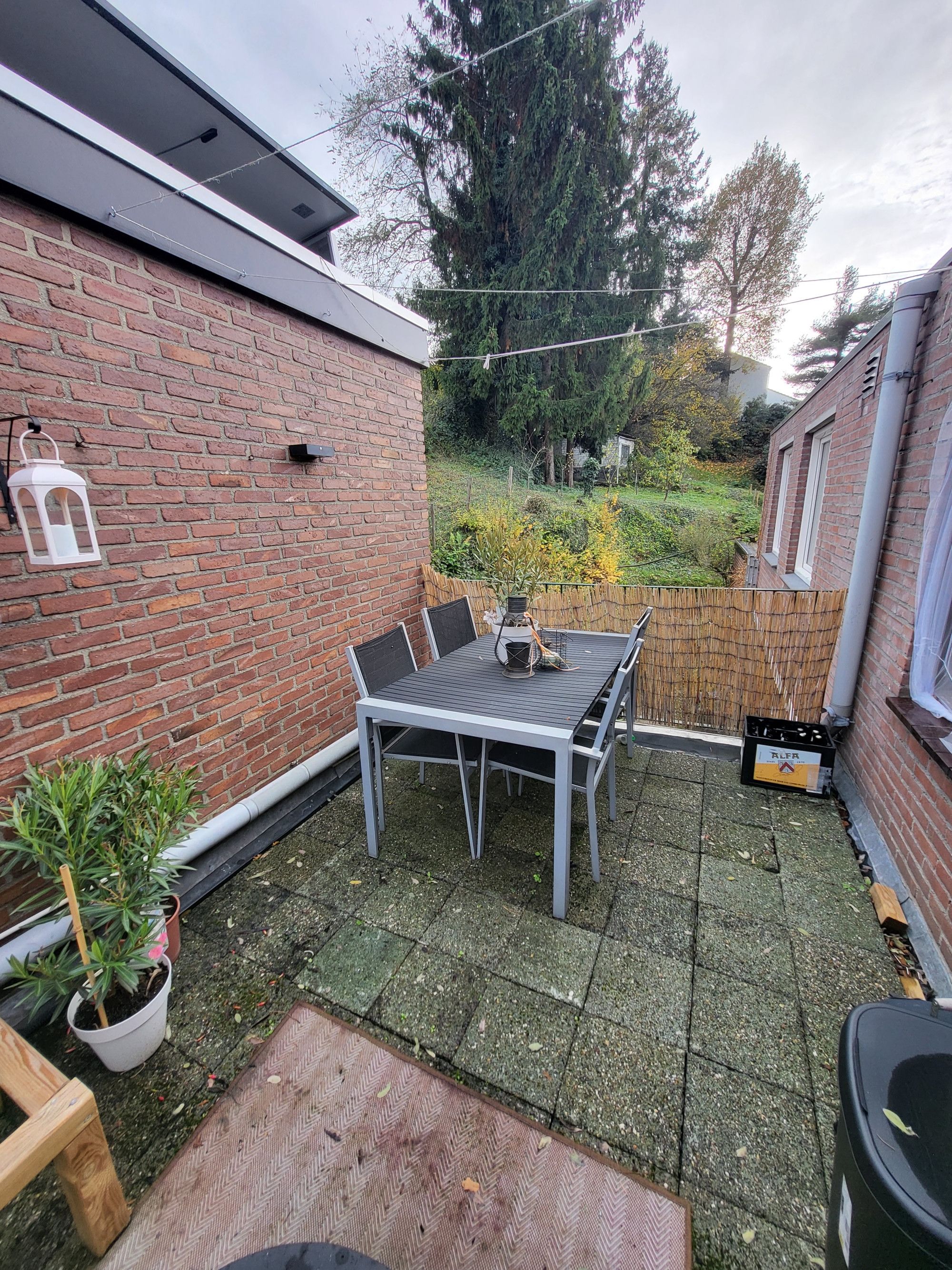 Simple 2 bedroom apartment for rent on the Geulhemmerweg in Berg en Terblijt. The apartment is situated on the first floor of a small-scale apartment complex. The living room with open kitchen is approximately 25m2. The basic kitchen layout is equipped with a refrigerator, oven, 4-burner electric hob, extractor hood and sink. The house has 2 compact bedrooms of 9m2 and 8m2 respectively. The bathroom has a shower, sink, toilet and the connection for the washing machine. The apartment also has a spacious roof terrace of approximately 14m2 which can be reached from the living room.