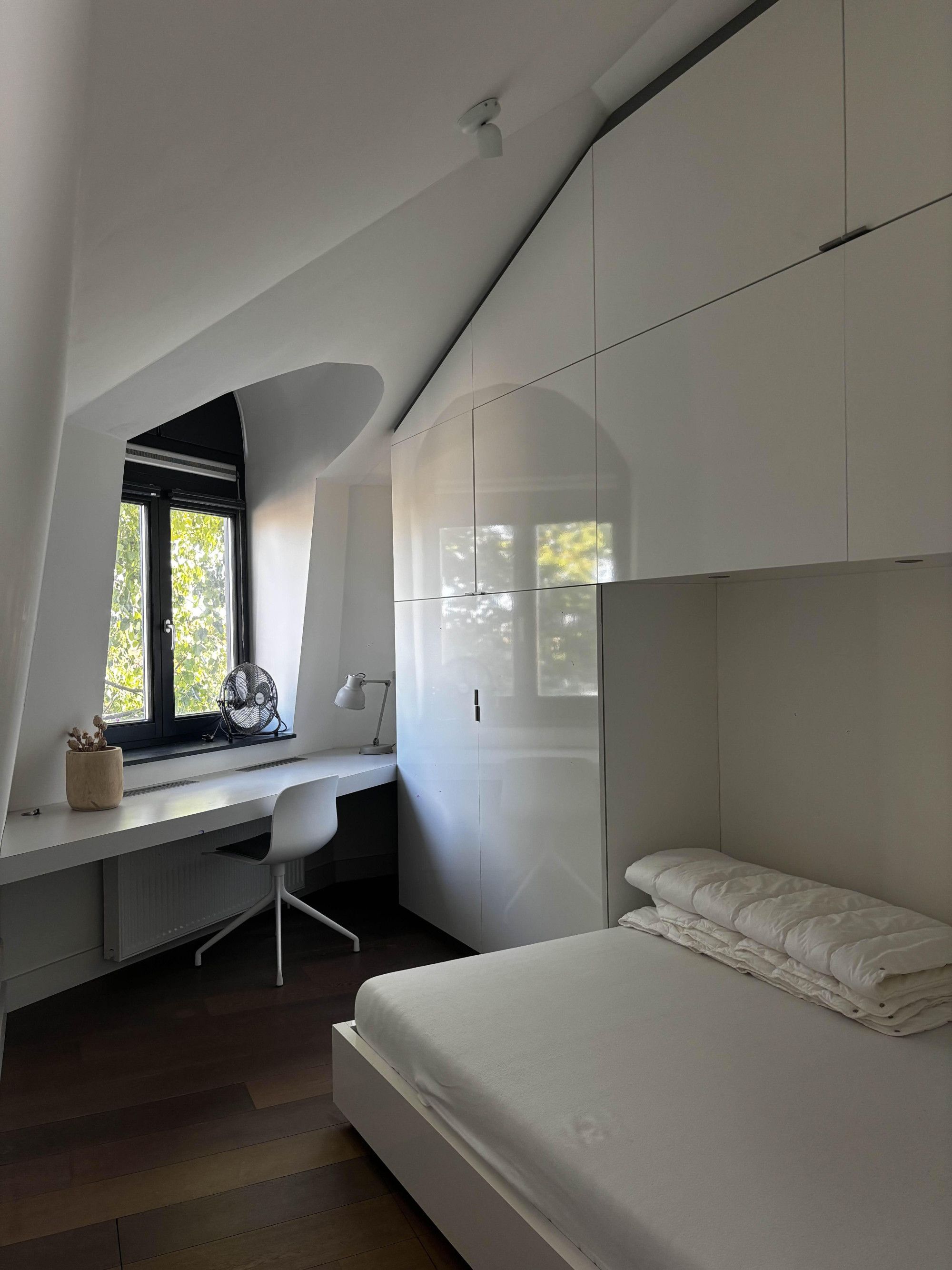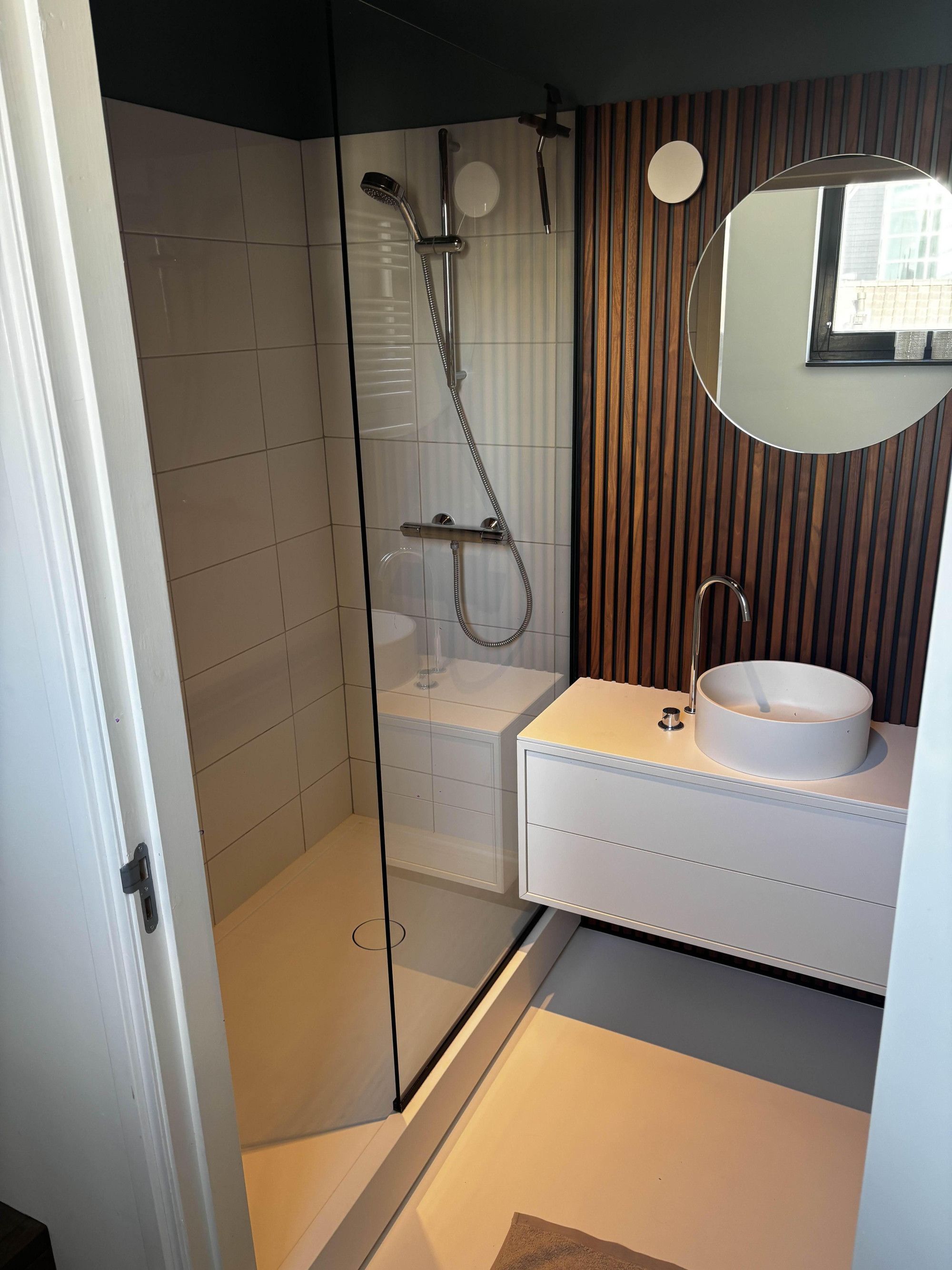 De slaapkamer beschikt over een op maat gemaakte kastenwand en extra bergruimte onder de slaapkamer. De moderne badkamer is voorzien van een inloopdouche met thermostaatkraan, mengkraan, en wastafelmeubel.
