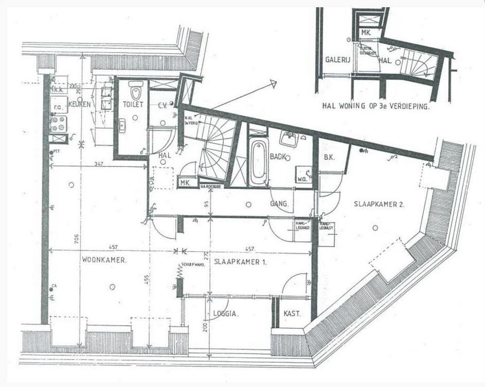 Directly off the centrally located hall, with a wardrobe alcove, is a spacious, separate toilet. The bathroom, with a bathtub, is also located further in the apartment. On the corner is the master bedroom, which has a playful triangular shape. This bedroom also features a practical storage closet/storage space.