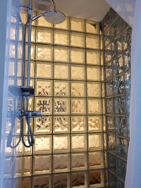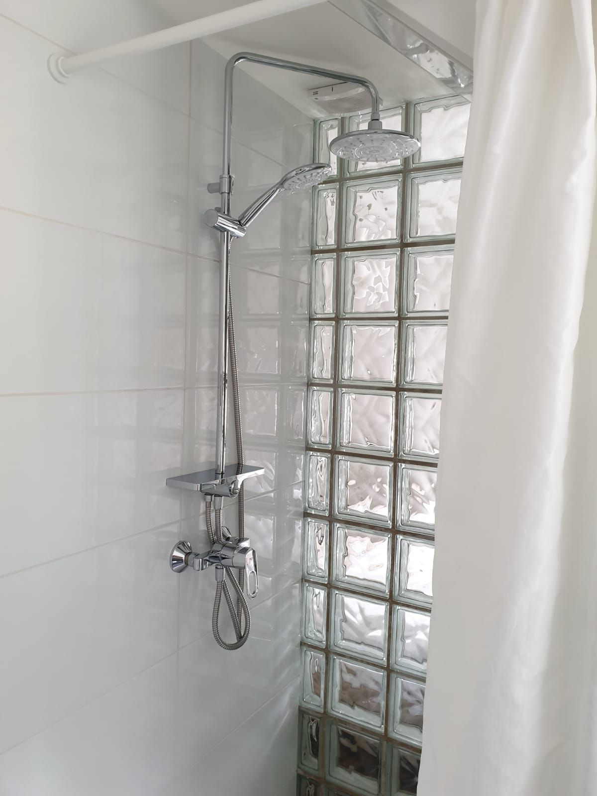 Fully tiled modern bathroom with rain shower, modern vanity, wall-hung toilet, and washing machine connection (3.30m x 1.25m = 2 m²).