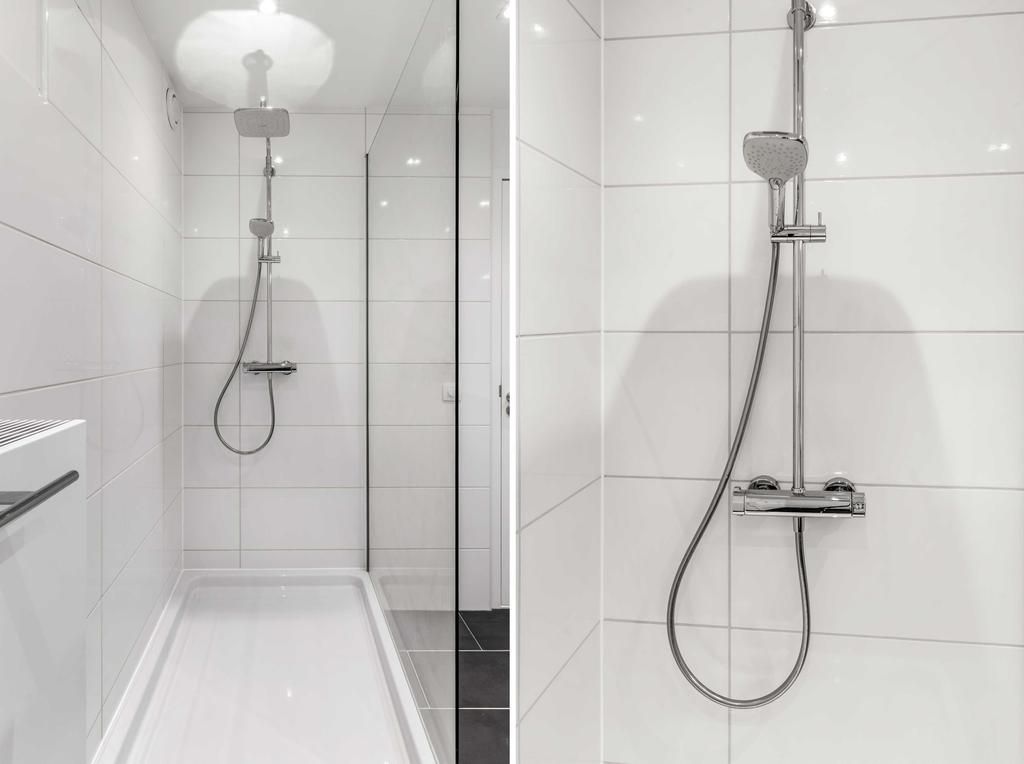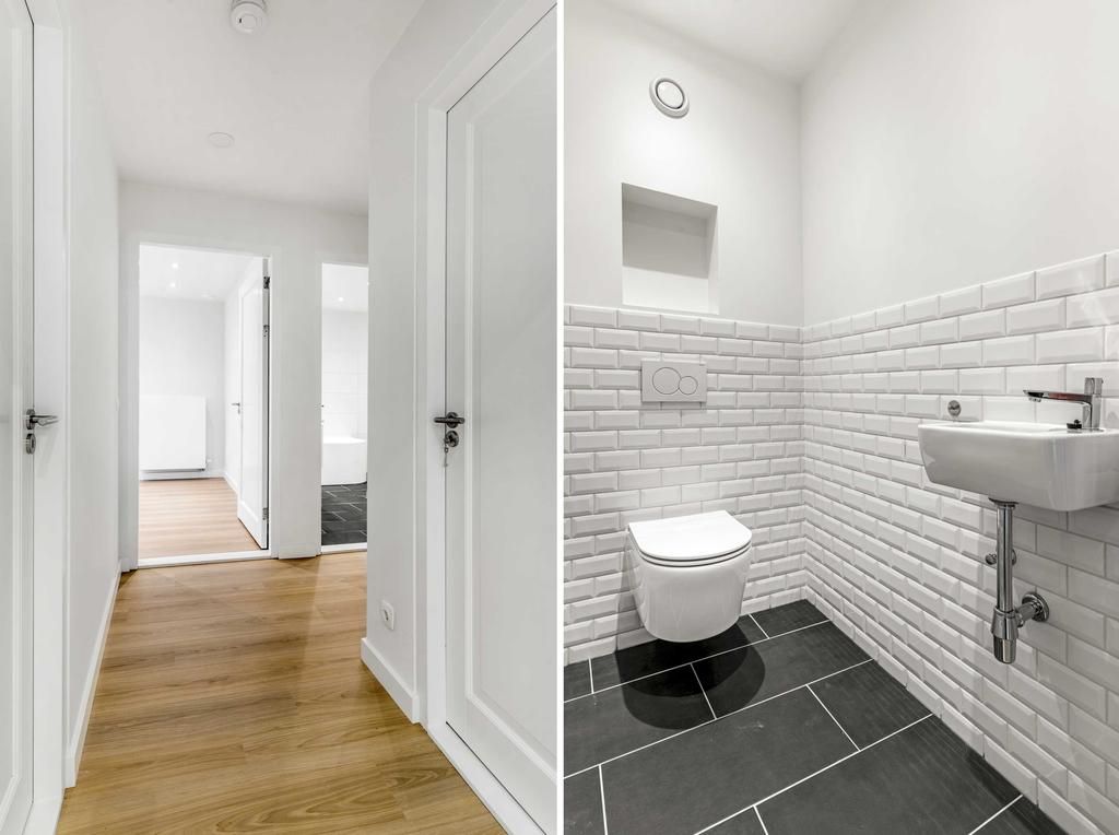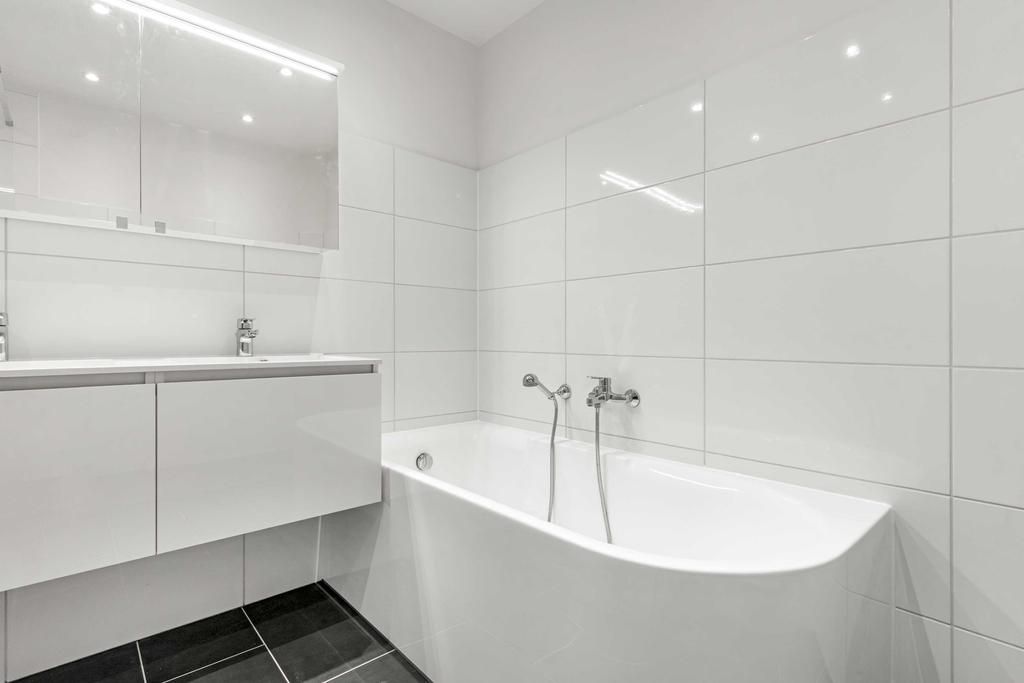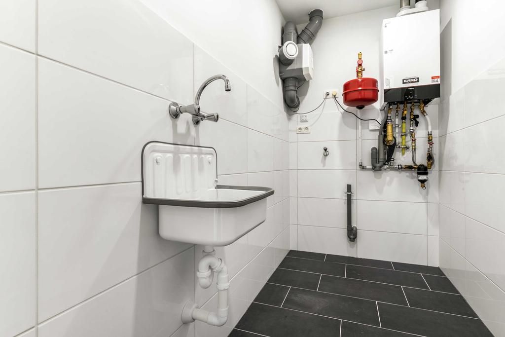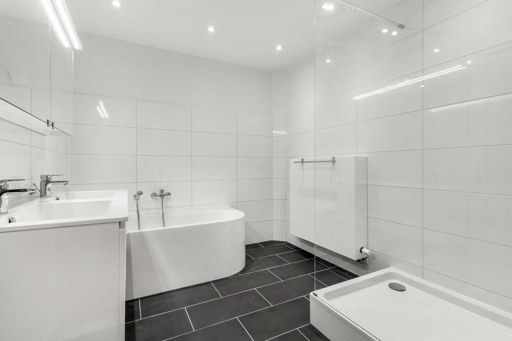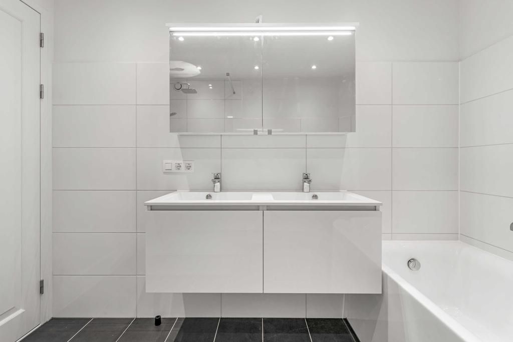 Vanuit het portaal is er toegang tot de inpandige berging, de toiletruimte, 2 slaapkamers en de badkamer. De toiletruimte is voorzien van een zwevend closet en fonteintje. De slaapkamers zijn ca. 7,5m² en 12m² groot. De badkamer is ingericht met een ligbad, douchecabine met glazen wanden, een dubbele wastafel met meubel en inbouwspots.