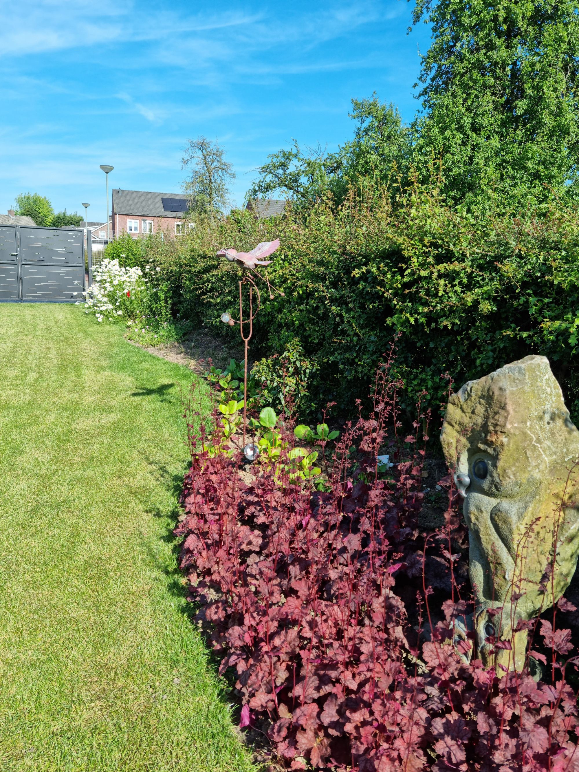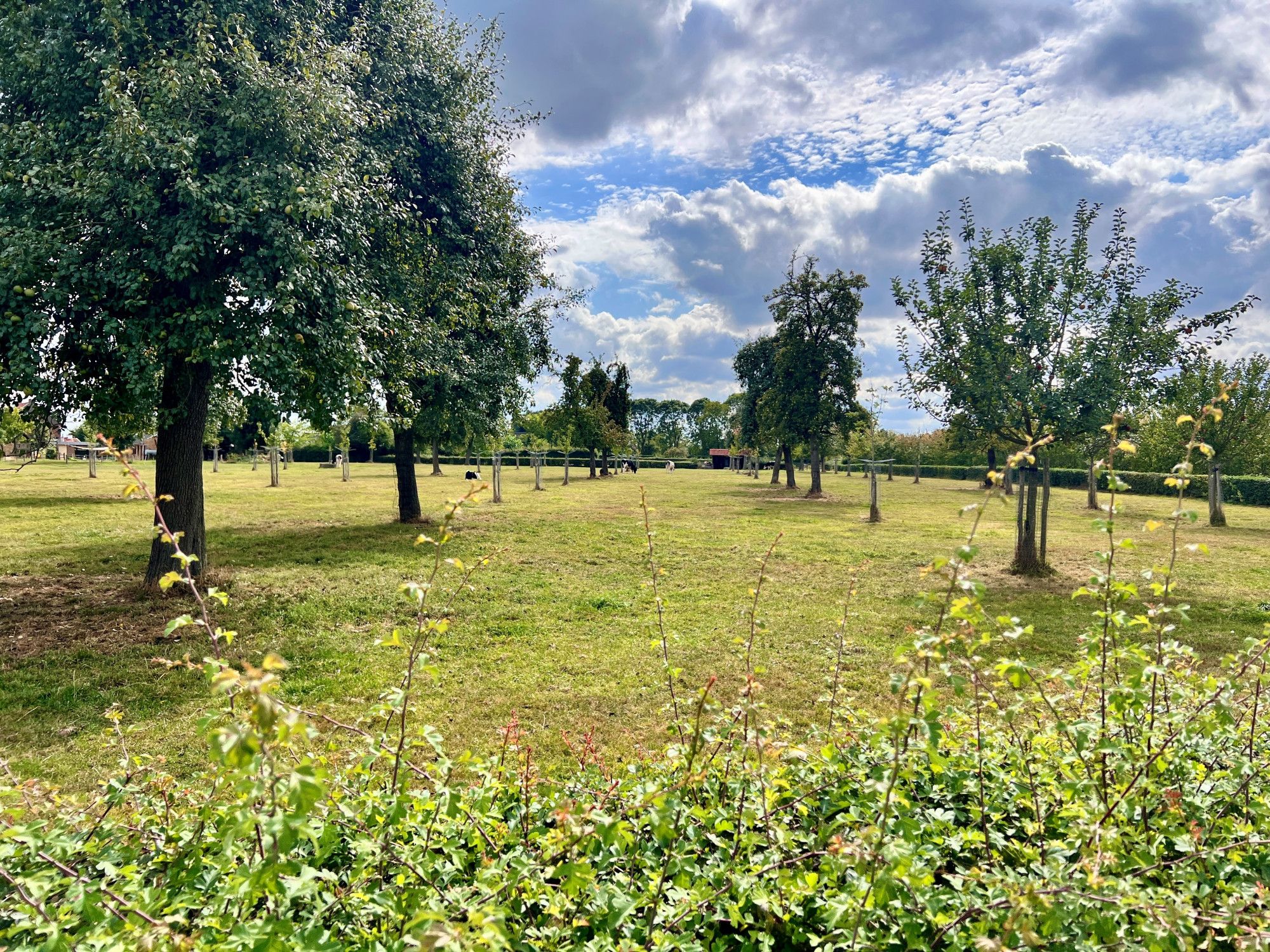 The property has a beautifully landscaped garden surrounding the house, offering multiple seating areas with both sun and shade. View of the adjacent plot, which serves as a pasture for animals. There is ample parking on the private driveway. The insulated garage is ideal for storing bicycles or a motorcycle, and there is an additional garden shed.
