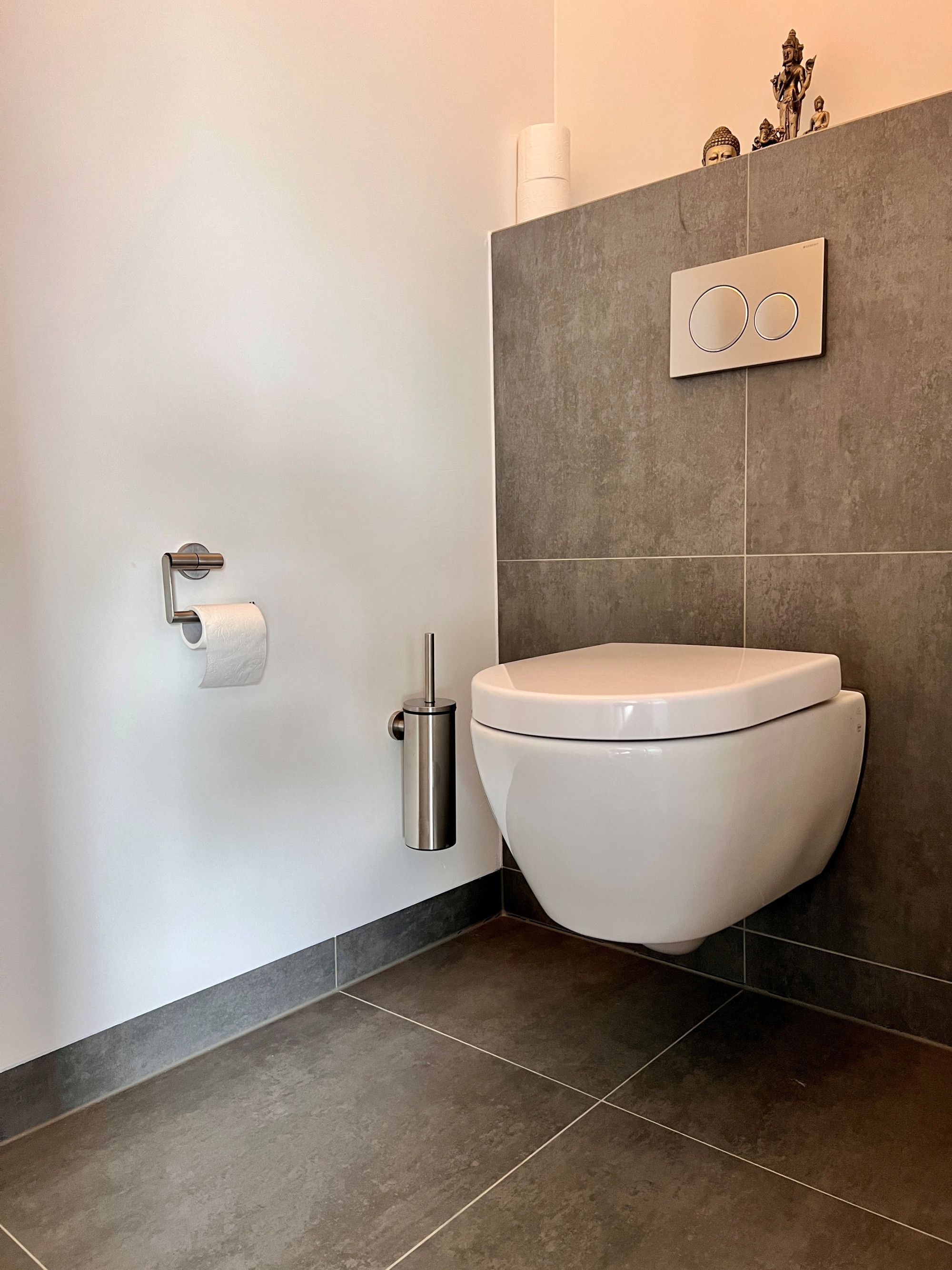Entrance hall with meter cupboard, luxury guest toilet, practical storage under the stairs, and access to both the living room and the first bedroom. The spacious bedroom (approx. 16 m²) includes an en-suite bathroom (approx. 9 m²) with luxury fittings: double sink, bathtub, and large walk-in shower. The guest toilet is also high-end, featuring a wall-mounted toilet and a urinal.