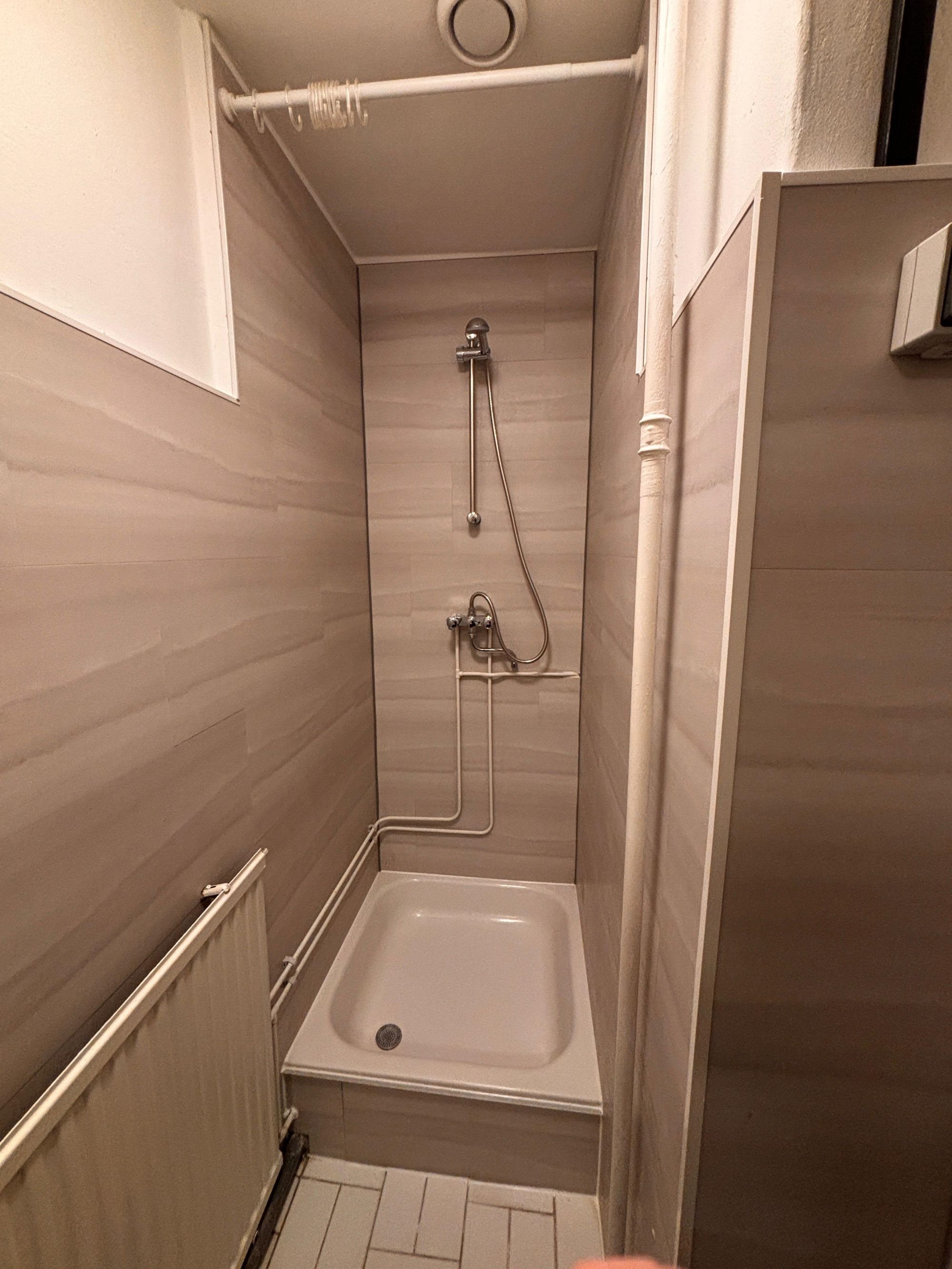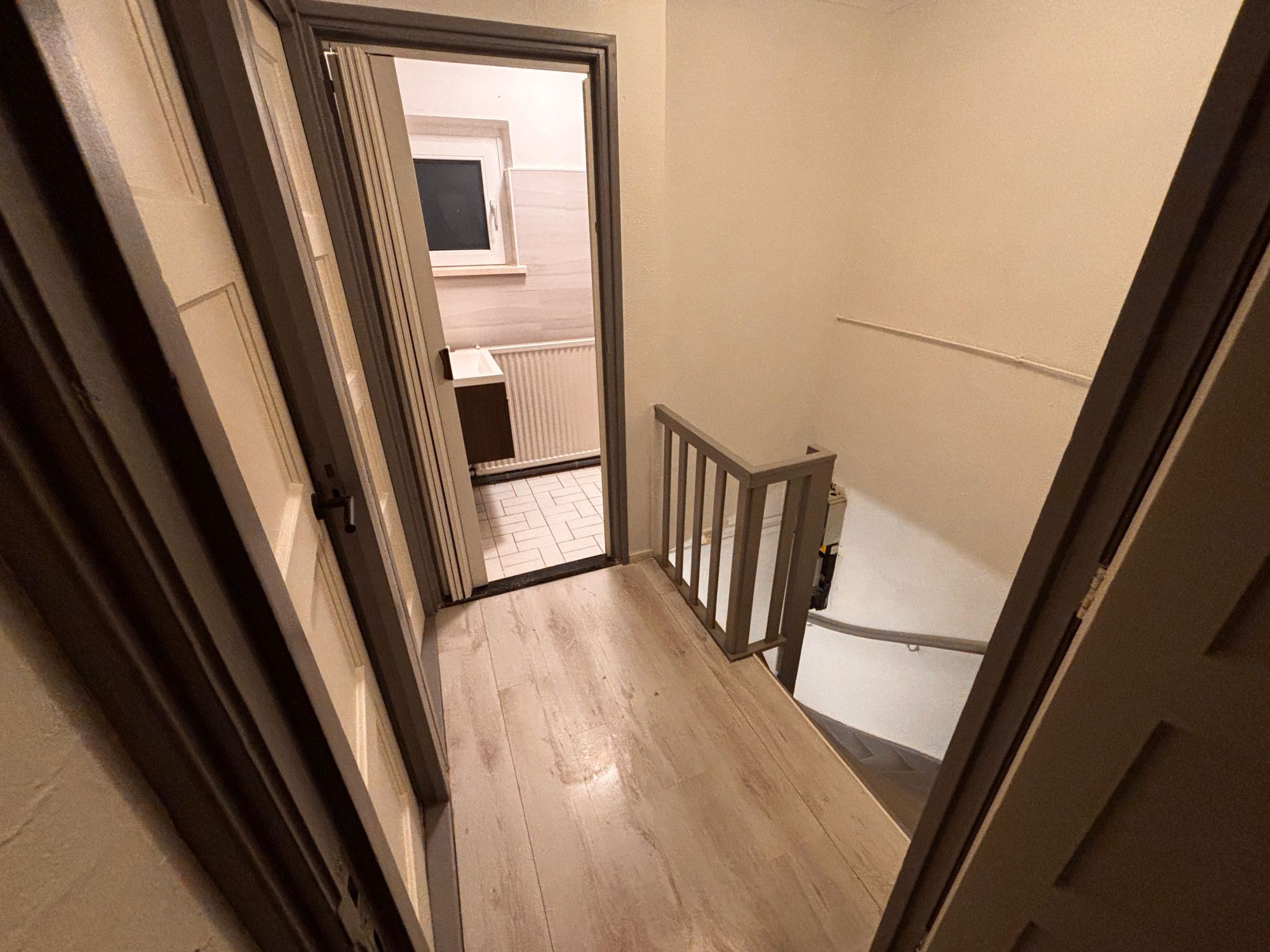 Landing. 3 bedrooms of approx. 12m², 11m², and 6m² respectively. Compact bathroom with fixed sink and shower.