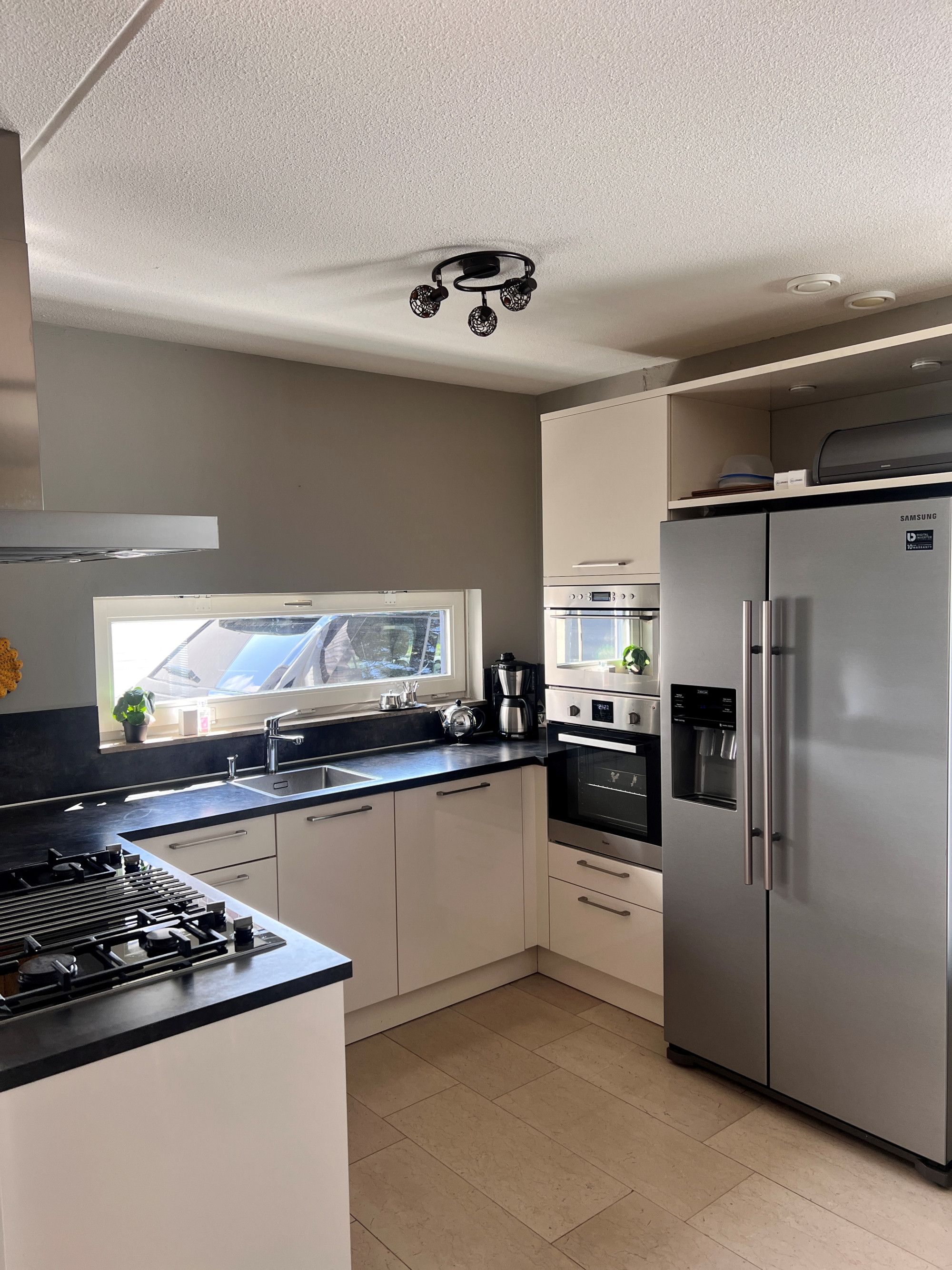 L-shaped living room (36 m²) with open kitchen, fitted with a large fridge-freezer, dishwasher, hob, extractor fan, oven, and combination microwave. The living room, kitchen, and hallway all have a light tiled floor.