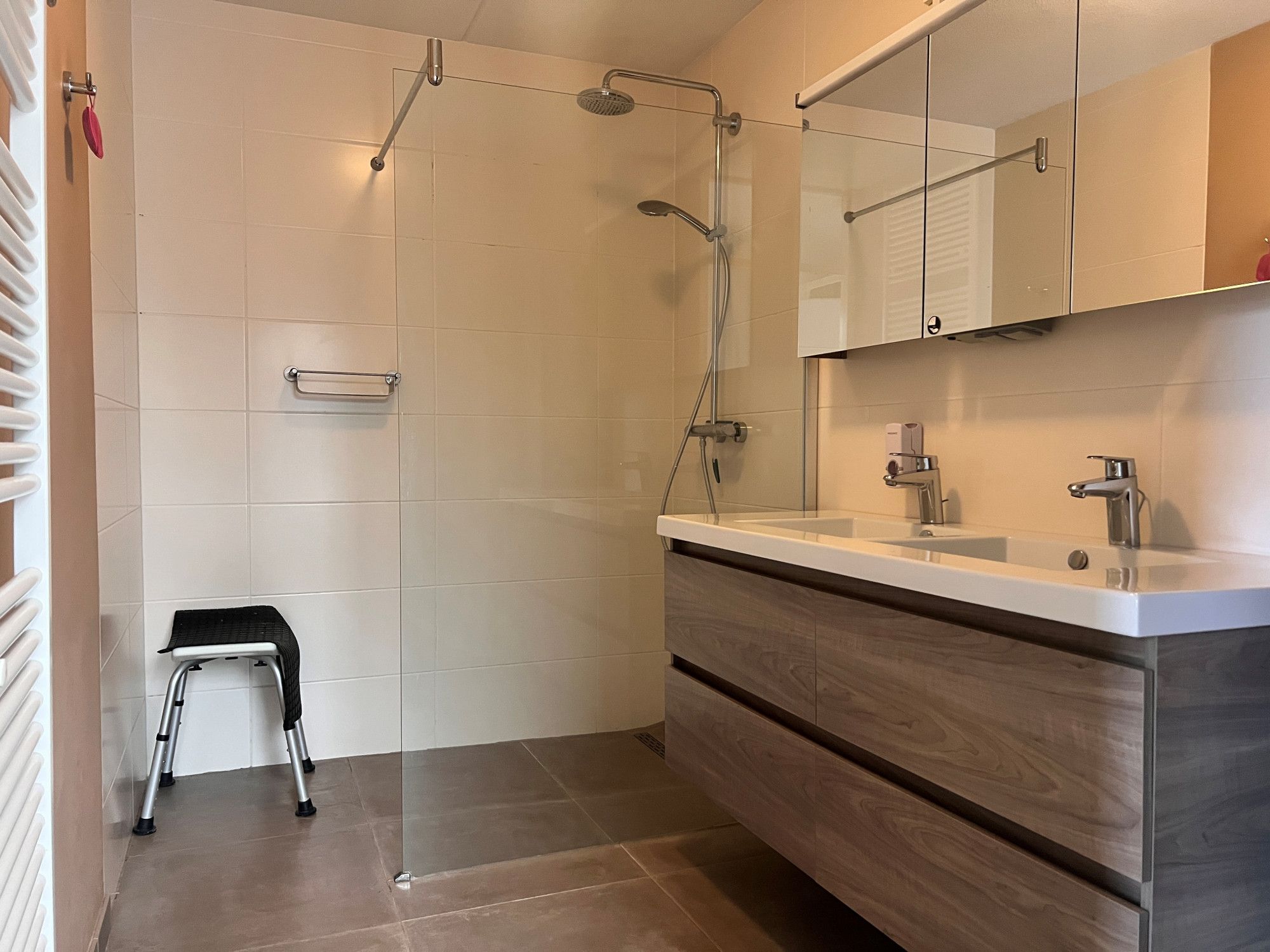 Spacious bathroom (5.5 m²) with toilet, walk-in shower, and washbasin. The first bedroom (15 m²) is also located on the ground floor and offers direct access to the garden.