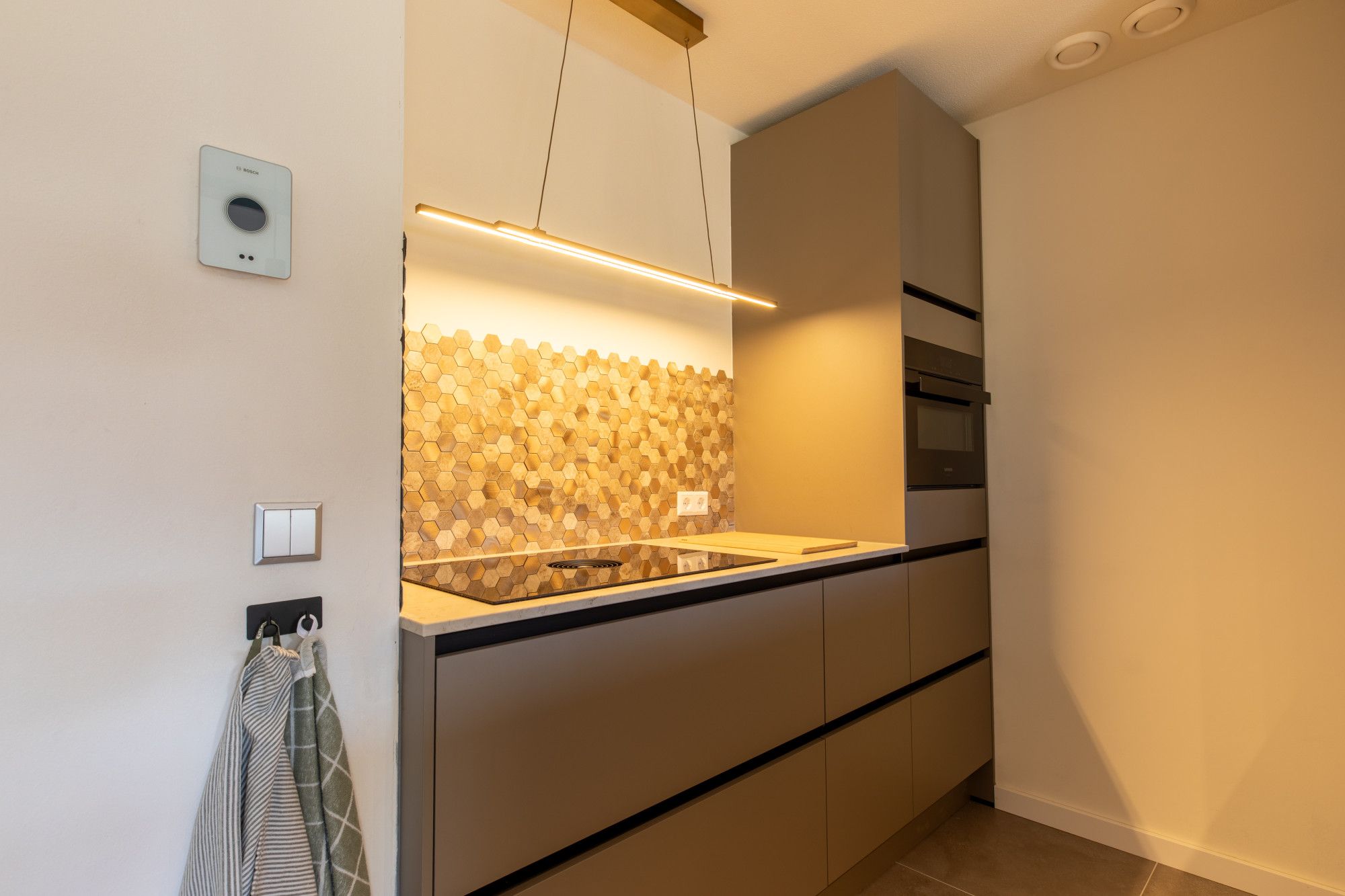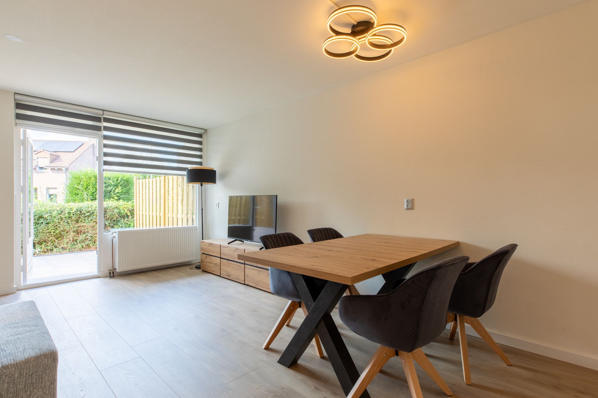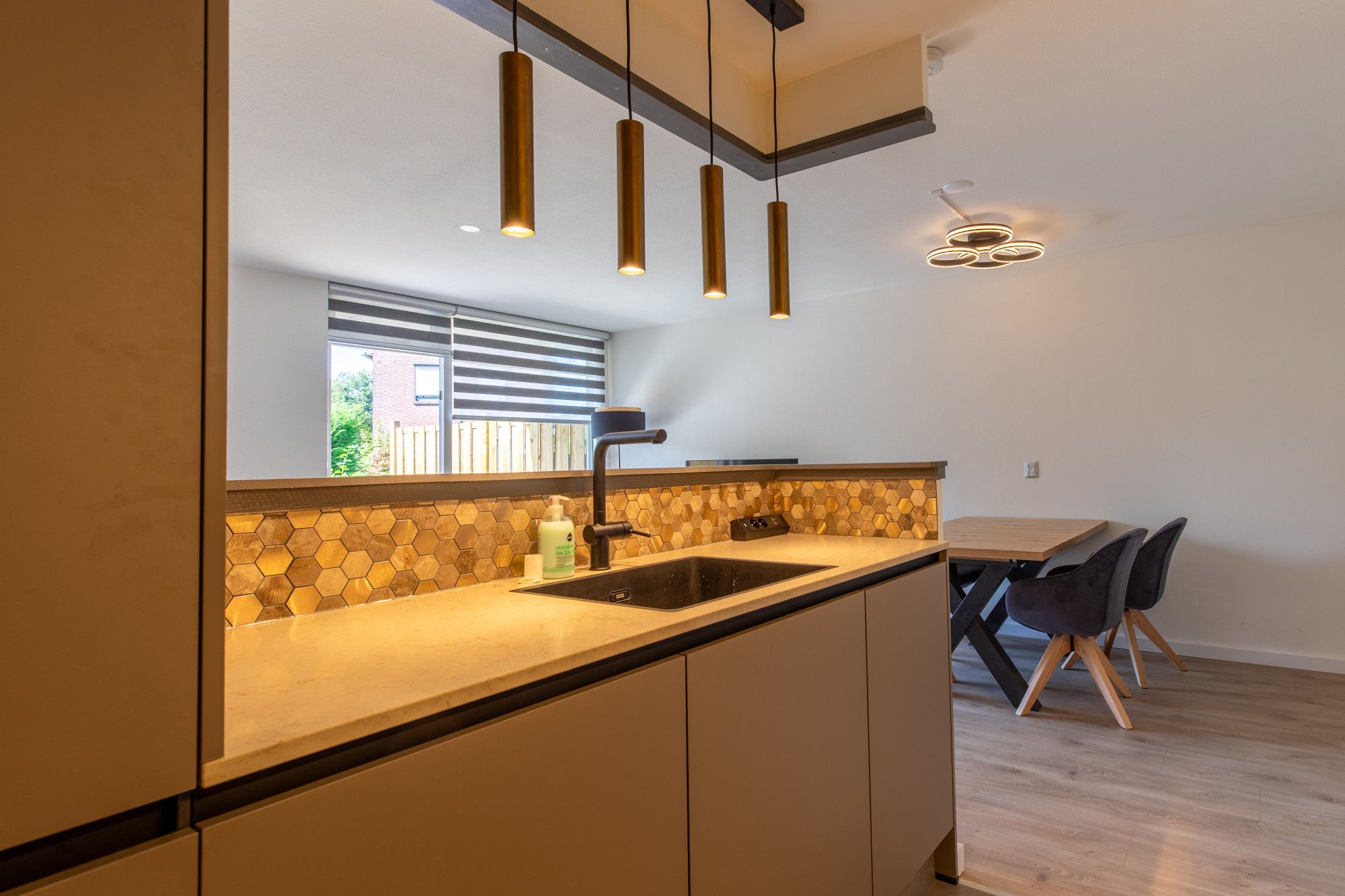 Vanuit de entree toegang tot de hal met doorlopende laminaatvloer, moderne toiletruimte met wandcloset en fonteintje. Woonkamer met open keuken (6.07 x 5.19 m) met luxe keuken installatie in parallel opstelling met composiet werkblad en voldoende kastruimte, inbouwapparatuur te weten: Bora inductie kookplaat met kookveld afzuiging, combi-magnetron, koelkast en vaatwasser. Vanuit de woonkamer toegang tot de omsloten recente betegelde achtertuin/patio met nieuwe tuin afscheiding met poort naar eigen vaste parkeerplaats.