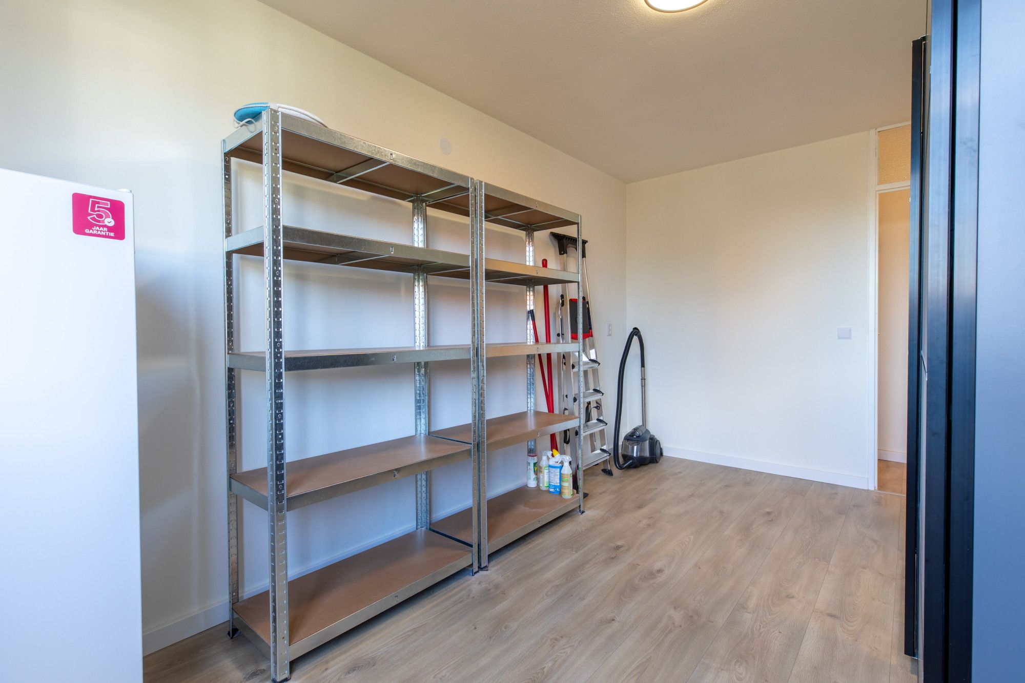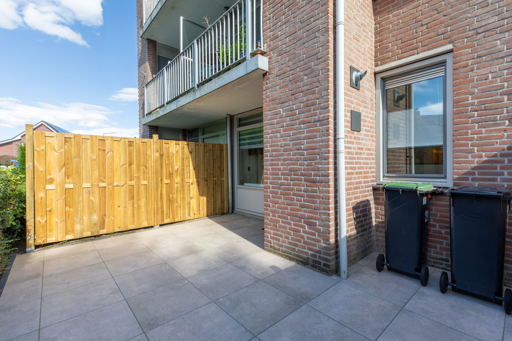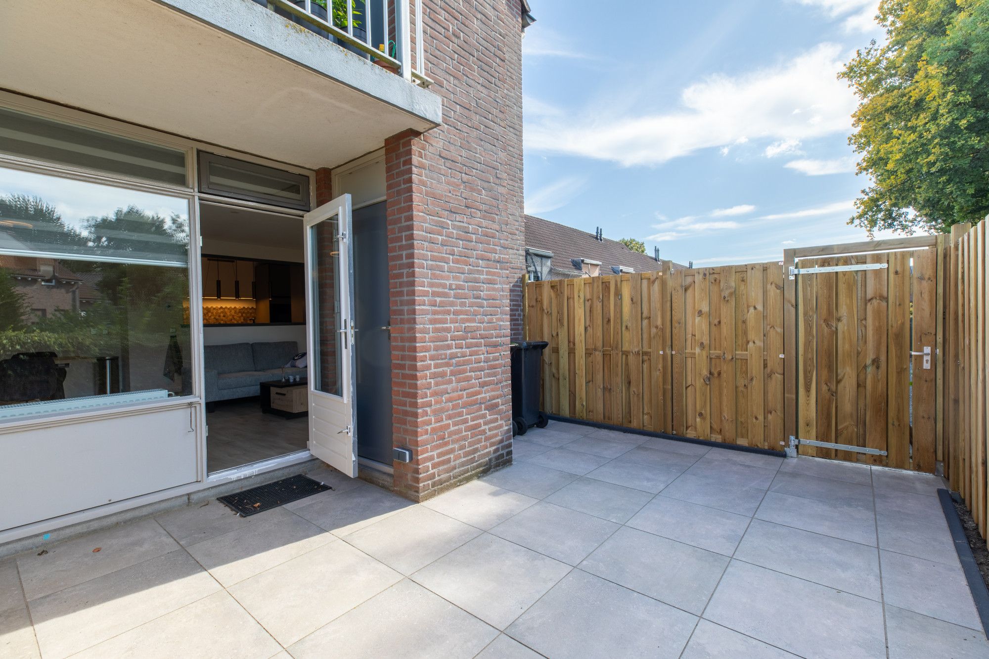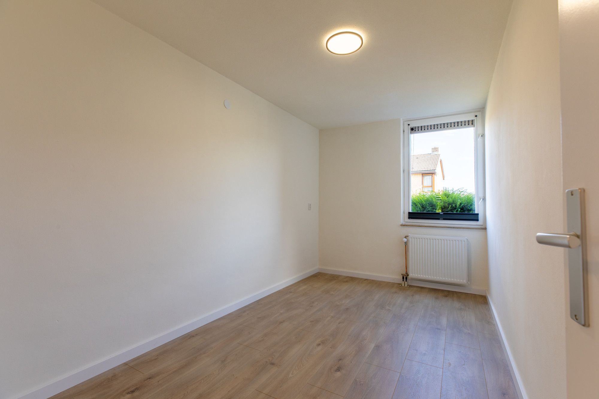 Vanuit de entree toegang tot de hal met doorlopende laminaatvloer, moderne toiletruimte met wandcloset en fonteintje. Woonkamer met open keuken (6.07 x 5.19 m) met luxe keuken installatie in parallel opstelling met composiet werkblad en voldoende kastruimte, inbouwapparatuur te weten: Bora inductie kookplaat met kookveld afzuiging, combi-magnetron, koelkast en vaatwasser. Vanuit de woonkamer toegang tot de omsloten recente betegelde achtertuin/patio met nieuwe tuin afscheiding met poort naar eigen vaste parkeerplaats.