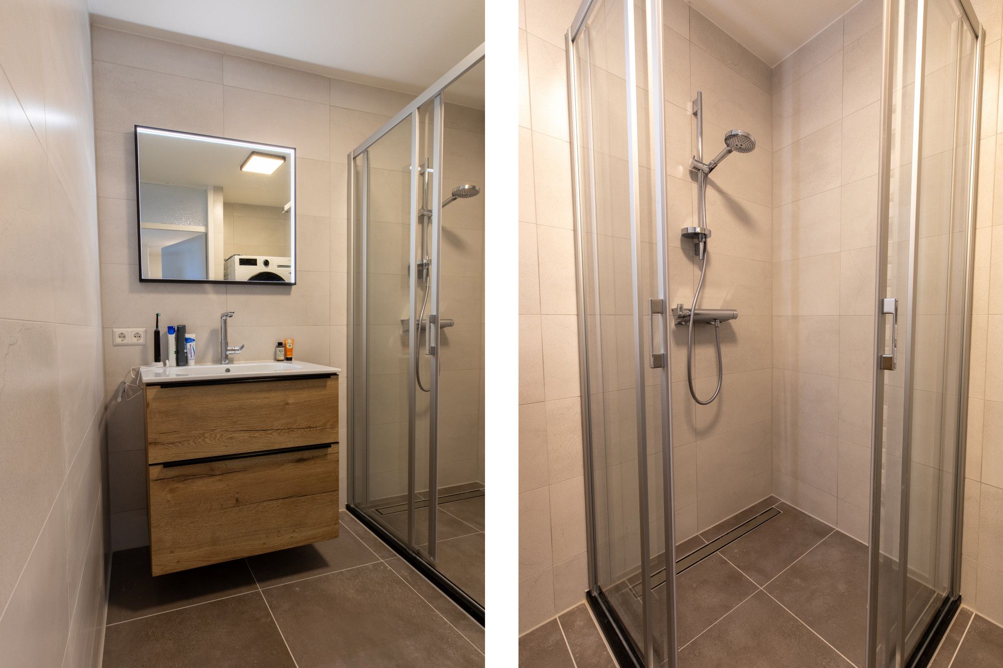 Badkamer met inloopdouche met douchewand, badmeubel met vaste wastafel, design radiator en witgoedaansluiting.