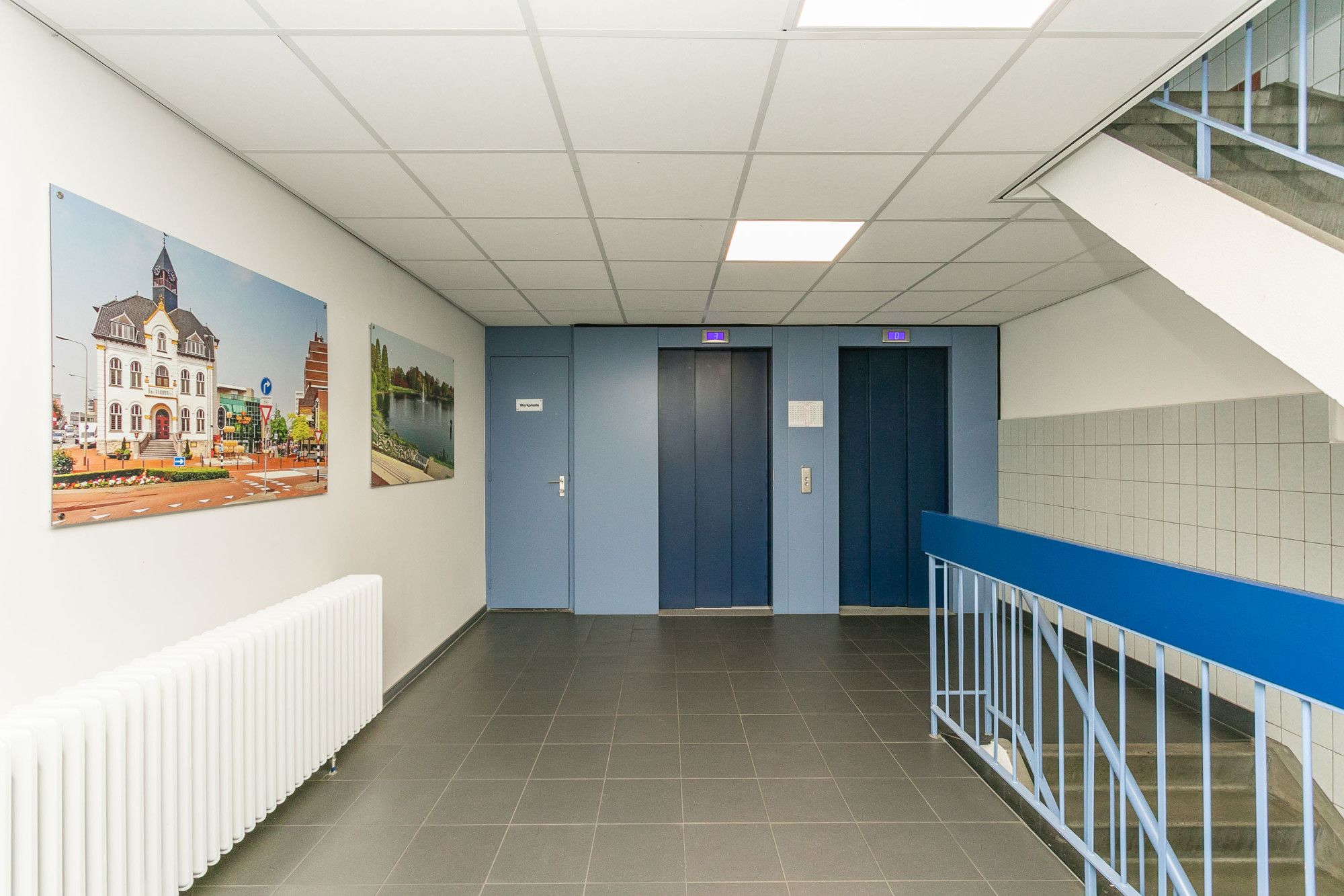 Centrale entree met videofoontableau en brievenbussen, trappenhuis en dubbele liftinstallatie.