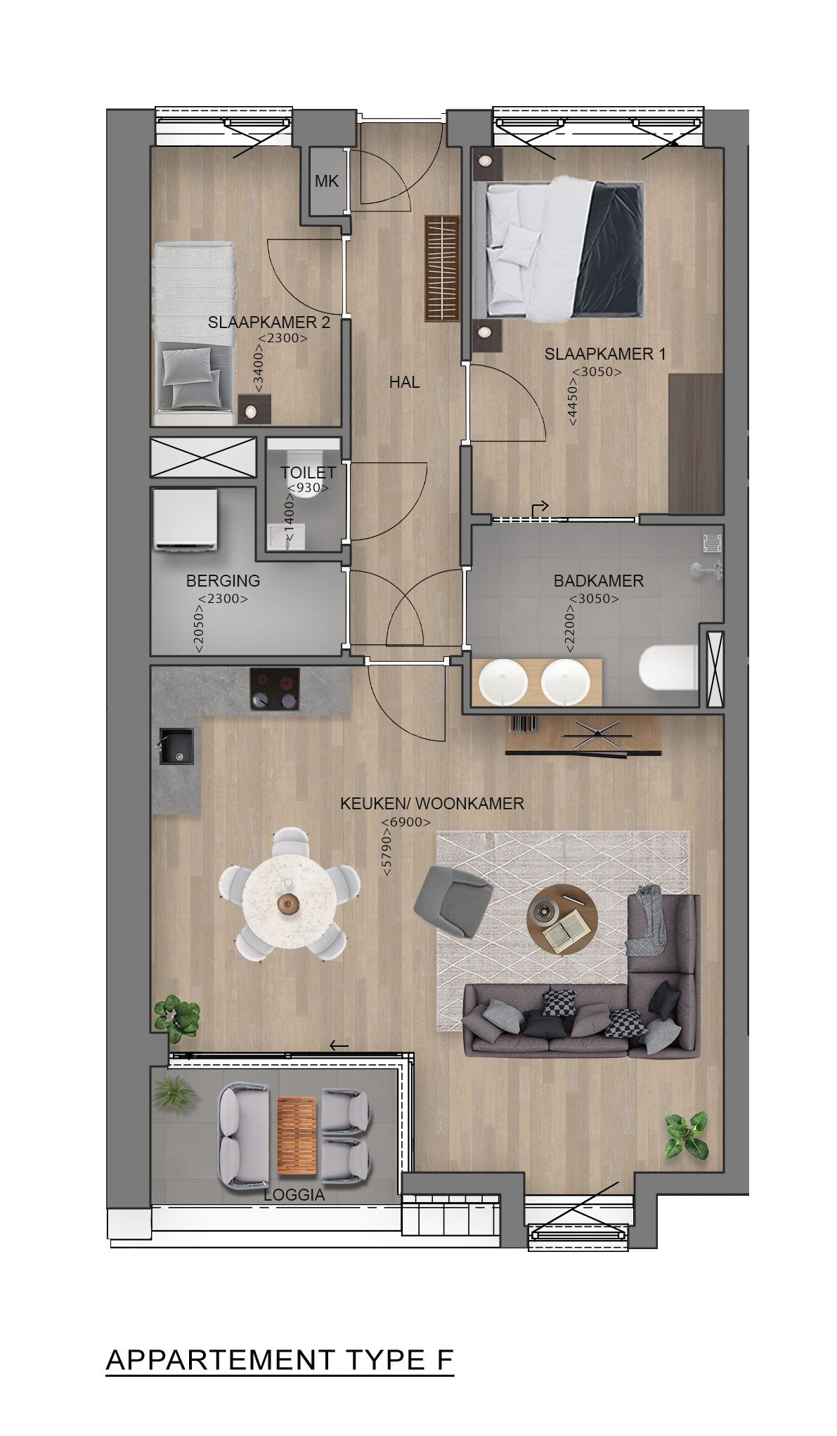 De type F appartementen hebben een ruime living van 38 m2 die bestaat uit een zitgedeelte en een eetgedeelte, met de mogelijkheid deze living te vergroten tot wel 49 m2 . De hoge raampartijen laten een grote hoeveelheid daglicht binnen en de leiden naar het riante overdekte balkon/dakterras.