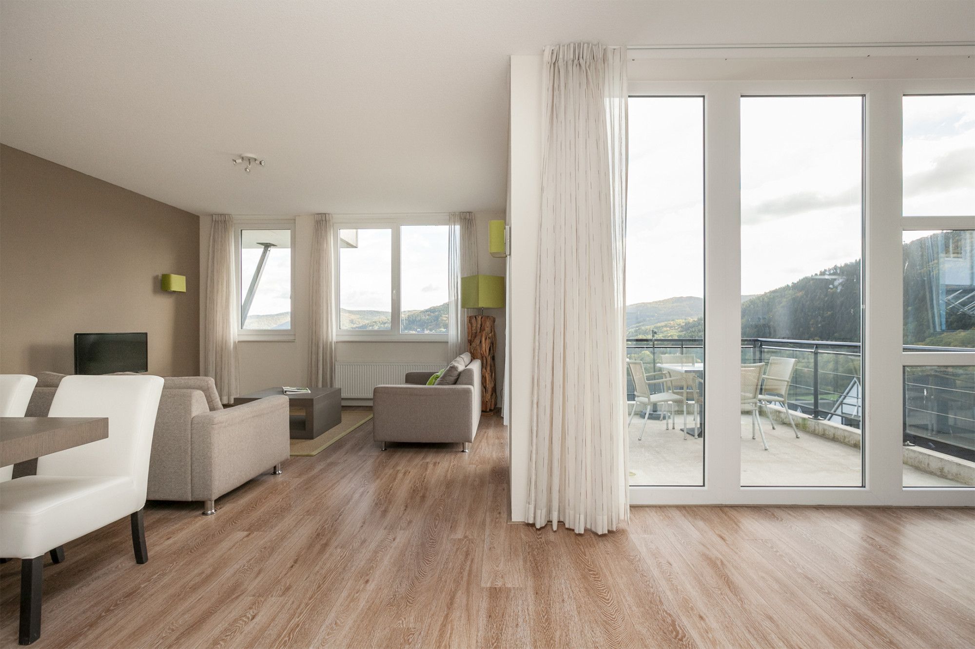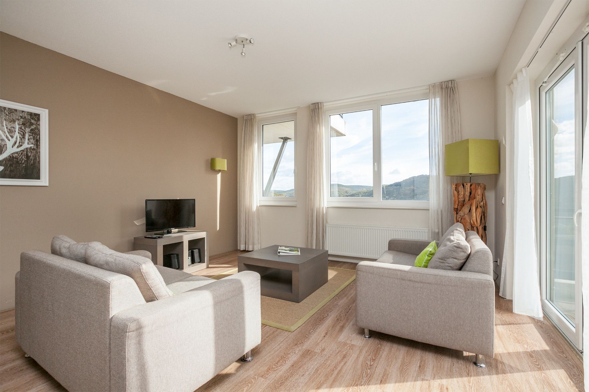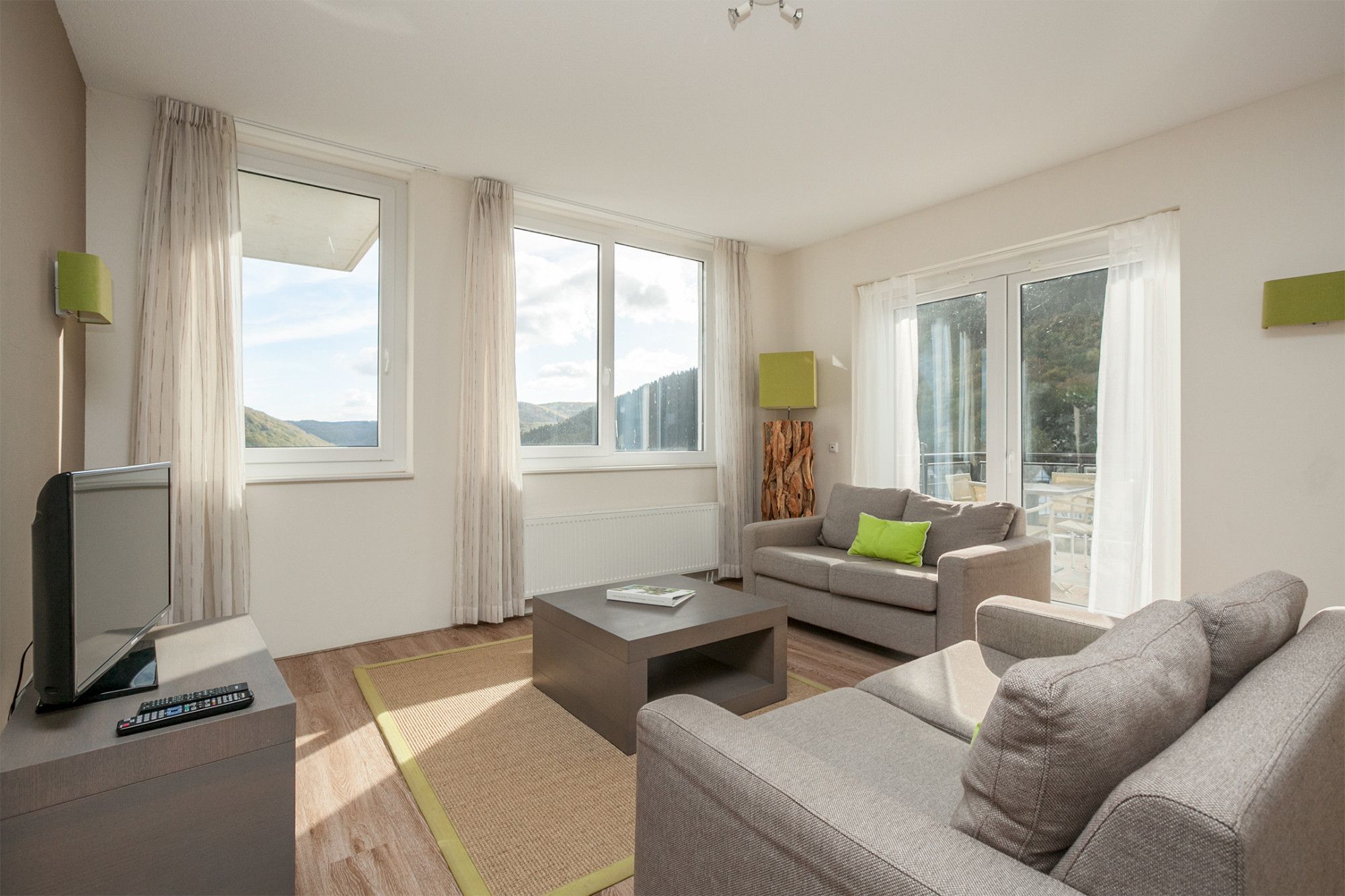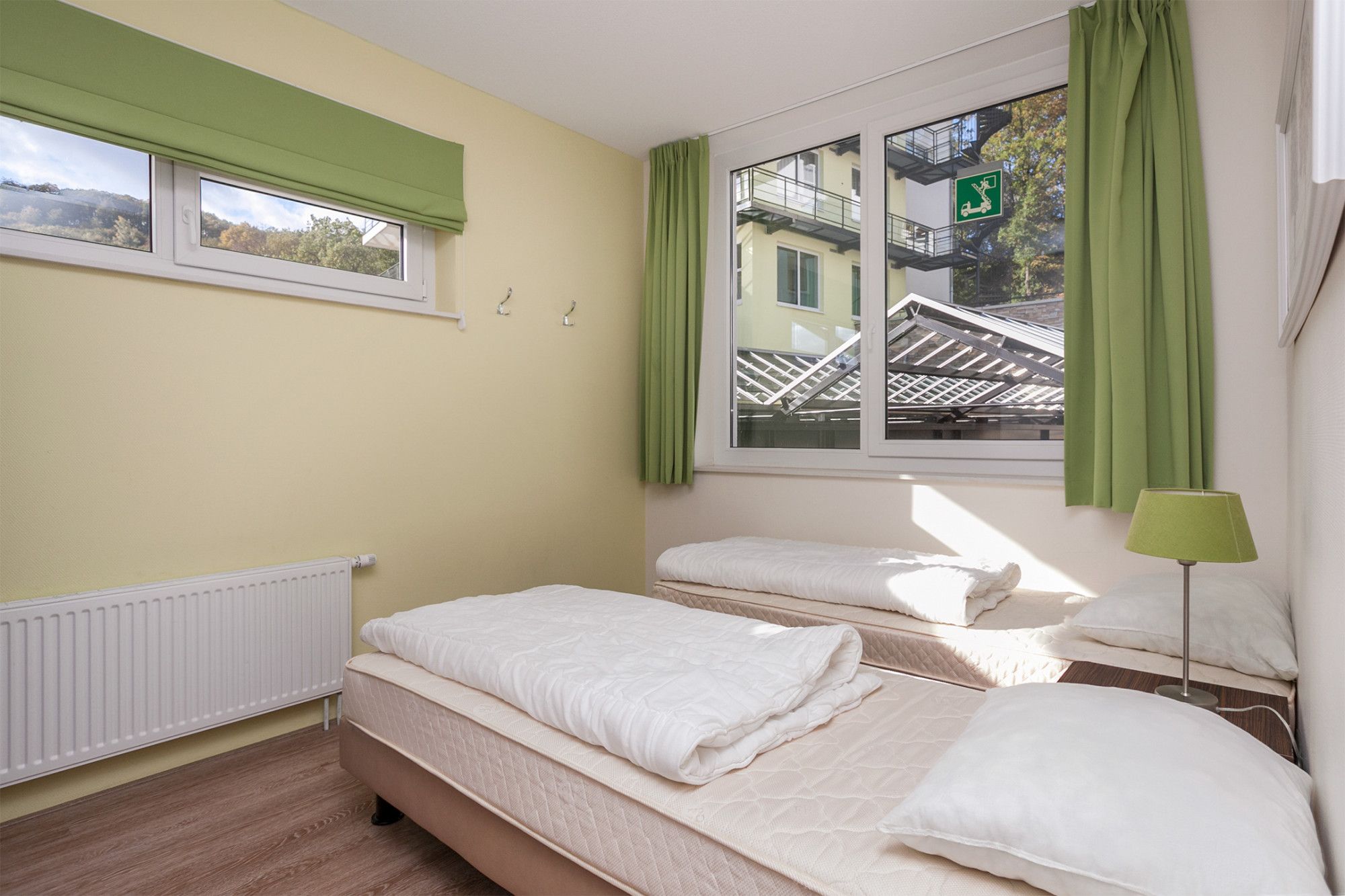 Het mooie appartement op de 2e verdieping bevindt zich in boven het hoofgebouw, centraal gelegen op het park met uitzicht op het prachtige Ruhrdal. Via de lift of trappenhuis in dit gebouw is ook het grote binnenzwembad te bereiken. Het appartement is o.a. ook vanaf de straatzijde via een loopbrug bereikbaar en is dus voor alle leeftijdsgroepen toegankelijk. Het appartement is geschikt voor 4 personen heeft een ruime woonkamer met directe toegang tot het mooie terras met uitzicht op de Ruhr en het dorpje Heimbach. De keuken is uitgerust met diverse apparatuur, zoals een magnetron en een vaatwasser. Daarnaast beschikt de accommodatie over 2 ruime slaapkamers, een badkamer met een wastafel, een inloopdouche en een sauna. Bij de woonkamer is er een eigen berging en er is een apart toilet in de hal. op de 1e etage van het gebouw is er een aparte berging voor dit appartement. Het appartement is voorzien van laminaatvloeren en glasvezelbehang.