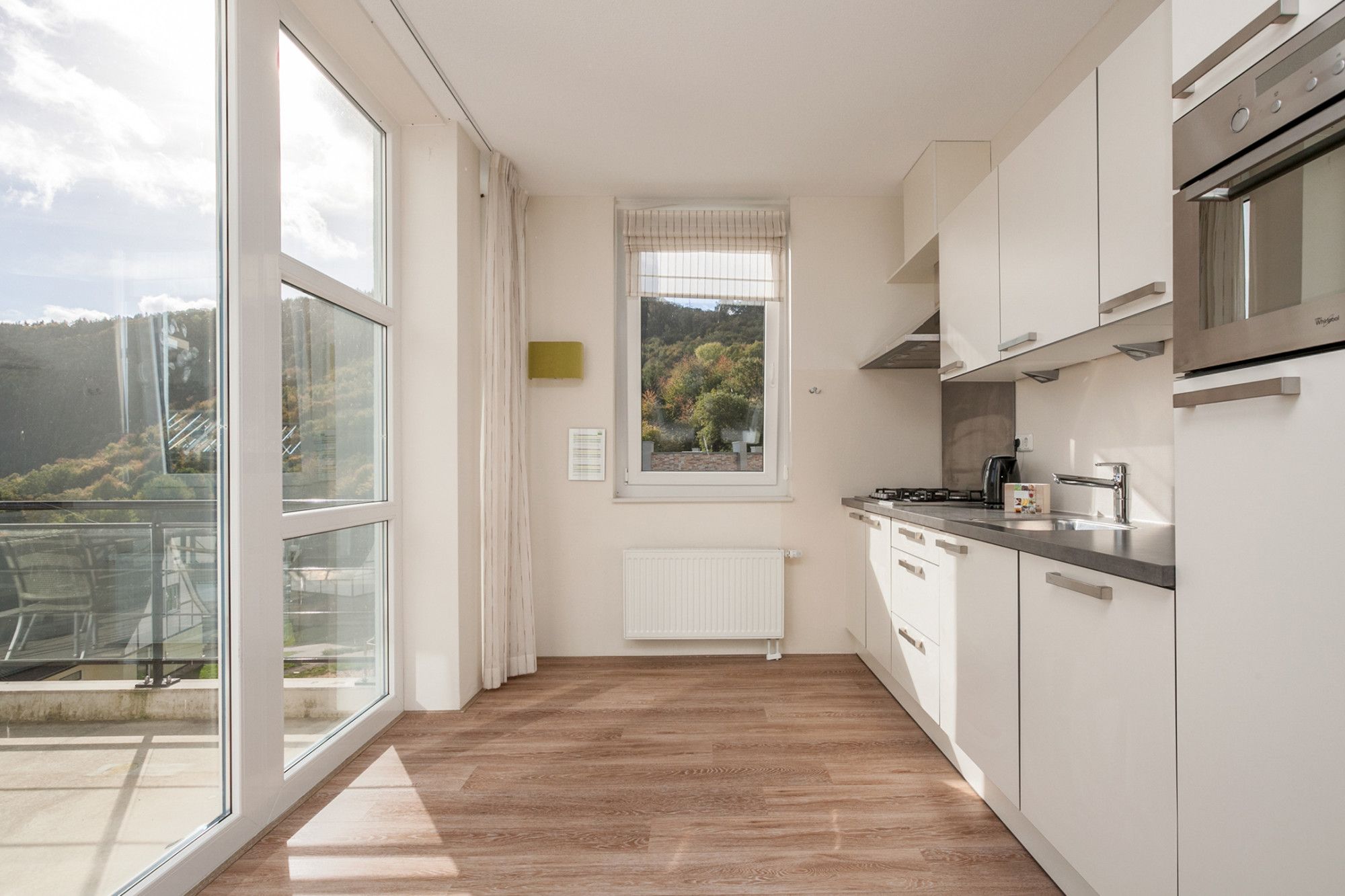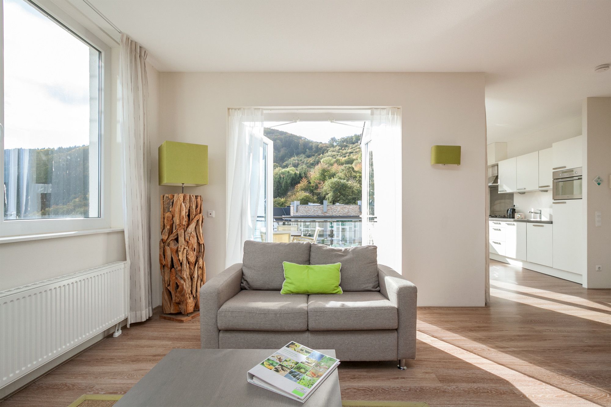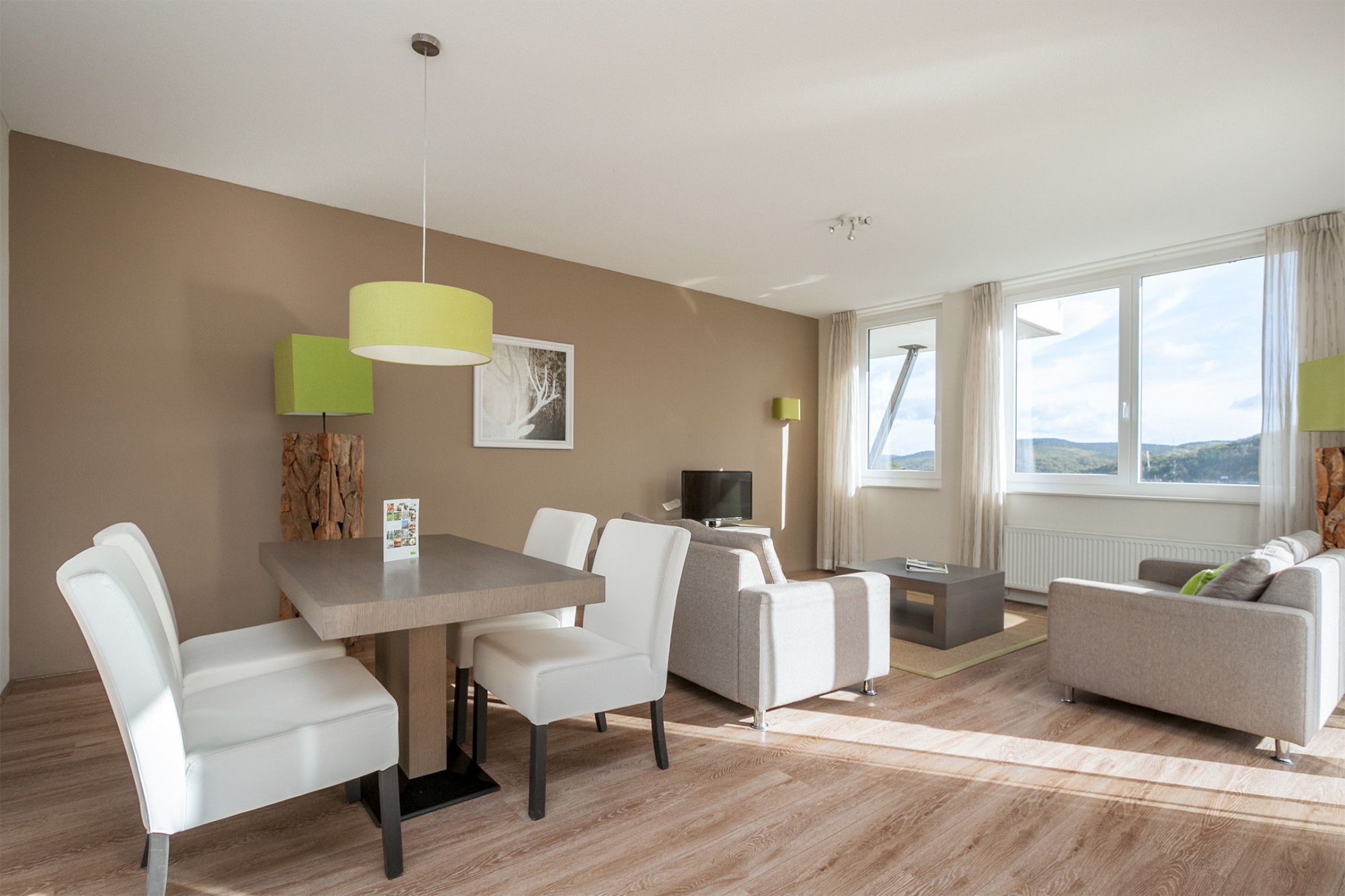 Het mooie appartement op de 2e verdieping bevindt zich in boven het hoofgebouw, centraal gelegen op het park met uitzicht op het prachtige Ruhrdal. Via de lift of trappenhuis in dit gebouw is ook het grote binnenzwembad te bereiken. Het appartement is o.a. ook vanaf de straatzijde via een loopbrug bereikbaar en is dus voor alle leeftijdsgroepen toegankelijk. Het appartement is geschikt voor 4 personen heeft een ruime woonkamer met directe toegang tot het mooie terras met uitzicht op de Ruhr en het dorpje Heimbach. De keuken is uitgerust met diverse apparatuur, zoals een magnetron en een vaatwasser. Daarnaast beschikt de accommodatie over 2 ruime slaapkamers, een badkamer met een wastafel, een inloopdouche en een sauna. Bij de woonkamer is er een eigen berging en er is een apart toilet in de hal. op de 1e etage van het gebouw is er een aparte berging voor dit appartement. Het appartement is voorzien van laminaatvloeren en glasvezelbehang.