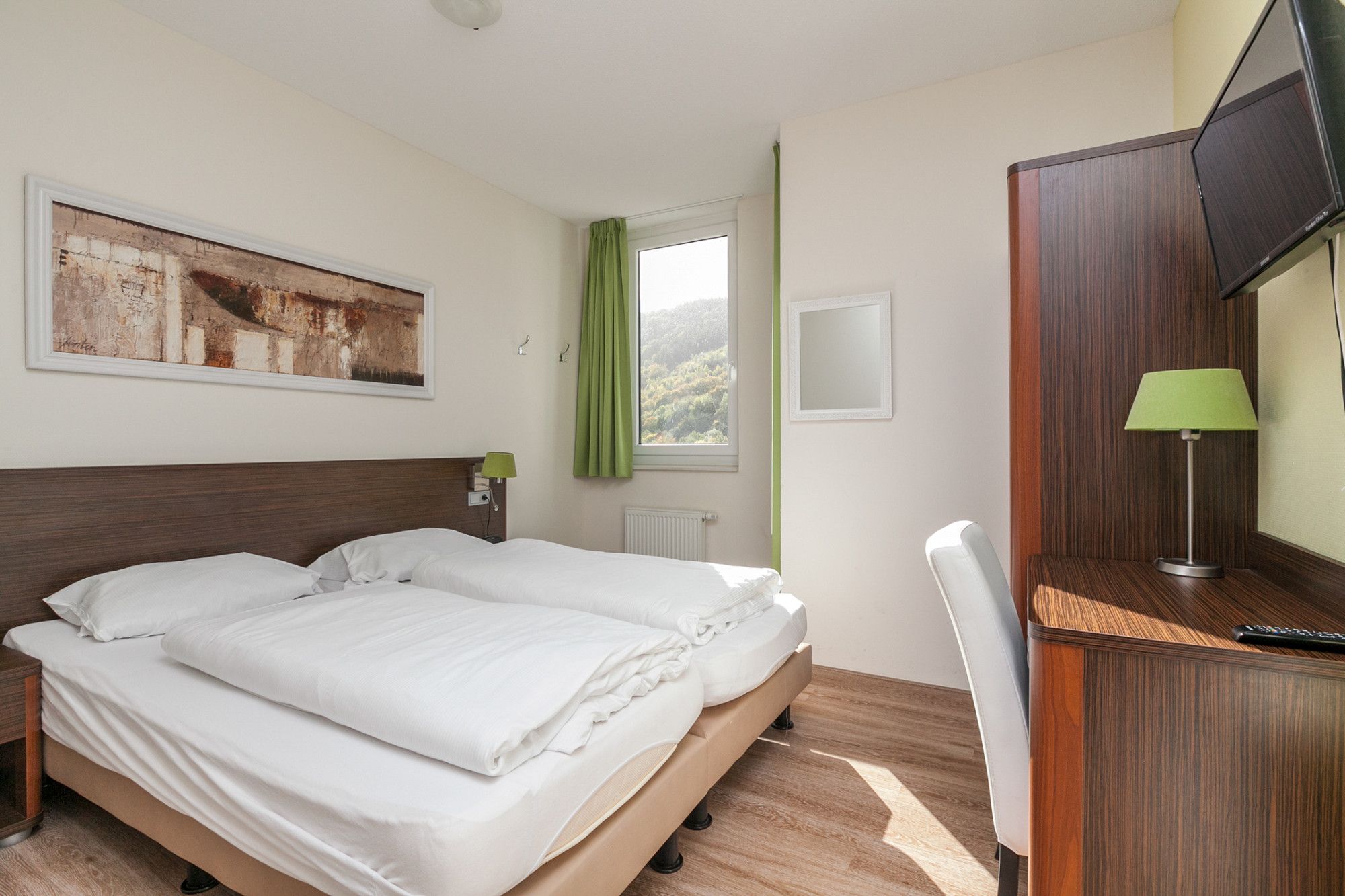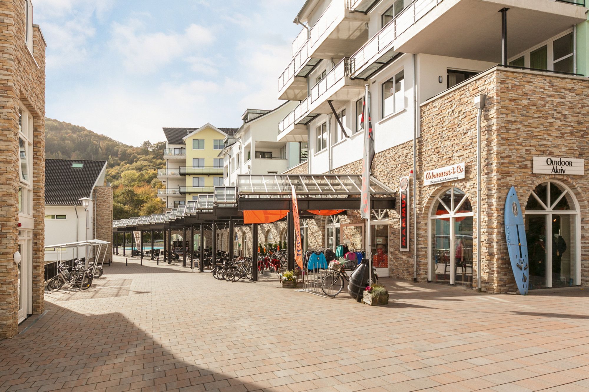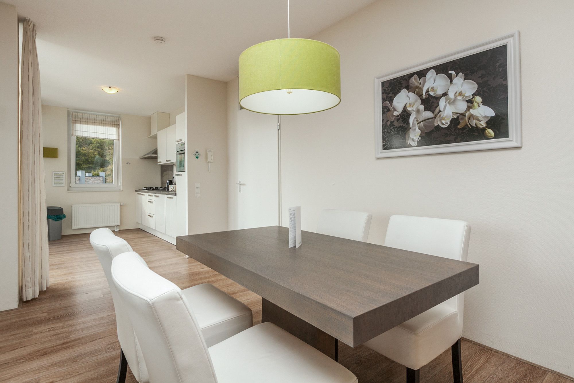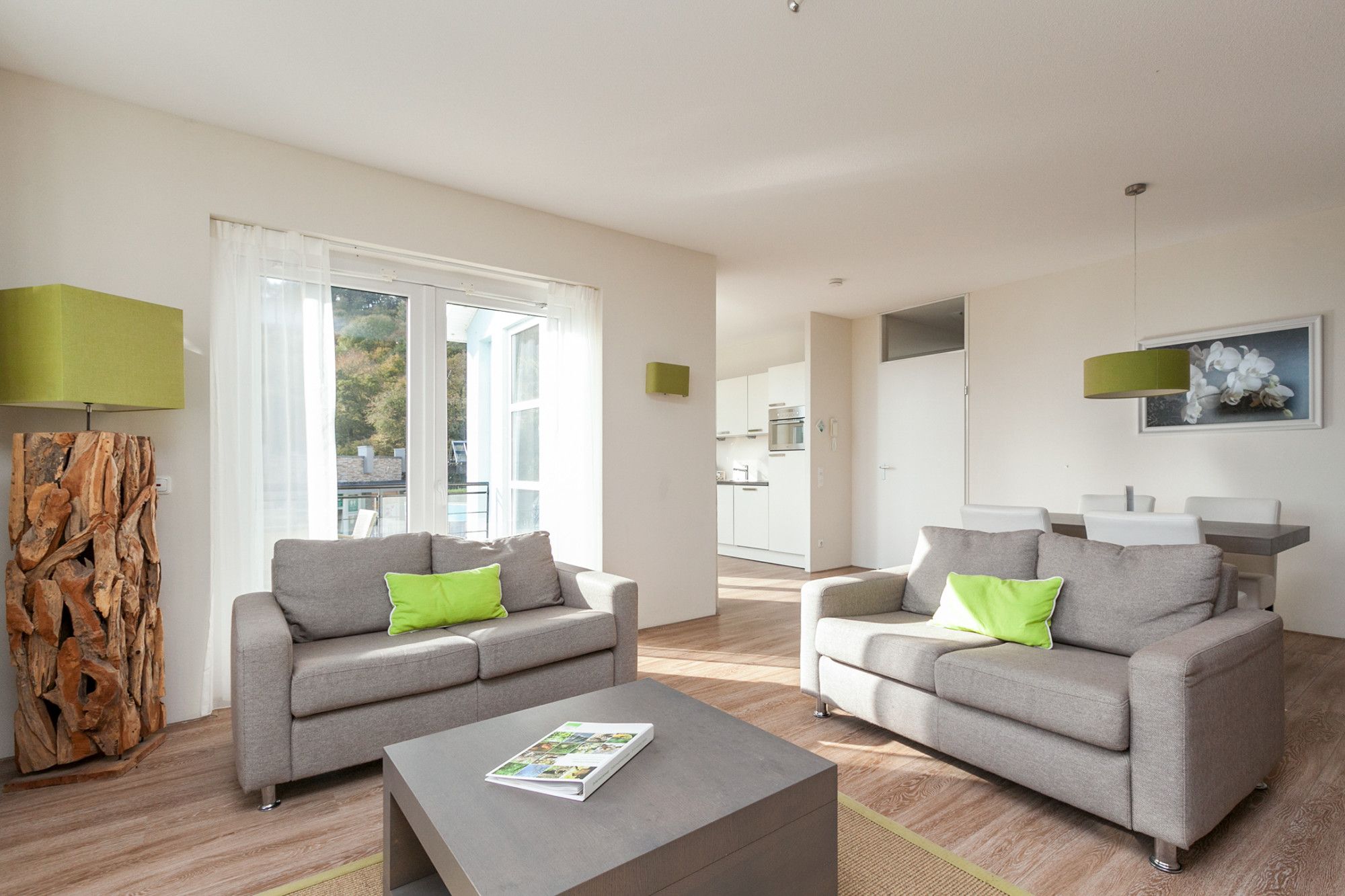 Het mooie appartement op de 2e verdieping bevindt zich in boven het hoofgebouw, centraal gelegen op het park met uitzicht op het prachtige Ruhrdal. Via de lift of trappenhuis in dit gebouw is ook het grote binnenzwembad te bereiken. Het appartement is o.a. ook vanaf de straatzijde via een loopbrug bereikbaar en is dus voor alle leeftijdsgroepen toegankelijk. Het appartement is geschikt voor 4 personen heeft een ruime woonkamer met directe toegang tot het mooie terras met uitzicht op de Ruhr en het dorpje Heimbach. De keuken is uitgerust met diverse apparatuur, zoals een magnetron en een vaatwasser. Daarnaast beschikt de accommodatie over 2 ruime slaapkamers, een badkamer met een wastafel, een inloopdouche en een sauna. Bij de woonkamer is er een eigen berging en er is een apart toilet in de hal. op de 1e etage van het gebouw is er een aparte berging voor dit appartement. Het appartement is voorzien van laminaatvloeren en glasvezelbehang.