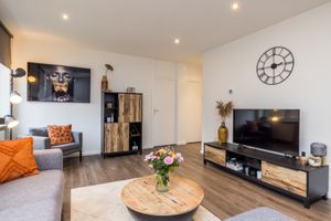 De moderne ruime woonkamer met open (leef)keuken beschikt over veel lichtinval. De witte hoogglans keuken beschikt over een keramische kookplaat, koelkast, diepvries, afzuigkap, oven en vaatwasser. Tevens is in de keuken de airconditioning gesitueerd (2023).