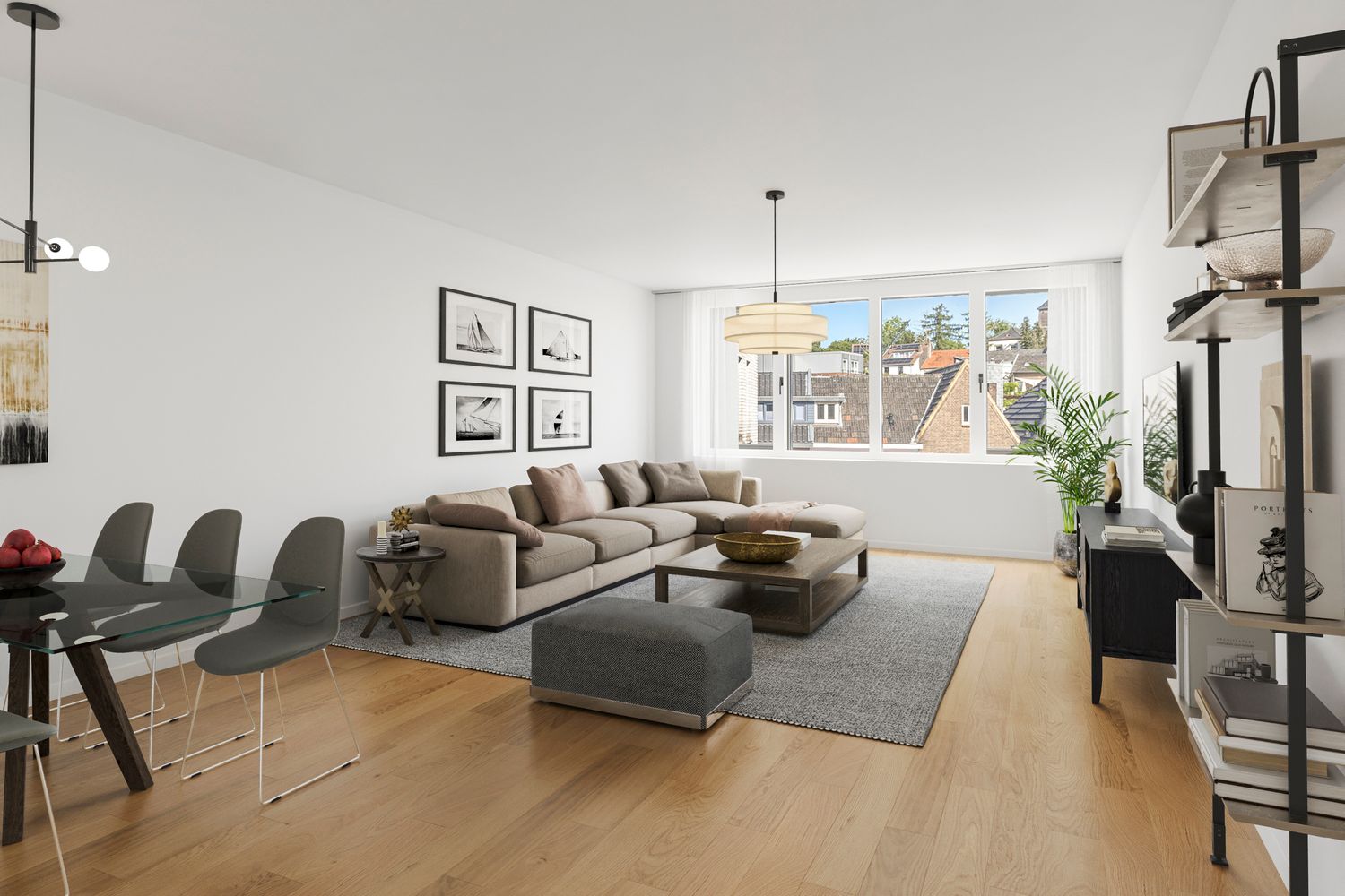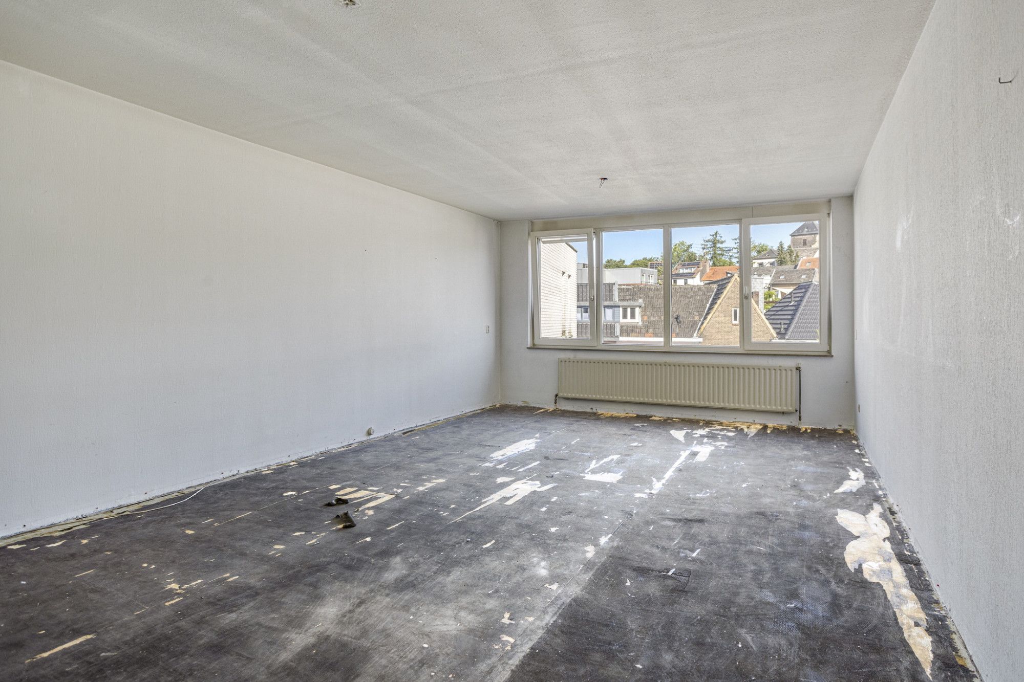 Woonkamer (circa 6,93 x 4,18 m) met uitzicht op het plein aan de Looierstraat.