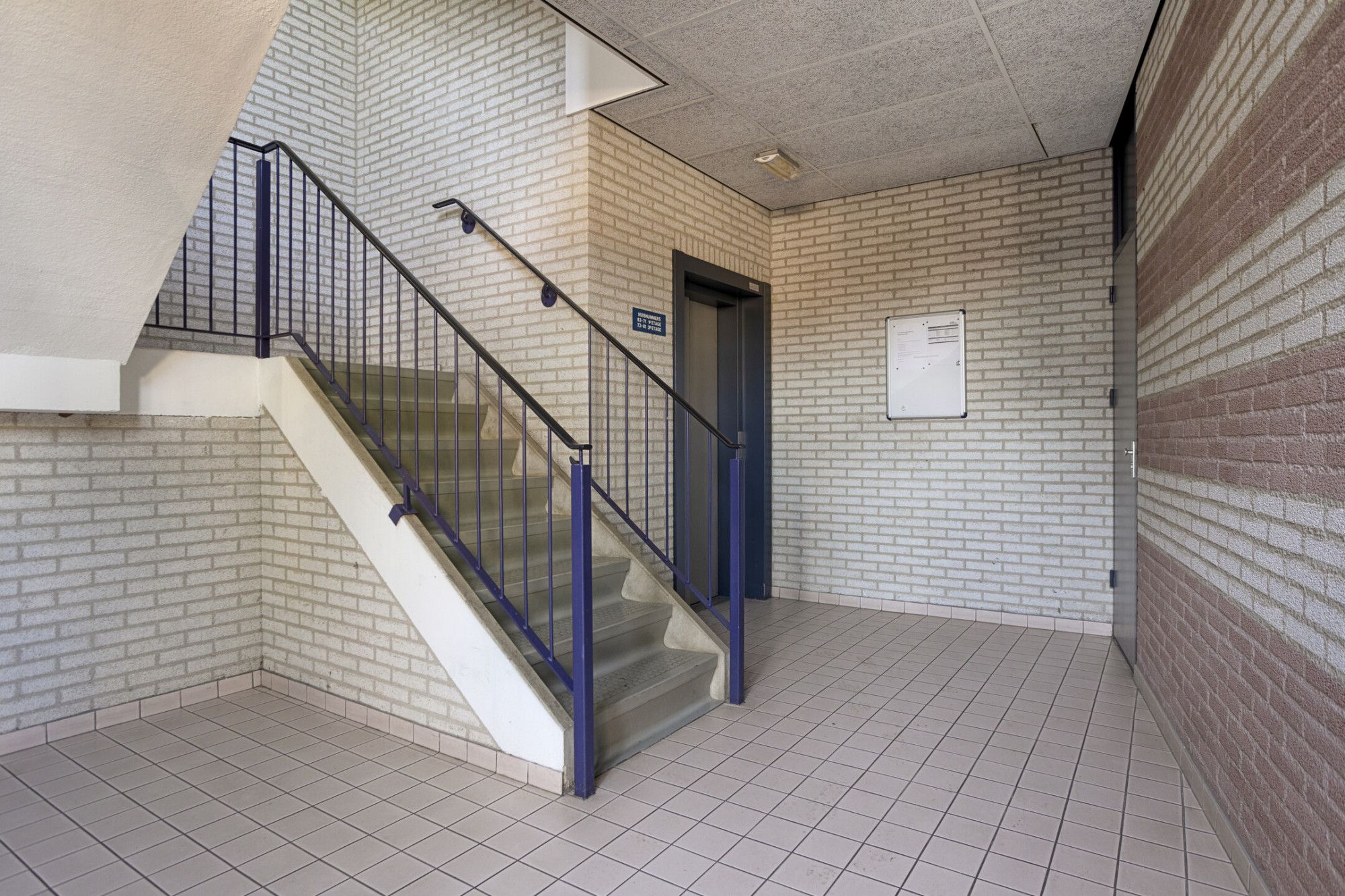 Centrale hal met brievenbussen, bellentableau, intercom, trappenhuis en lift.