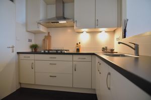 De open keuken (2,42 m x 2,11 m) is v.v. installatie en apparatuur; 4- pits gaskookplaat, afzuigkap, combi- oven en koelkast. De berging is vanuit de keuken te bereiken alwaar aansluitingen cv-ketel en witgoedapparatuur.