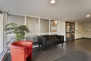 Centrale entreehal met brievenbussen, bellentableau, intercominstallatie, trappenhuis en liftinstallatie.