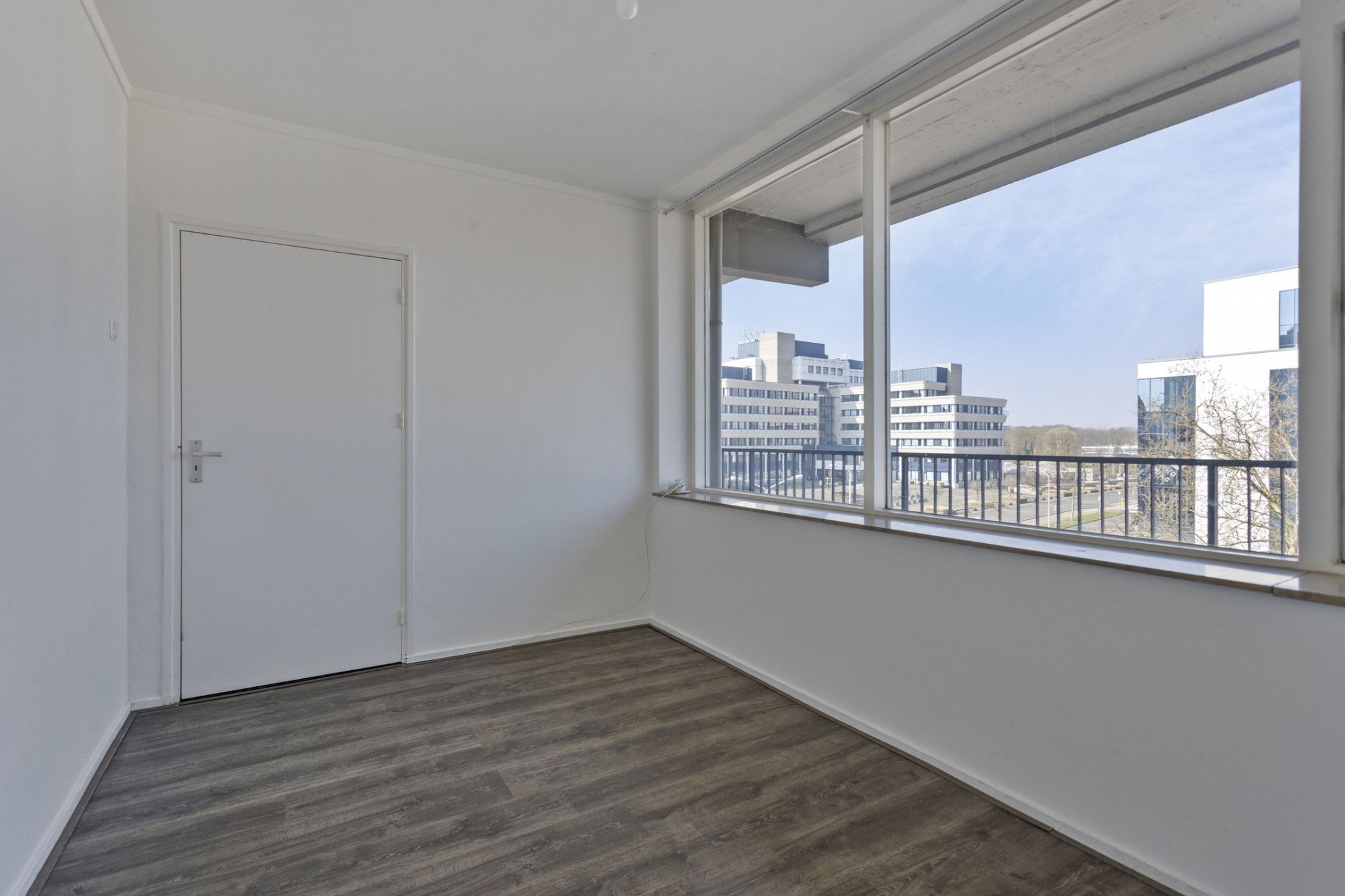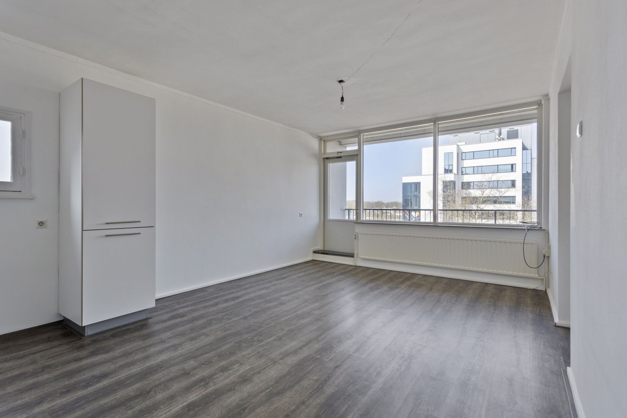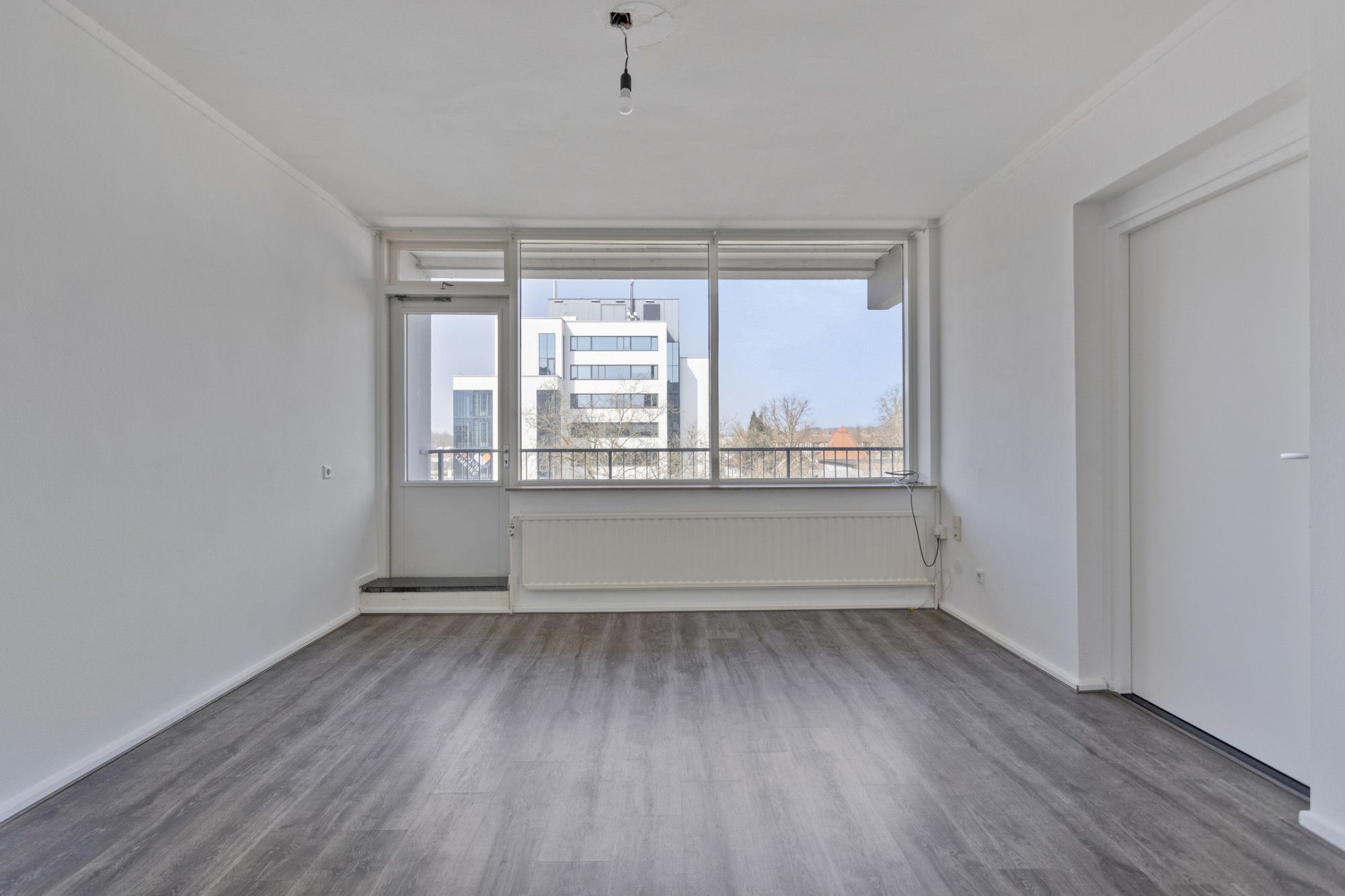 Lichte woonkamer met toegang tot het balkon. Vanuit de woonkamer toegang tot de slaapkamer.