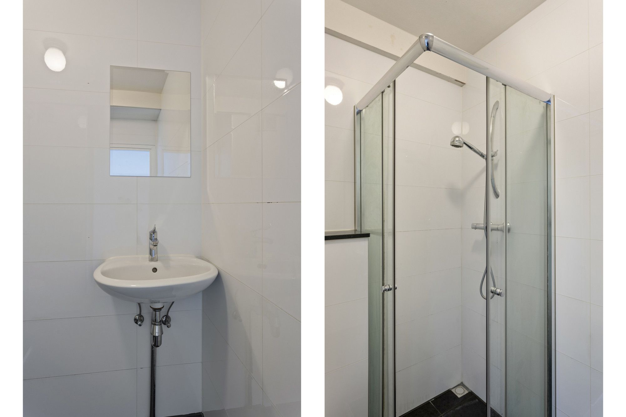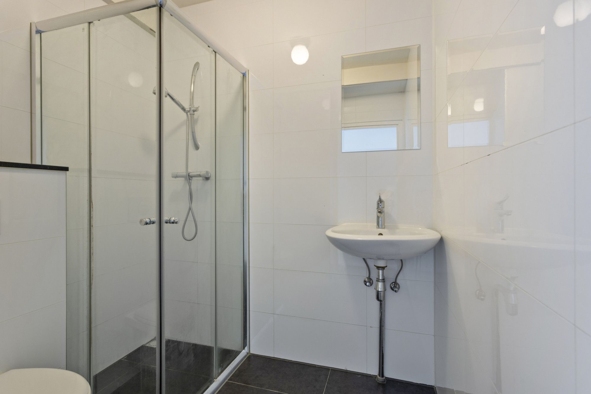Badkamer met douche, toilet en vaste wastafel.