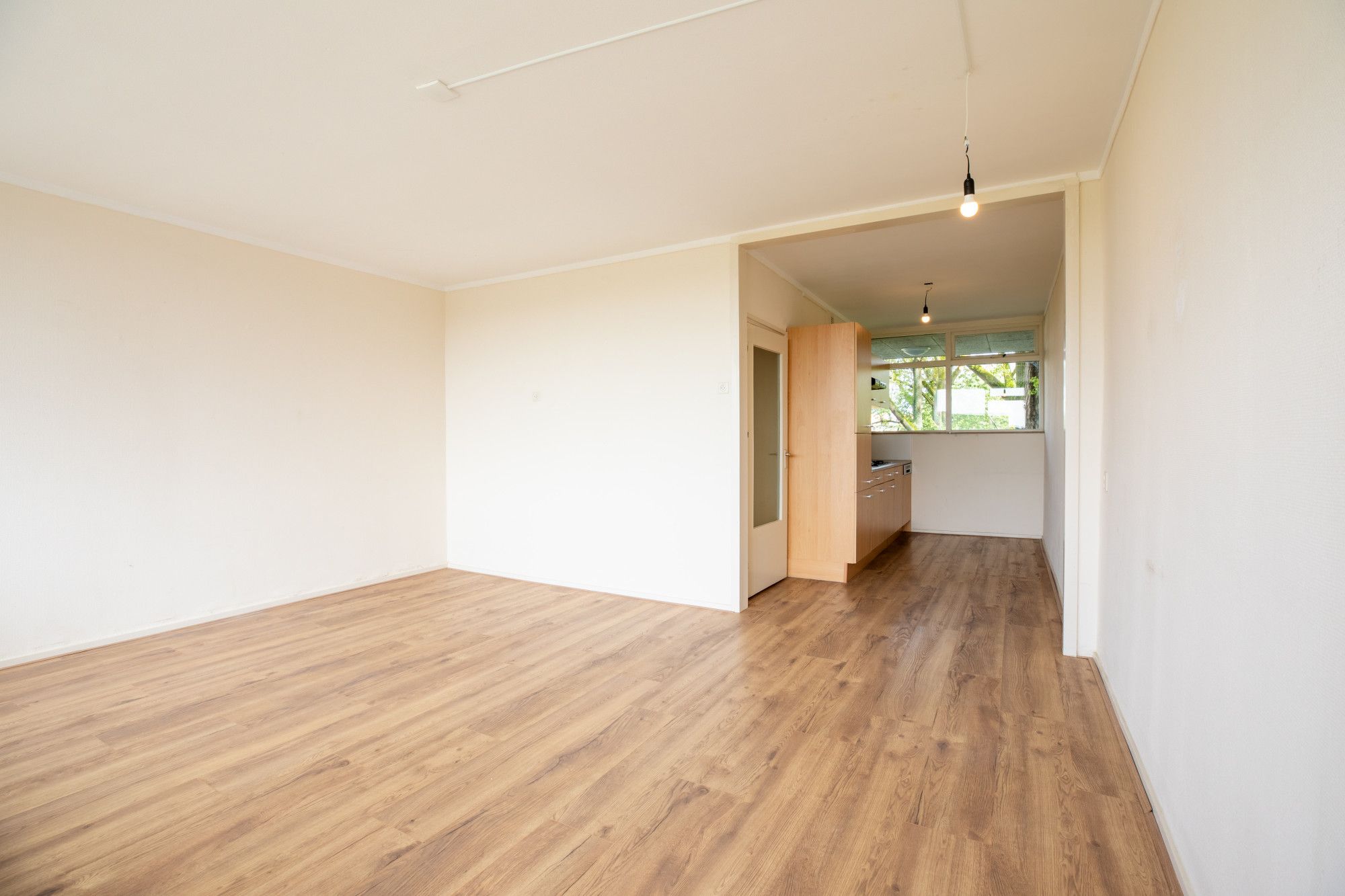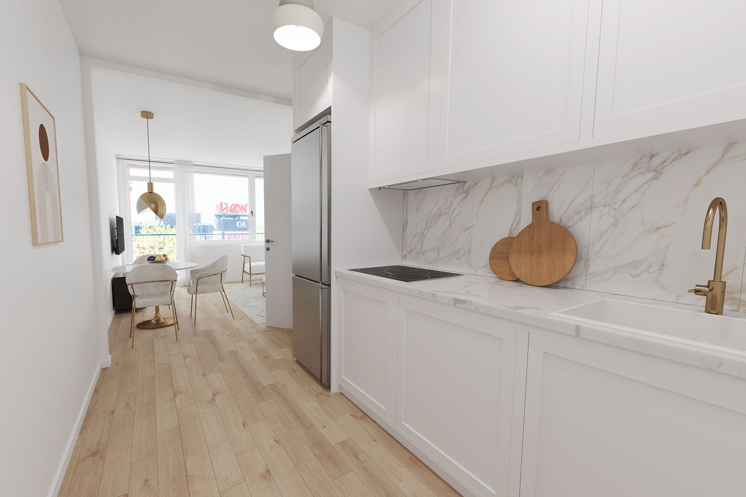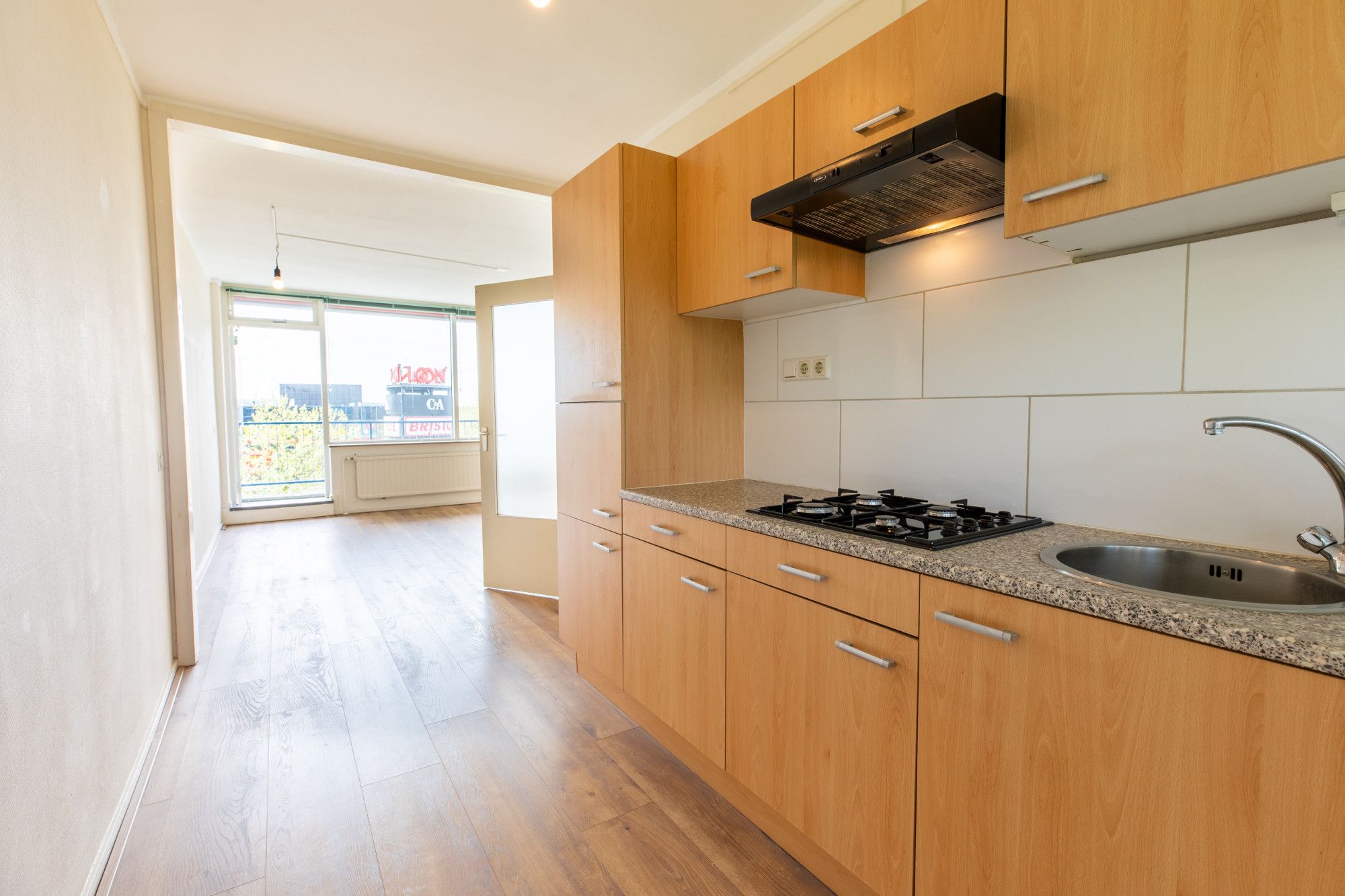 Lichte woonkamer (4.97 x 4.25 m) met vrij zicht met toegang tot het balkon (10.17 x 1.25 m) in open verbinding met keuken (4.15 x 2.07 m) met keukeninstallatie met diverse onder- en bovenkasten.