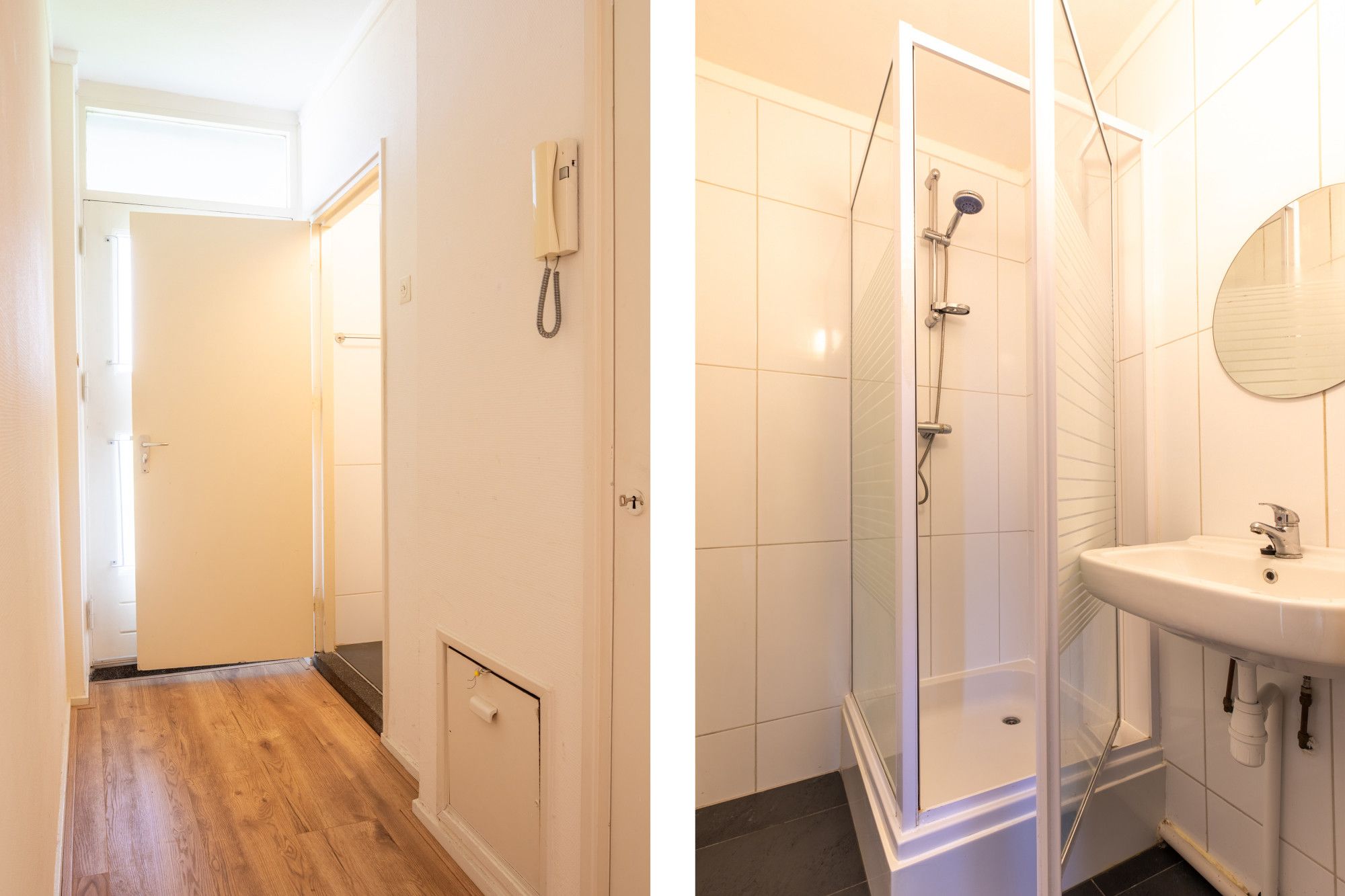 Badkamer (1.53 x 1.33 m) met douche en vaste wastafel.