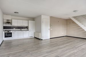 Woonkamer met open keuken (7.05 x 6.70/4.57 m) - totaal circa 41 m2) met riante raampartij met erker aan voorzijde, keukeninstallatie met diverse onder- en bovenkasten, inbouwapparatuur te weten: 4-pits gascomfort, afzuigkap, vaatwasser, koelkast en separate vrieskast. Vanuit de woonkamer toegang tot de verdieping.