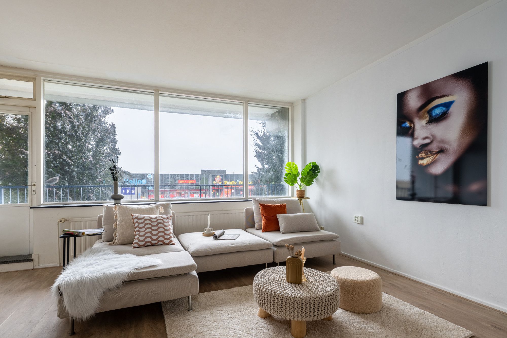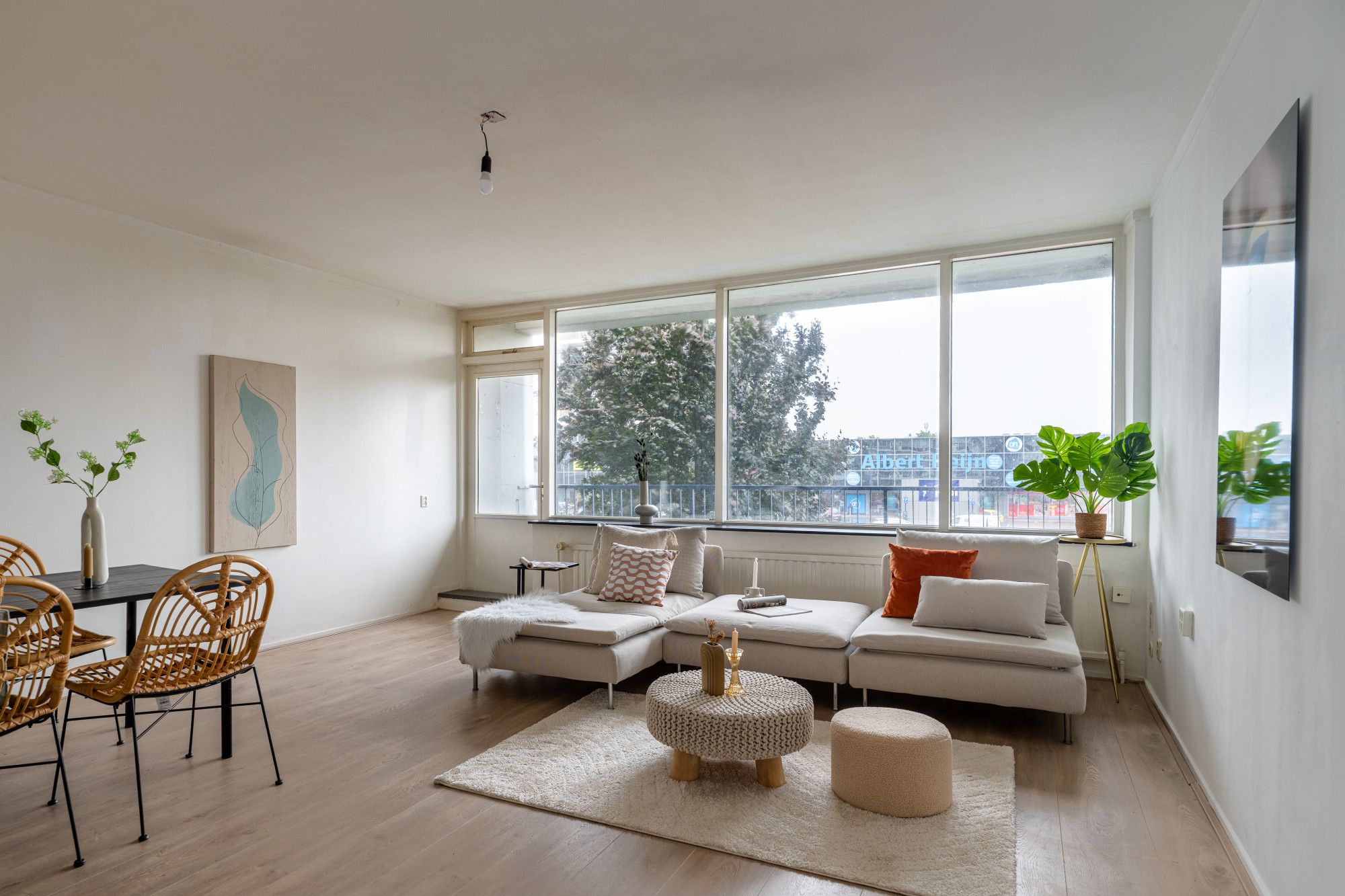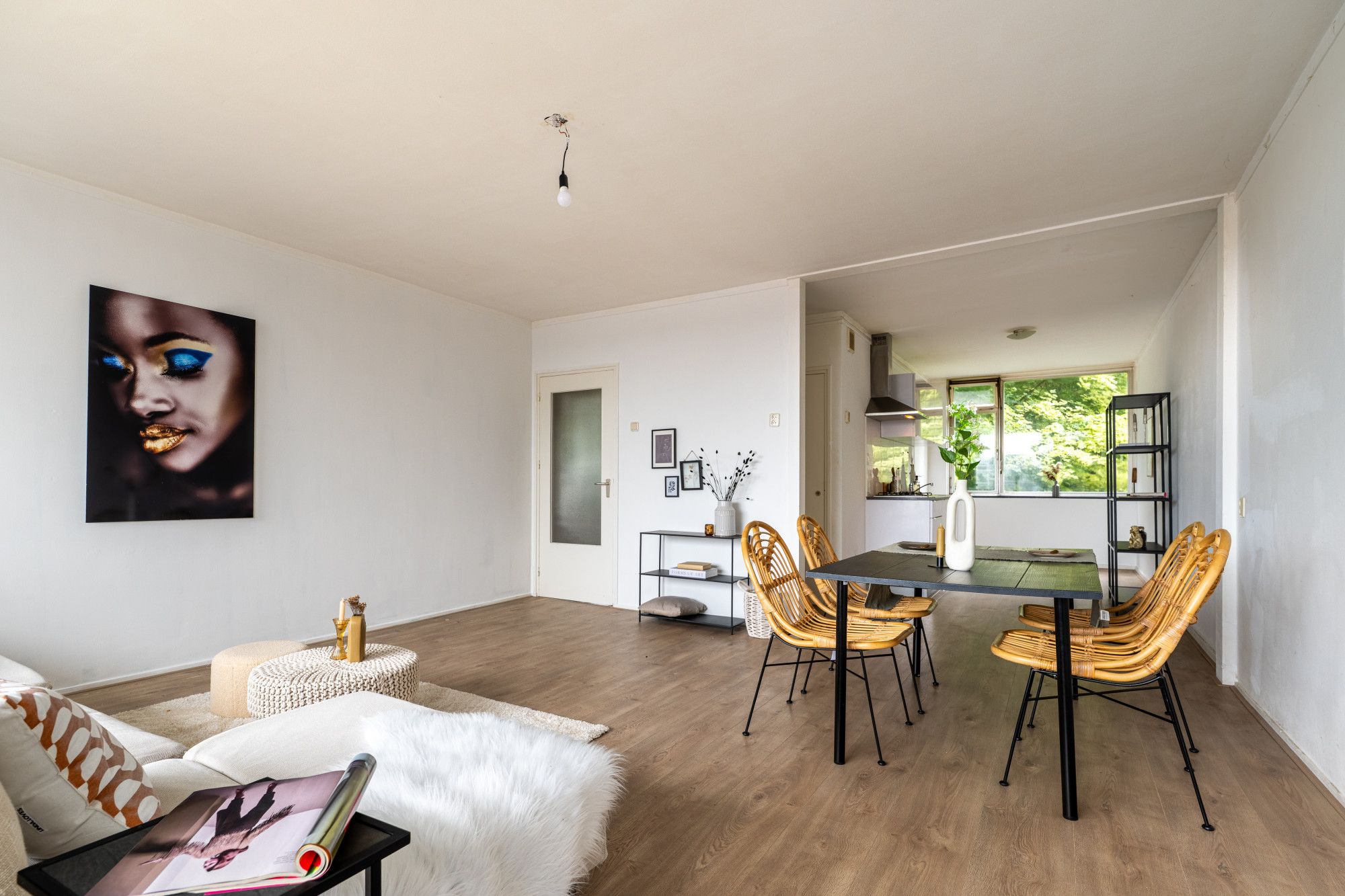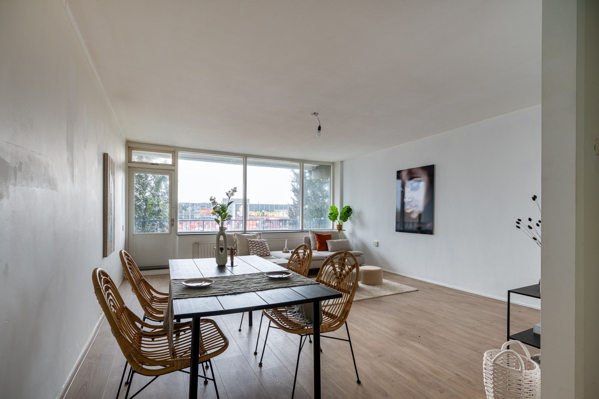 Ruime lichte woonkamer met toegang tot het balkon. Vanuit woonkamer open verbinding naar keuken met keukeninstallatie.