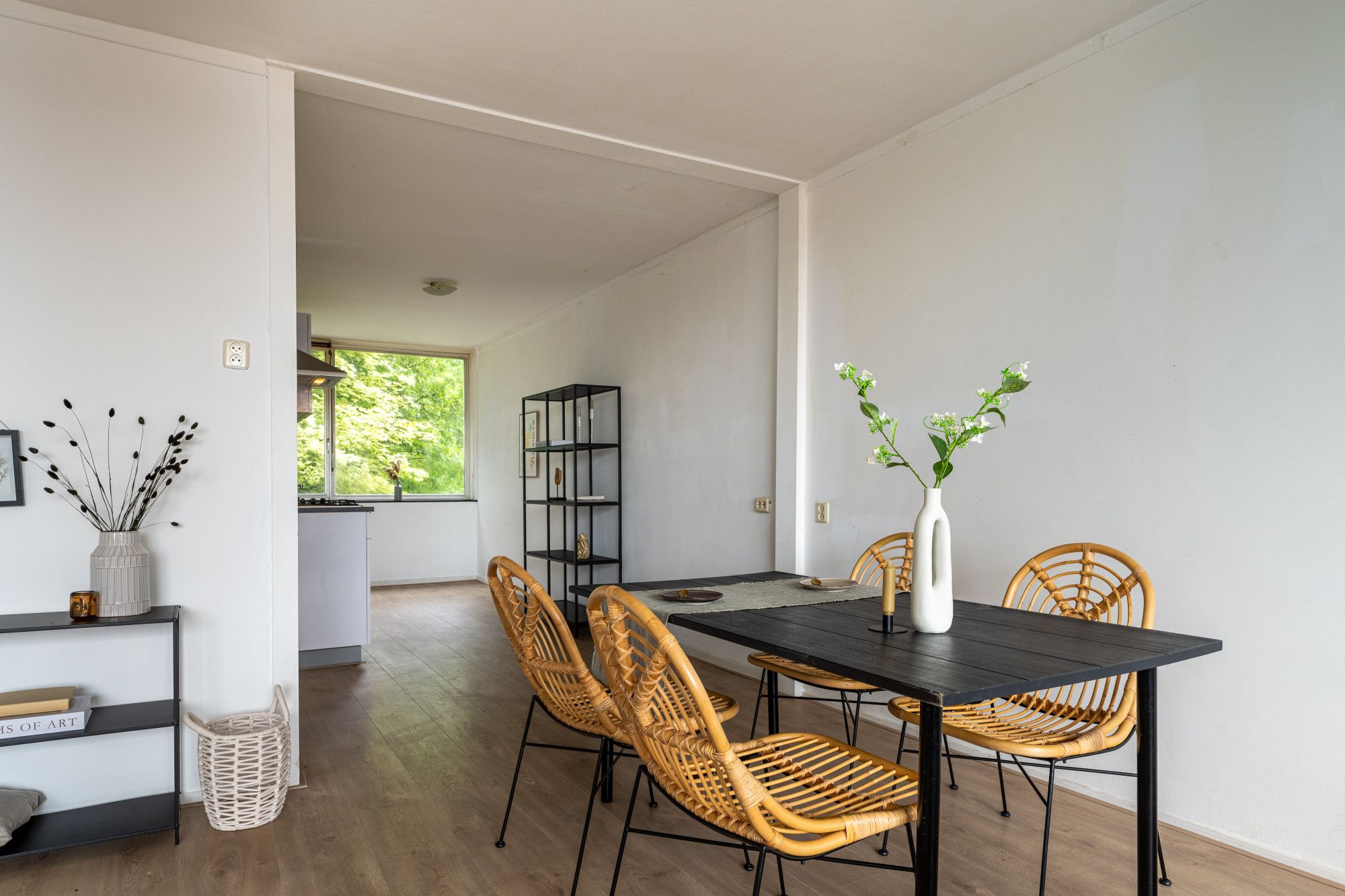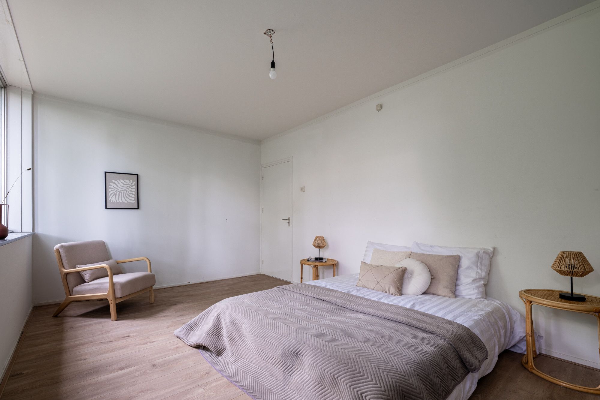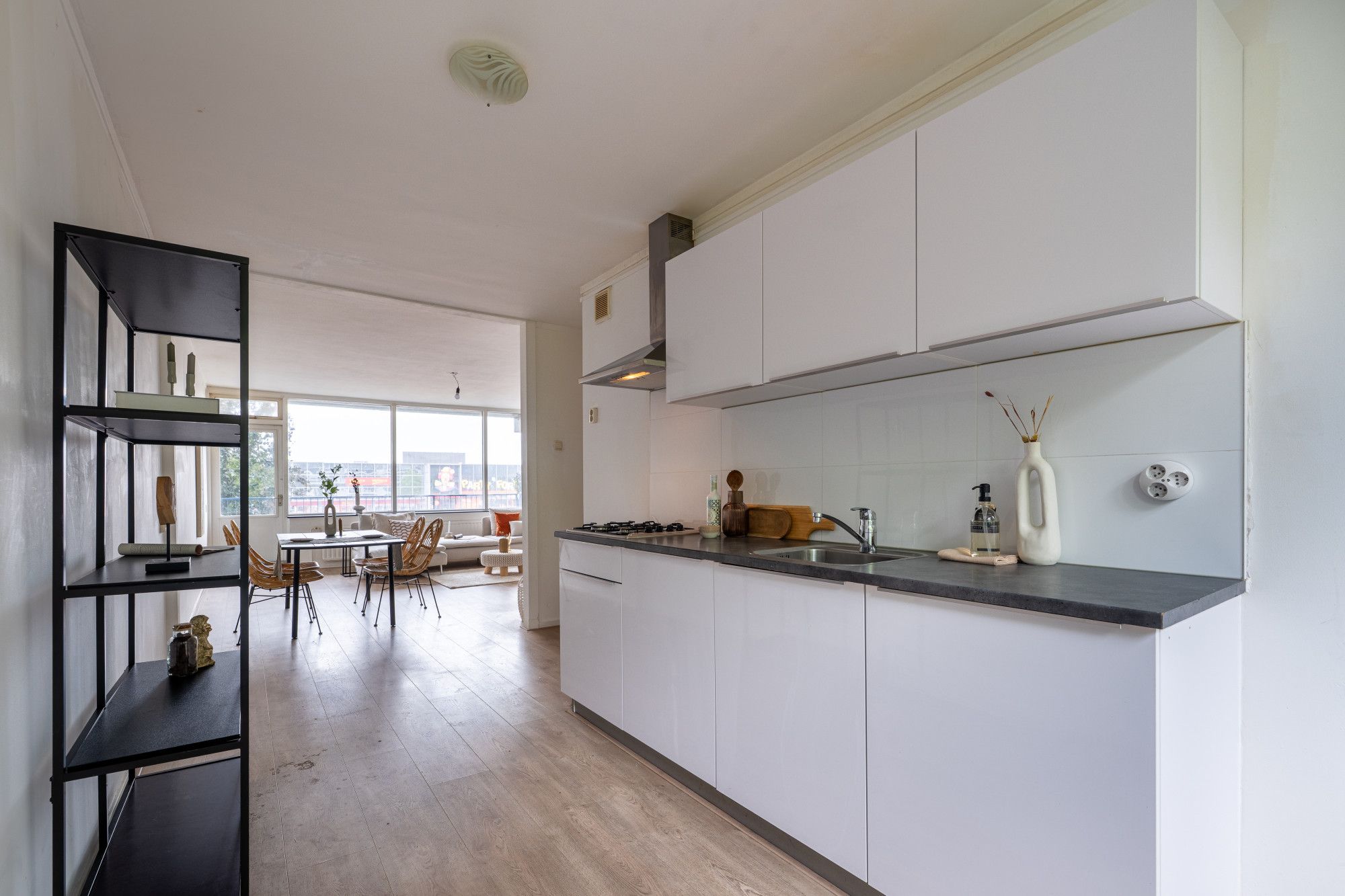 Ruime lichte woonkamer met toegang tot het balkon. Vanuit woonkamer open verbinding naar keuken met keukeninstallatie.