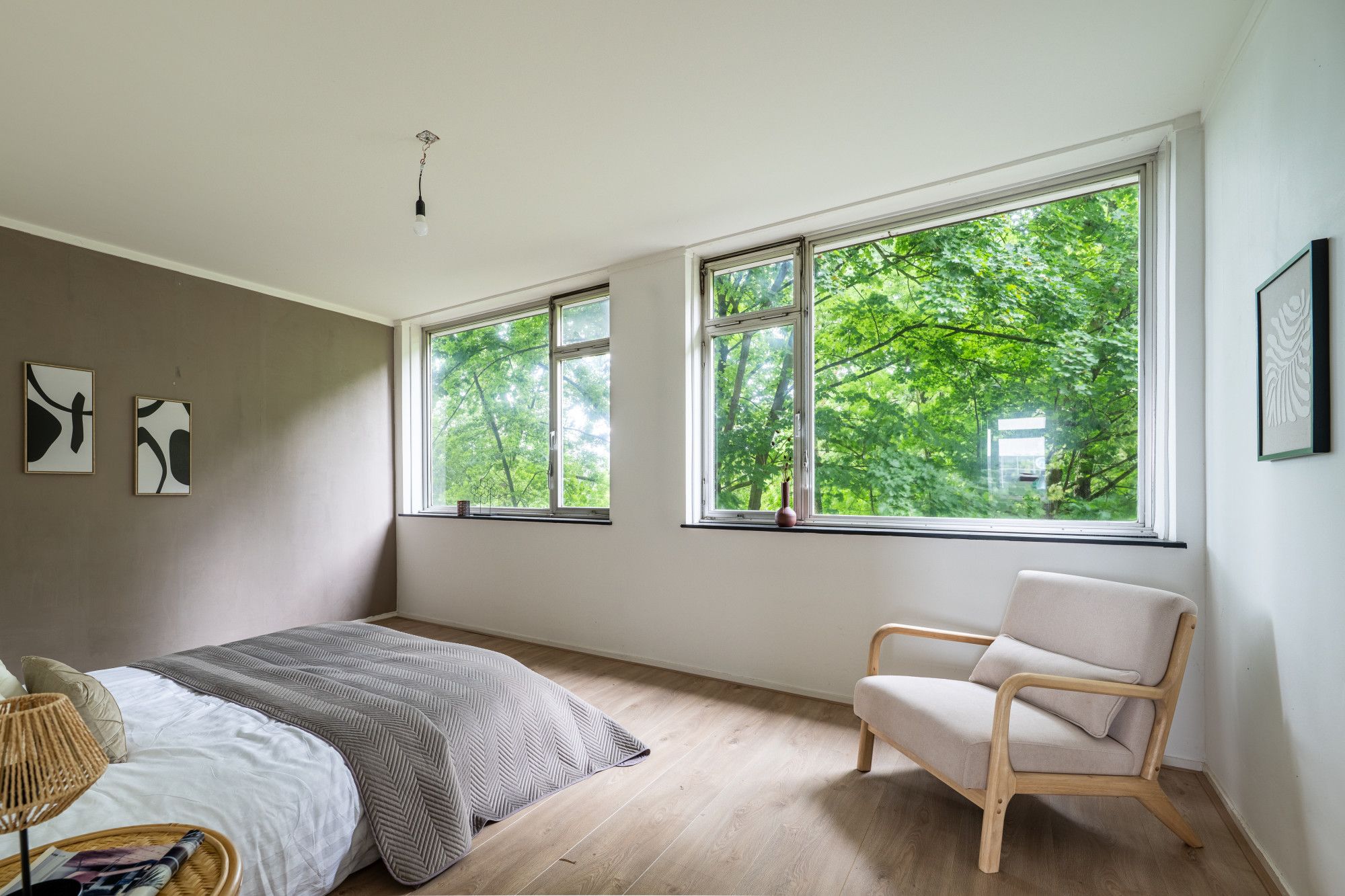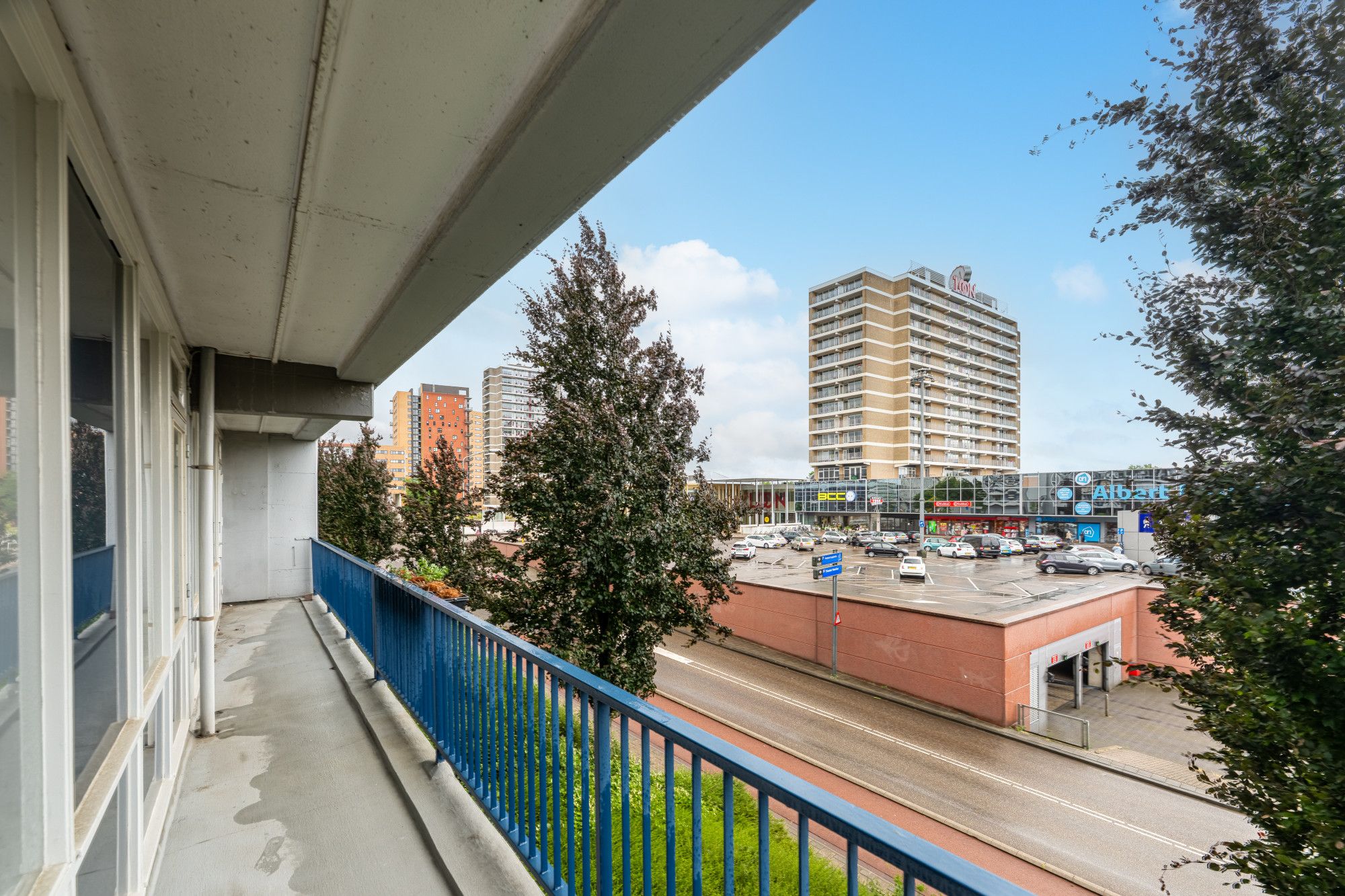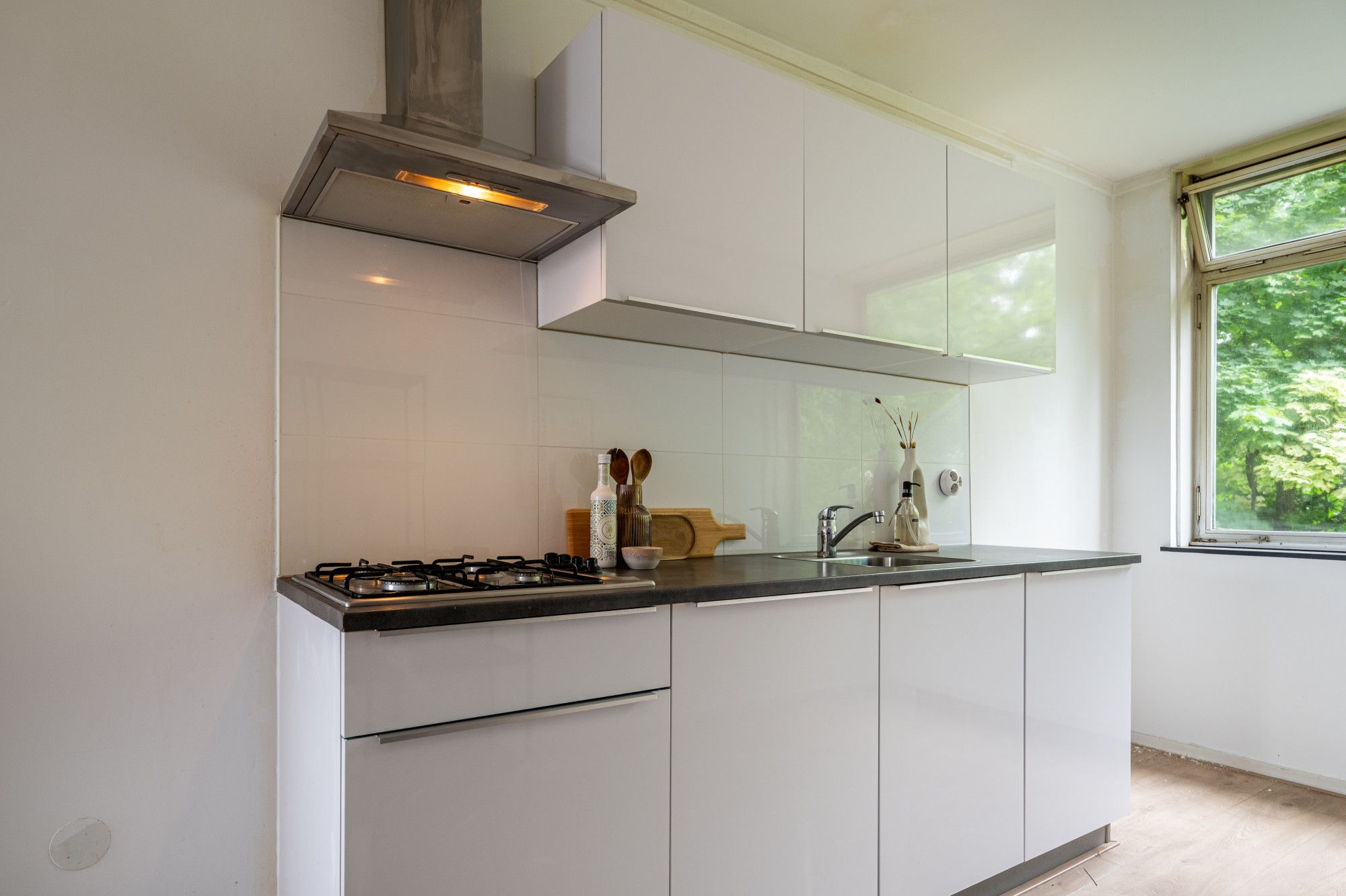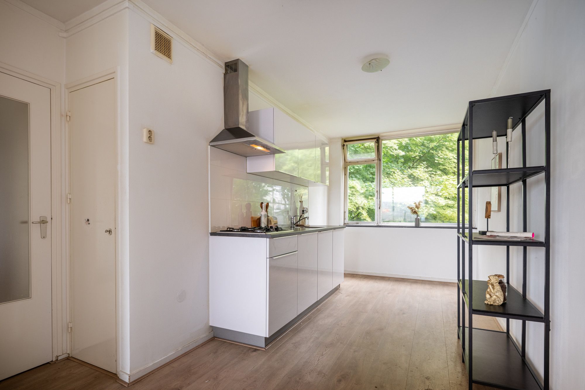 Ruime lichte woonkamer met toegang tot het balkon. Vanuit woonkamer open verbinding naar keuken met keukeninstallatie.