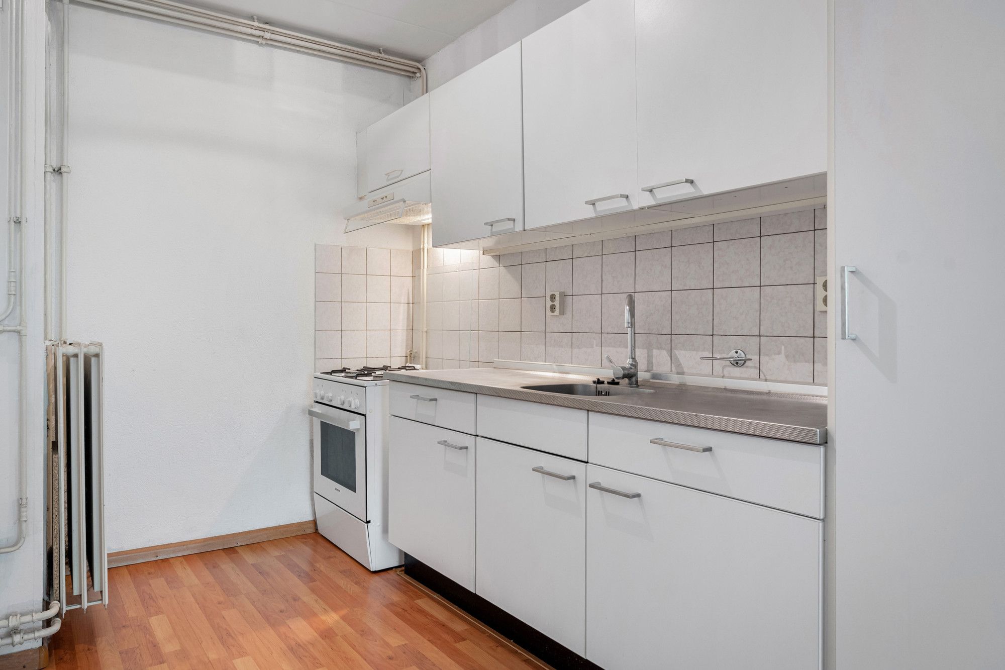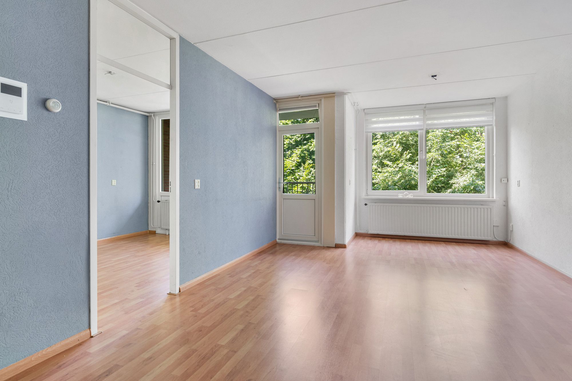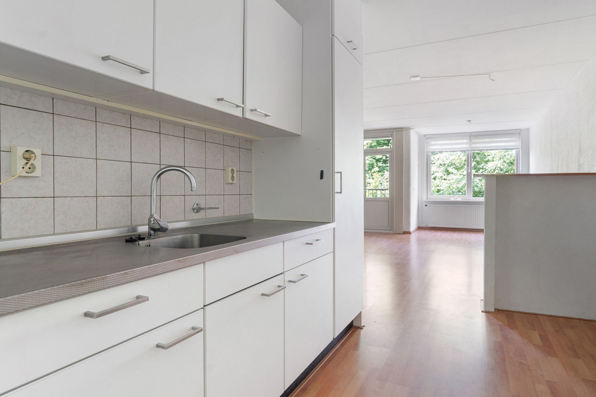 De woonkamer is ruim en licht, en biedt directe toegang tot het balkon. De open keuken is eenvoudig maar functioneel ingericht met een 4-pits gasfornuis, oven en afzuigkap. In de keuken is tevens een kast aanwezig waarin de c.v.-ketel (eigendom) is geplaatst.