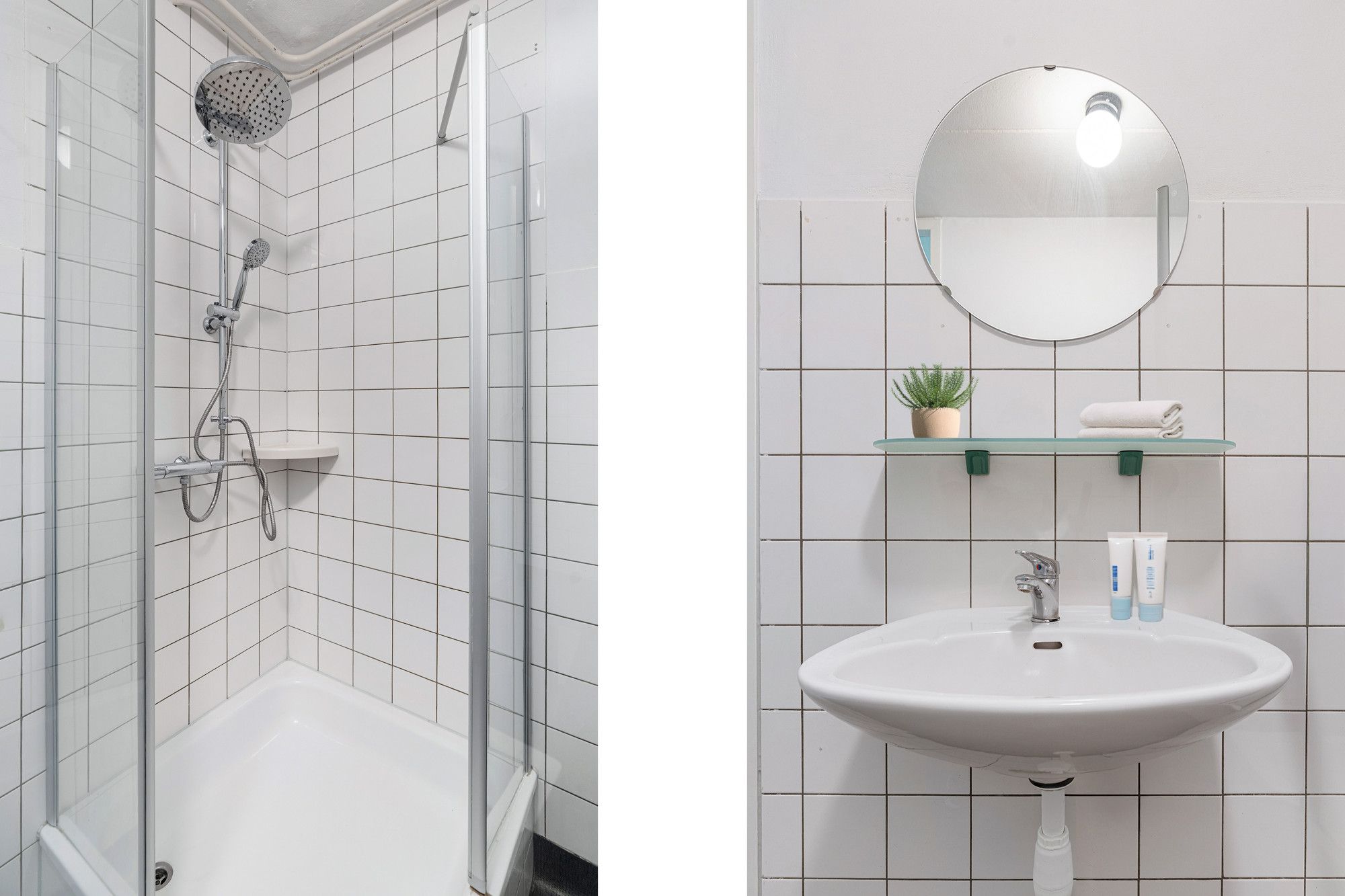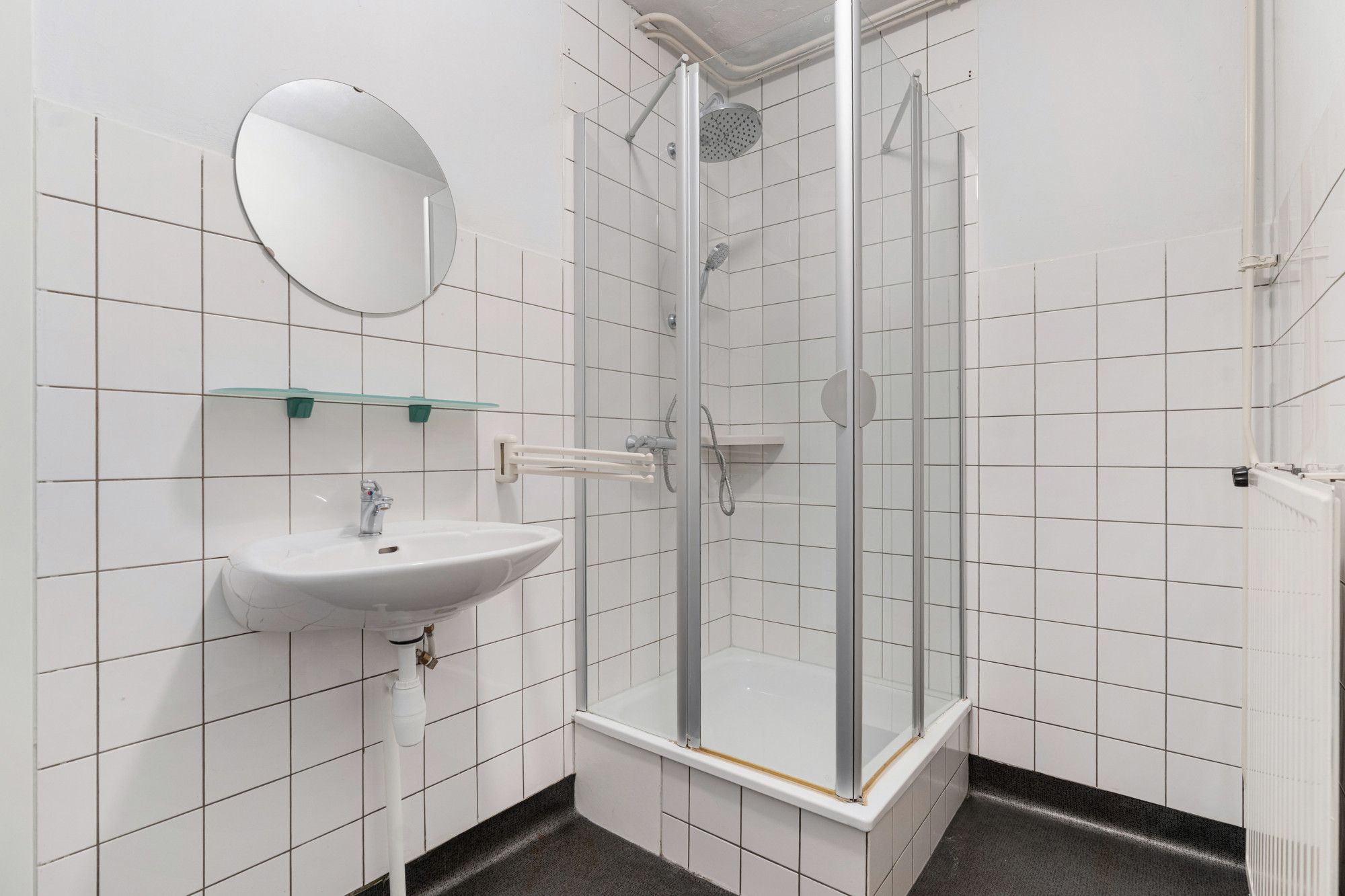 De badkamer is ingericht met een douche en een vaste wastafel.