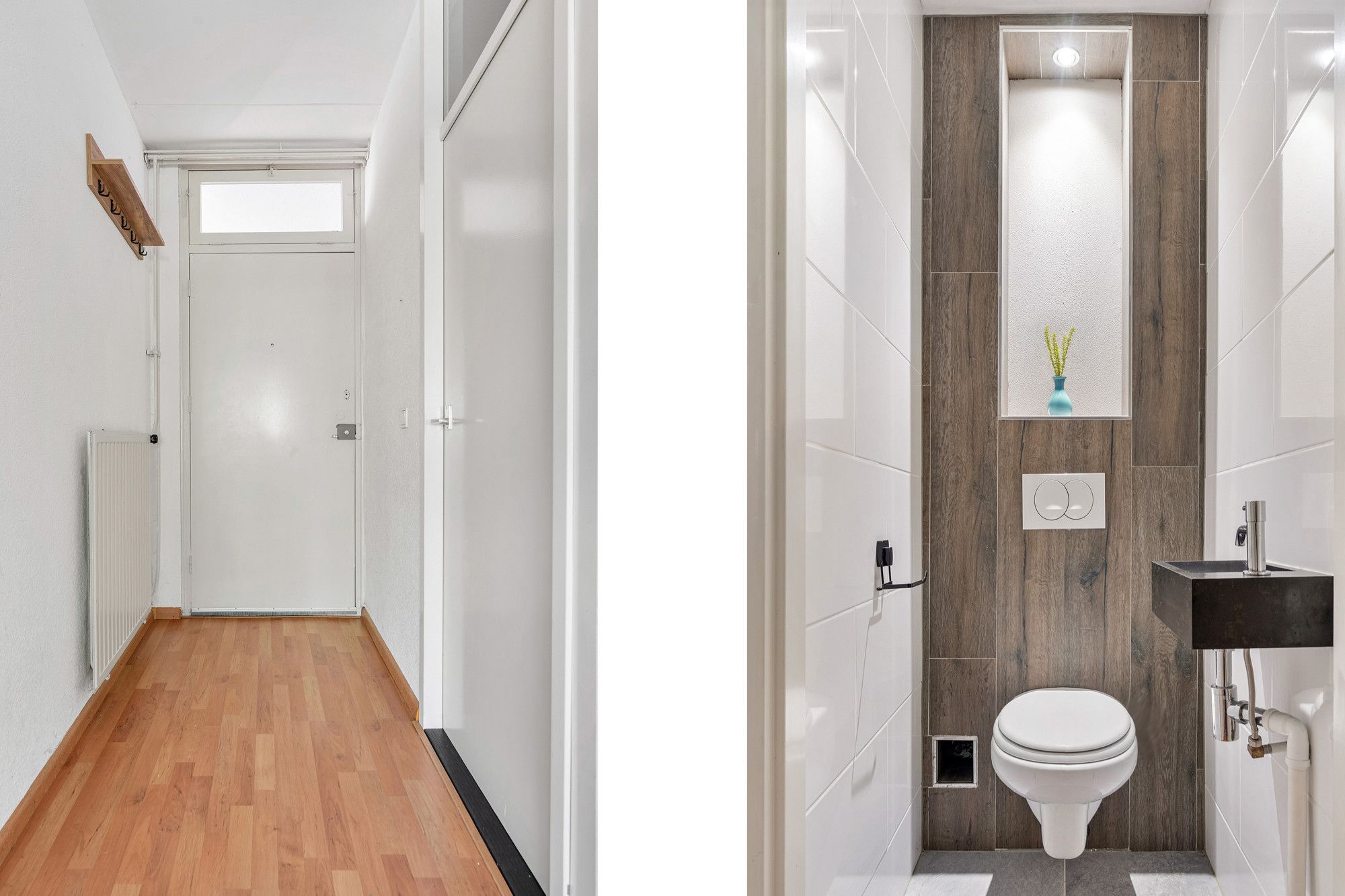 De moderne betegelde toiletruimte is voorzien van een hangcloset en fontein. Aansluitend bevindt zich een praktische bergkamer met aansluiting voor de wasmachine.