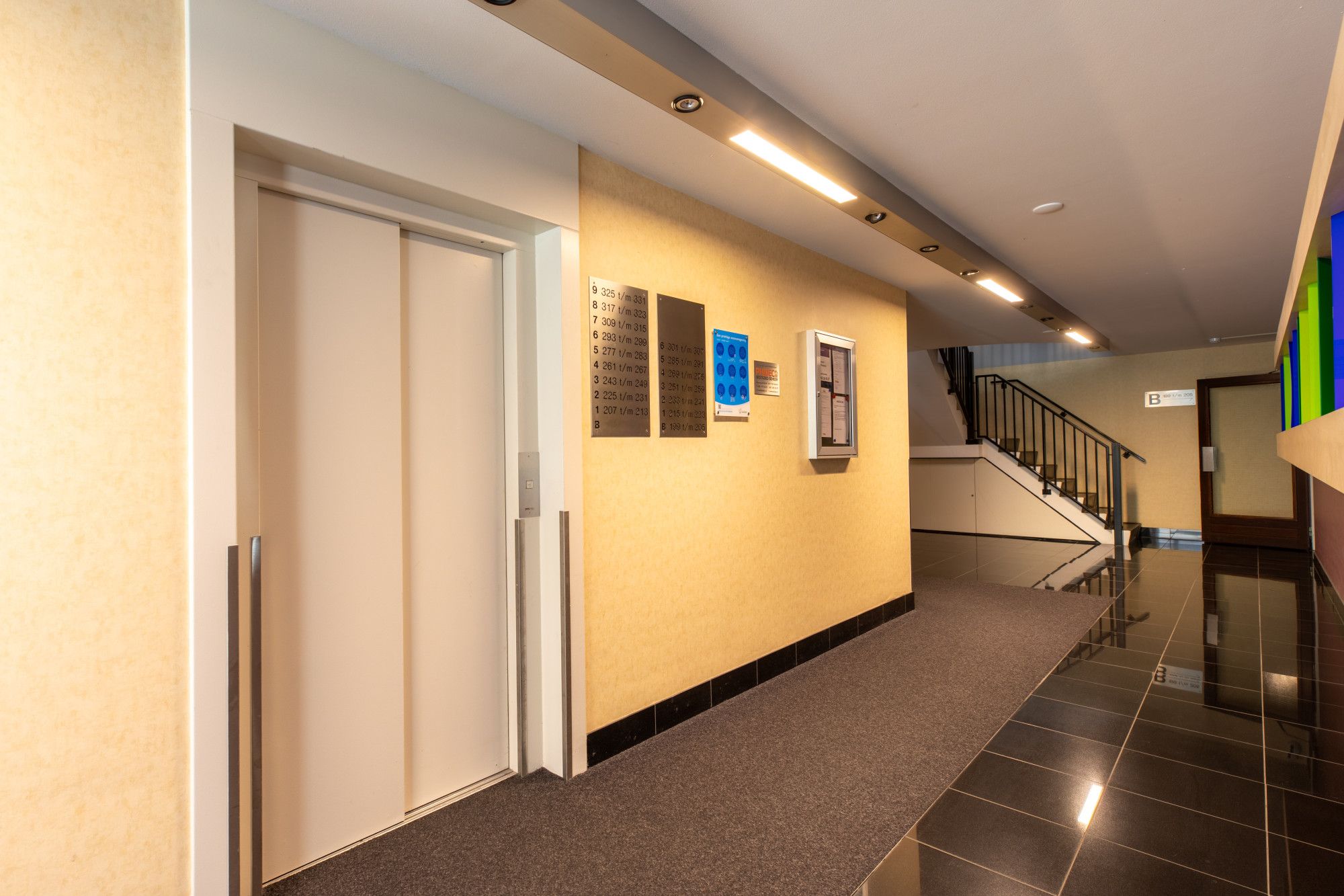 Representatieve ontvangst hal met brievenbussen en toegang naar de dubbele liften.