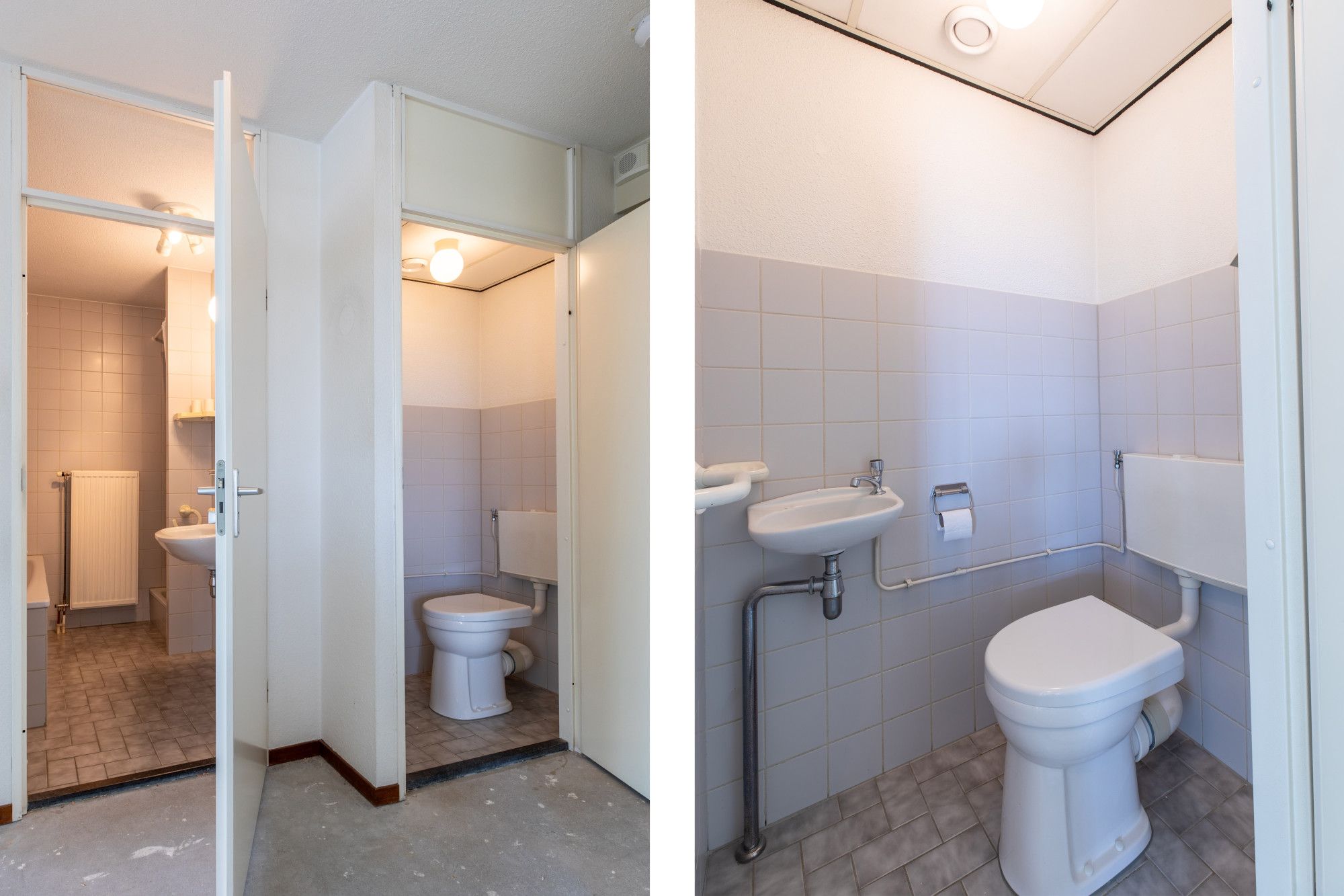 Toilet deels betegeld met duo closet toilet met fonteintje.