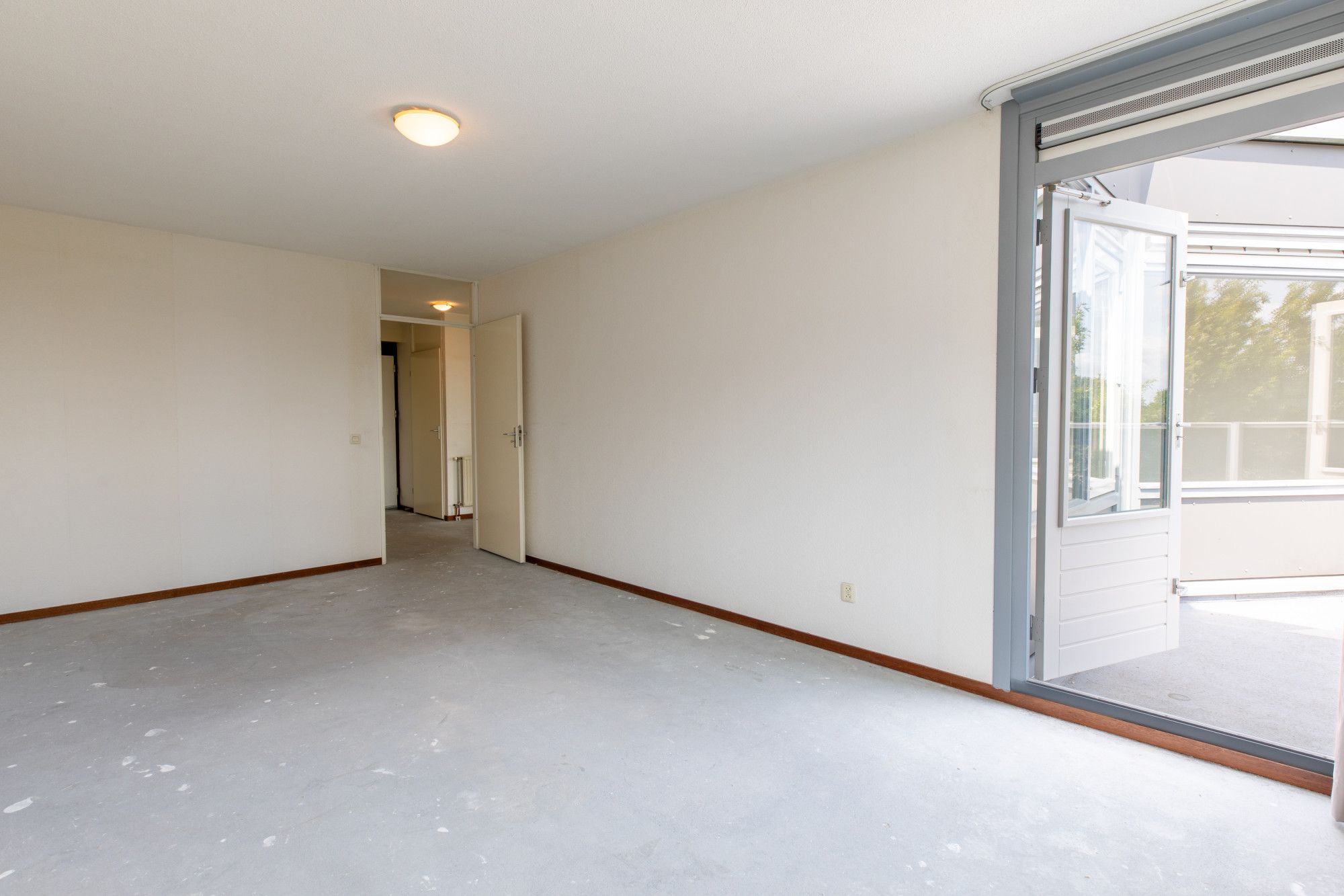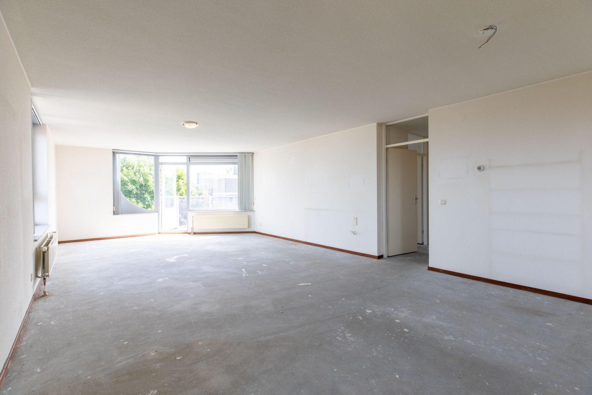 Riante woonkamer (9.56 x 4.54 m) met toegang naar de keuken. Tevens toegang naar het balkon (3.92 x 3.48 m).