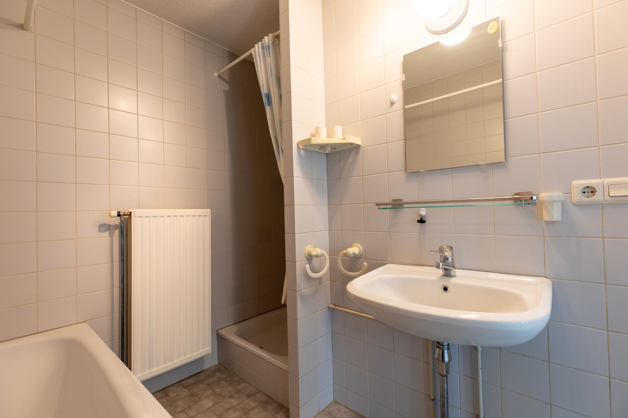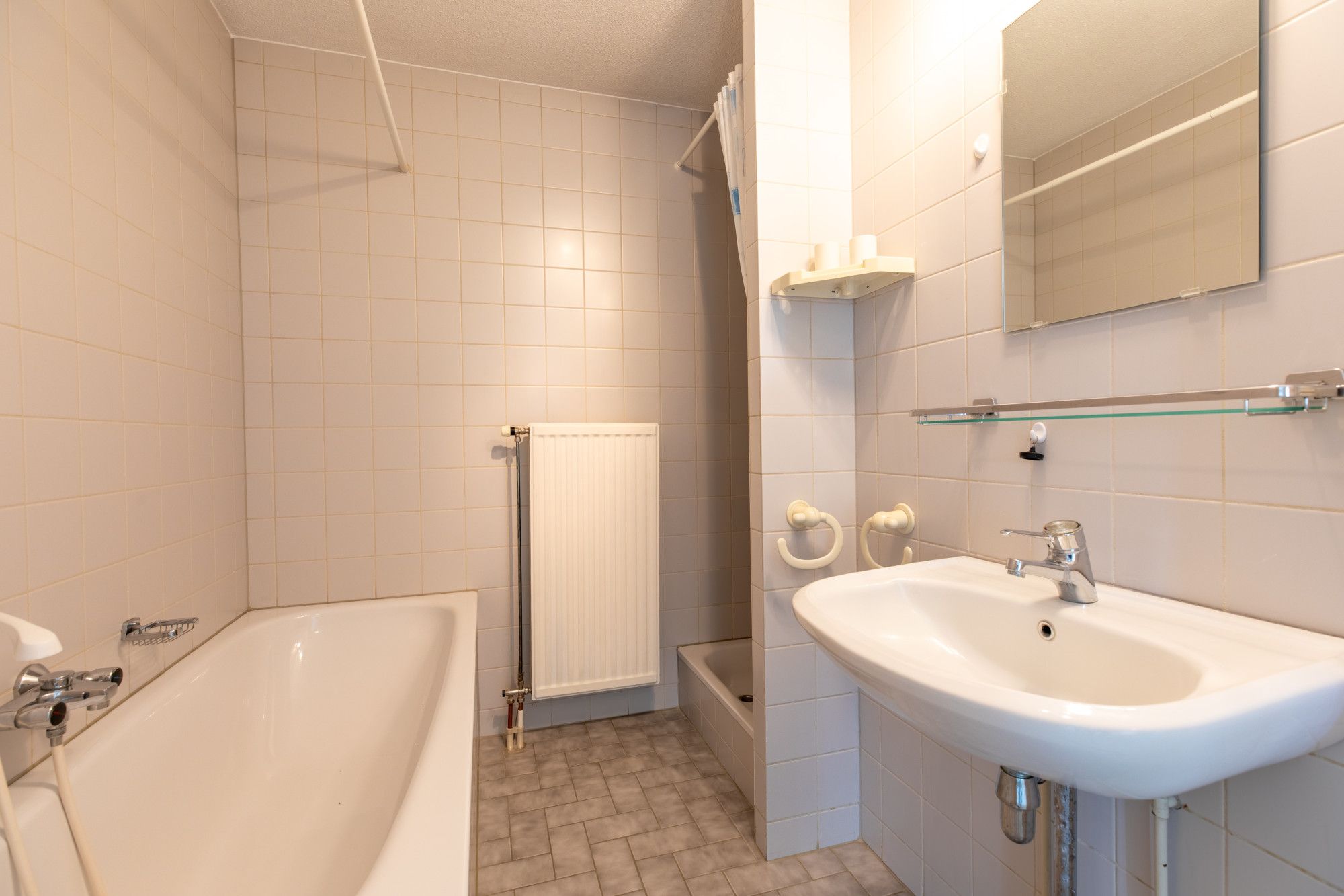 Geheel betegelde badkamer (2.26 x 2.28 m) met douche, ligbad en vaste wastafel
