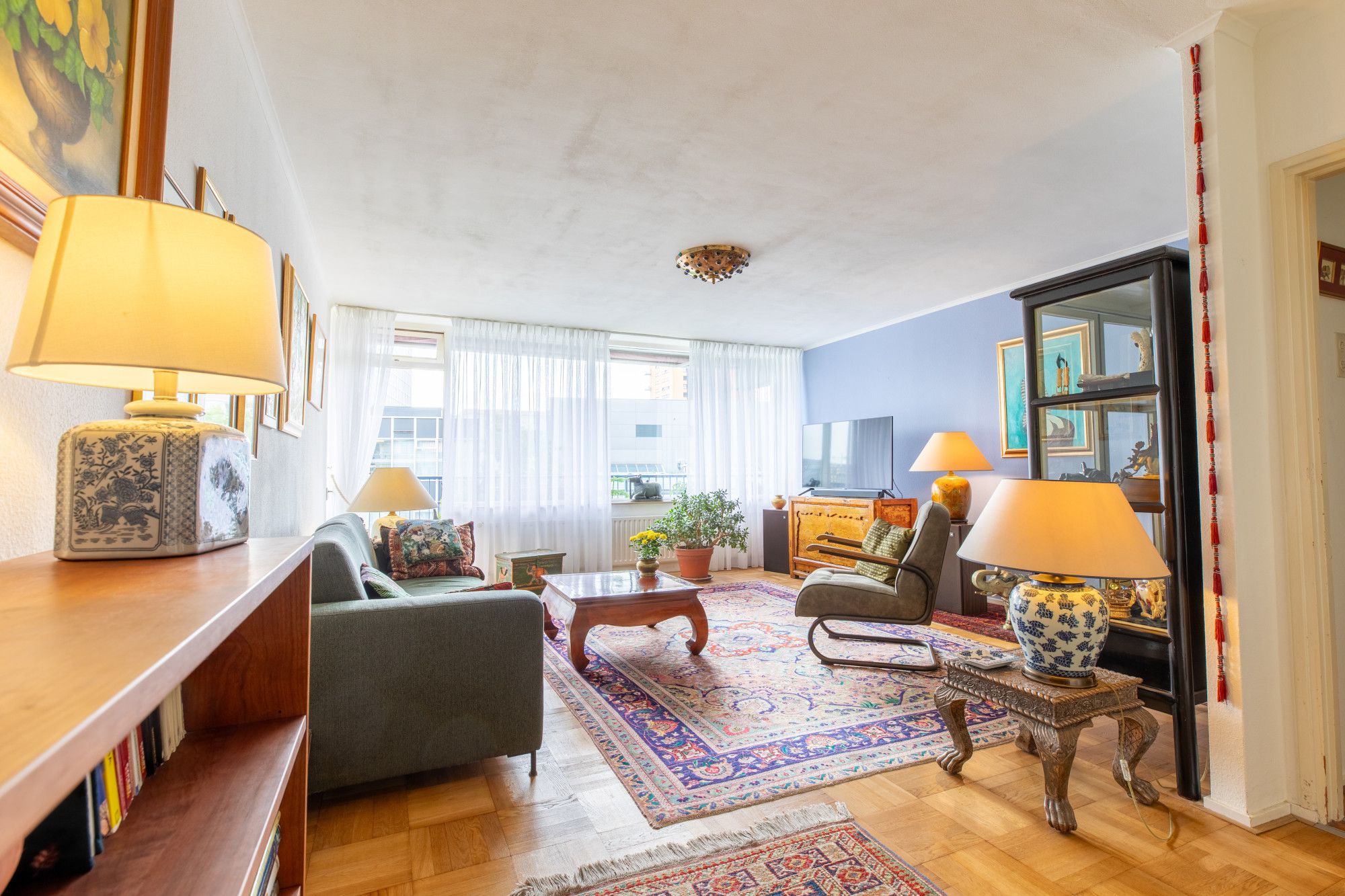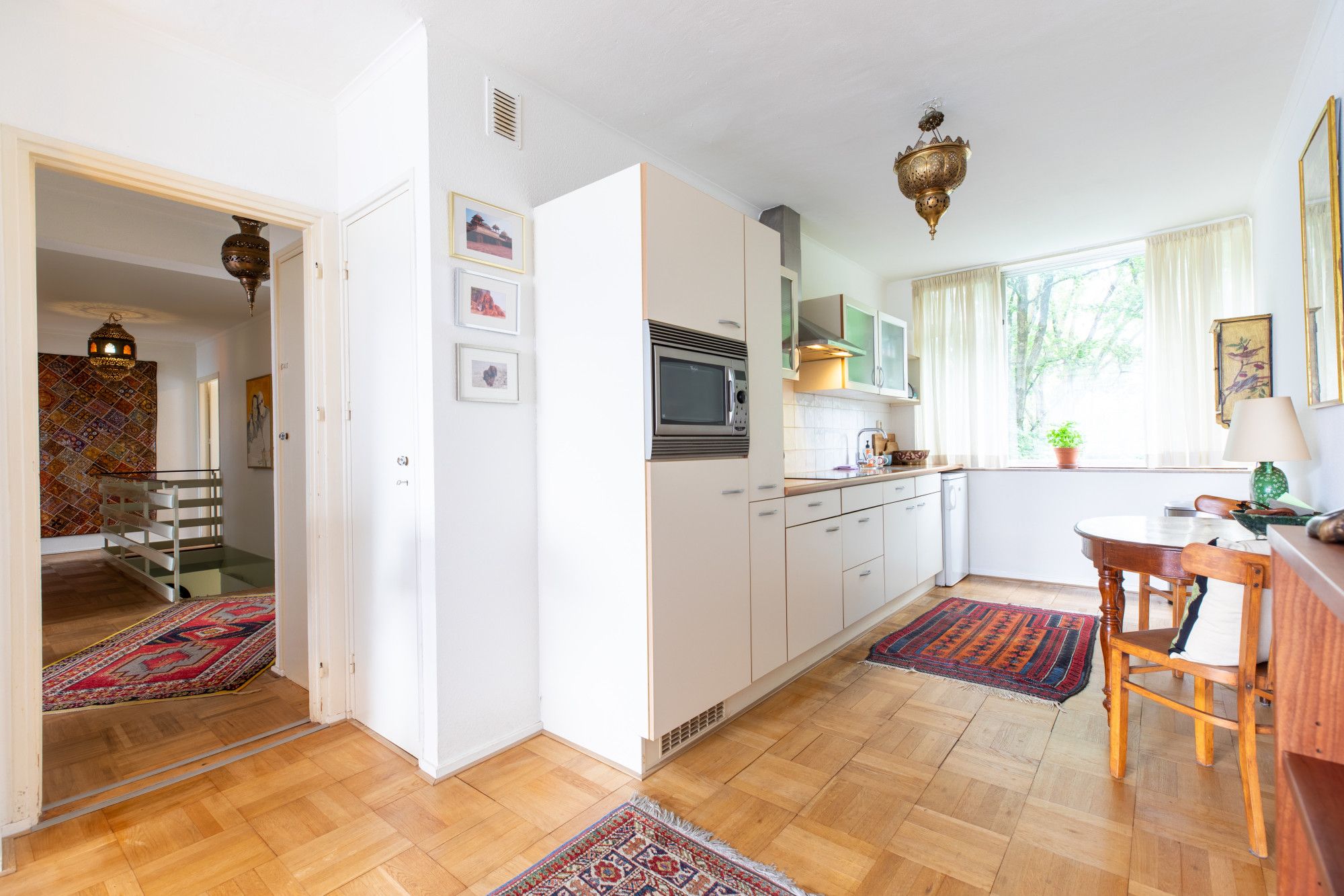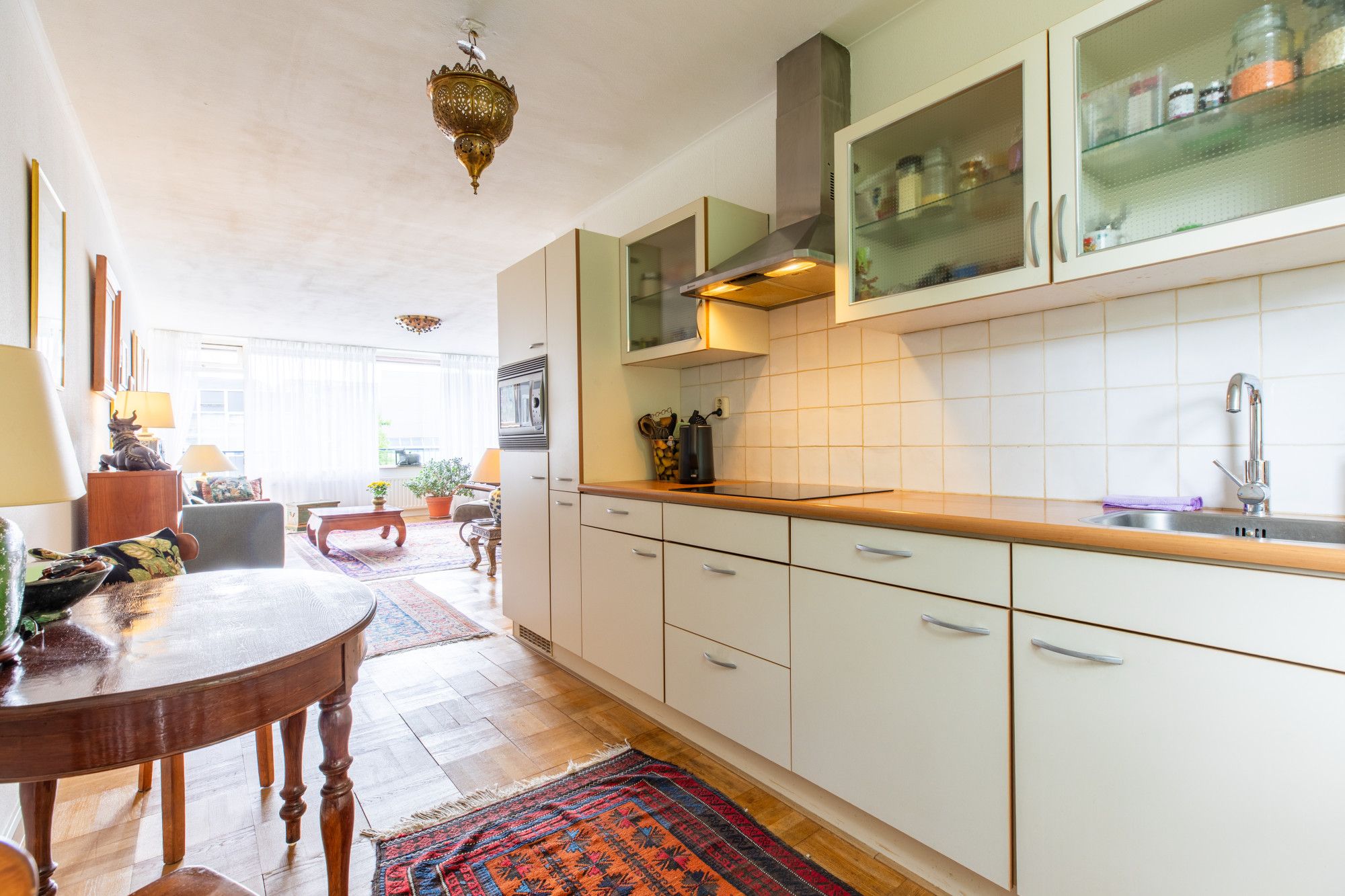 Ruime lichte woonkamer (5.04 x 4.98 m) met vrij zicht en toegang tot het ruime balkon. Vanuit woonkamer open verbinding naar keuken (5.10 x 2.26 m) met keukeninstallatie met diverse onder- en bovenkasten, apothekerskast, inbouwapparatuur te weten: 4 -pits inductie kookplaat, afzuigkap, combi- magnetron en vrijstaande koelkast.