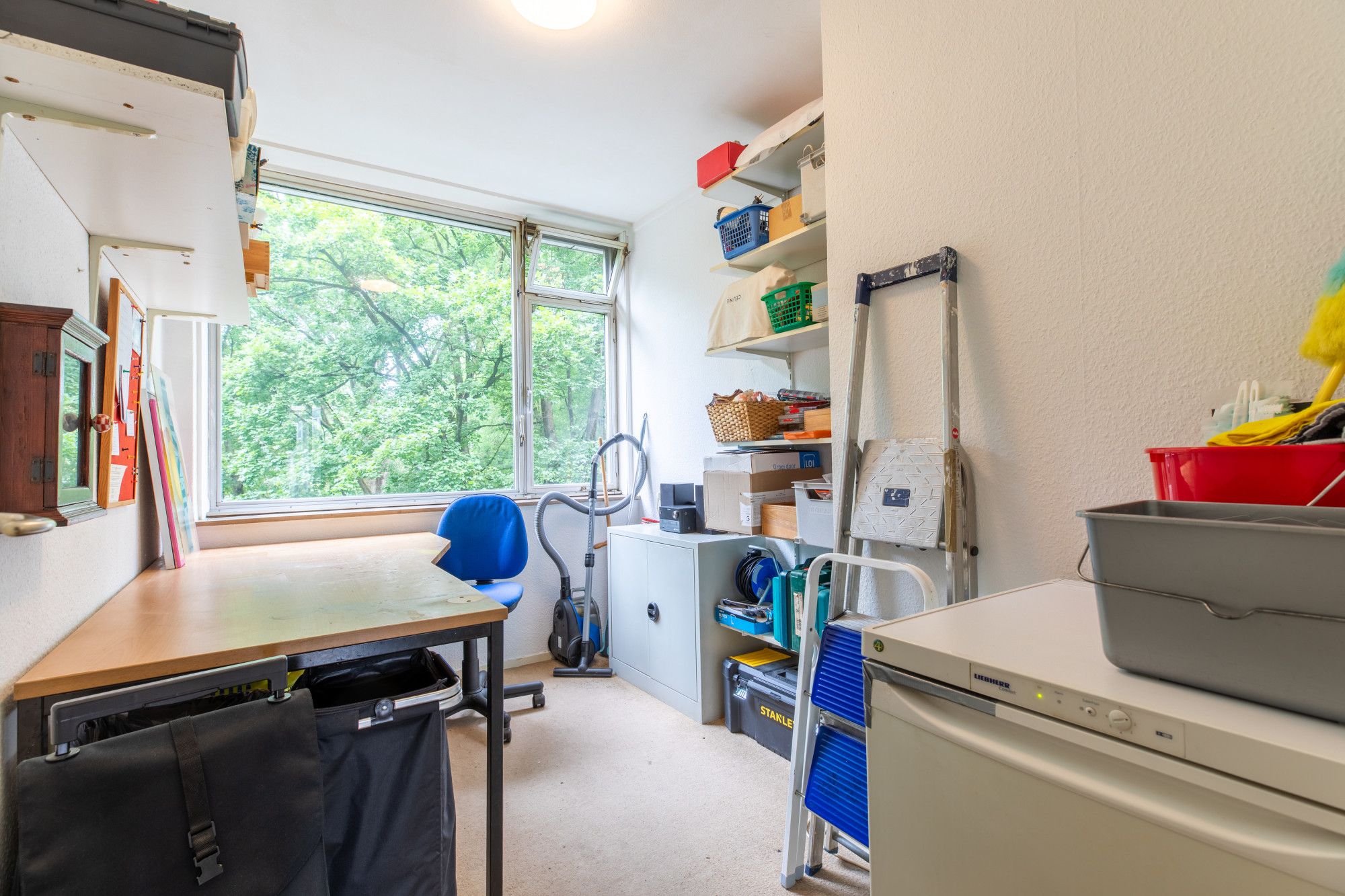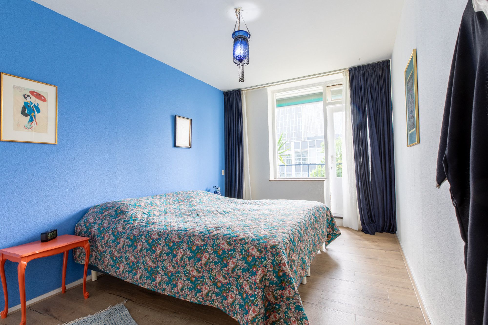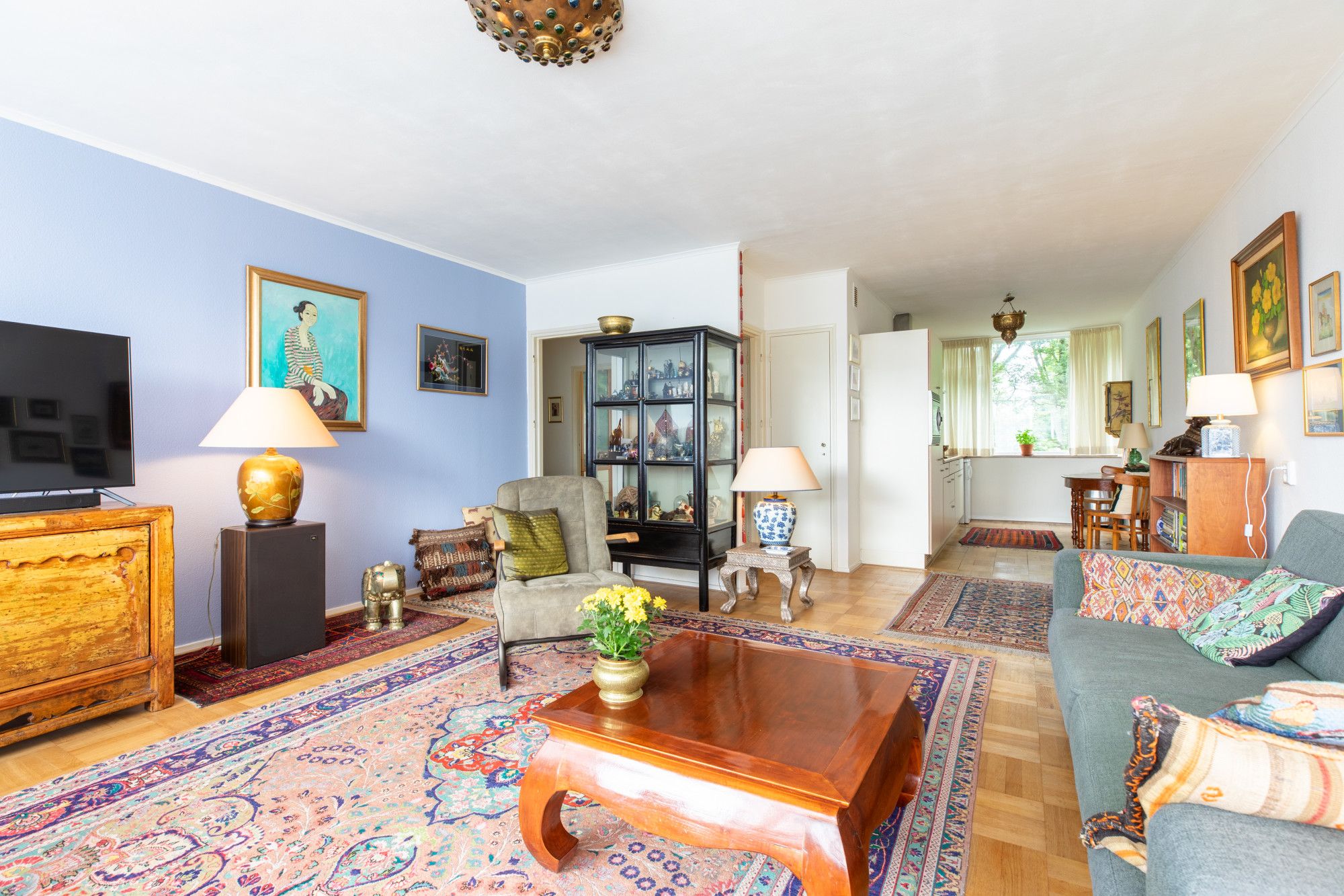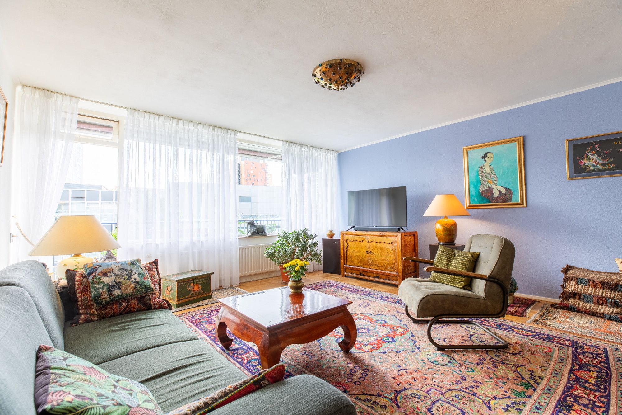 Ruime lichte woonkamer (5.04 x 4.98 m) met vrij zicht en toegang tot het ruime balkon. Vanuit woonkamer open verbinding naar keuken (5.10 x 2.26 m) met keukeninstallatie met diverse onder- en bovenkasten, apothekerskast, inbouwapparatuur te weten: 4 -pits inductie kookplaat, afzuigkap, combi- magnetron en vrijstaande koelkast.