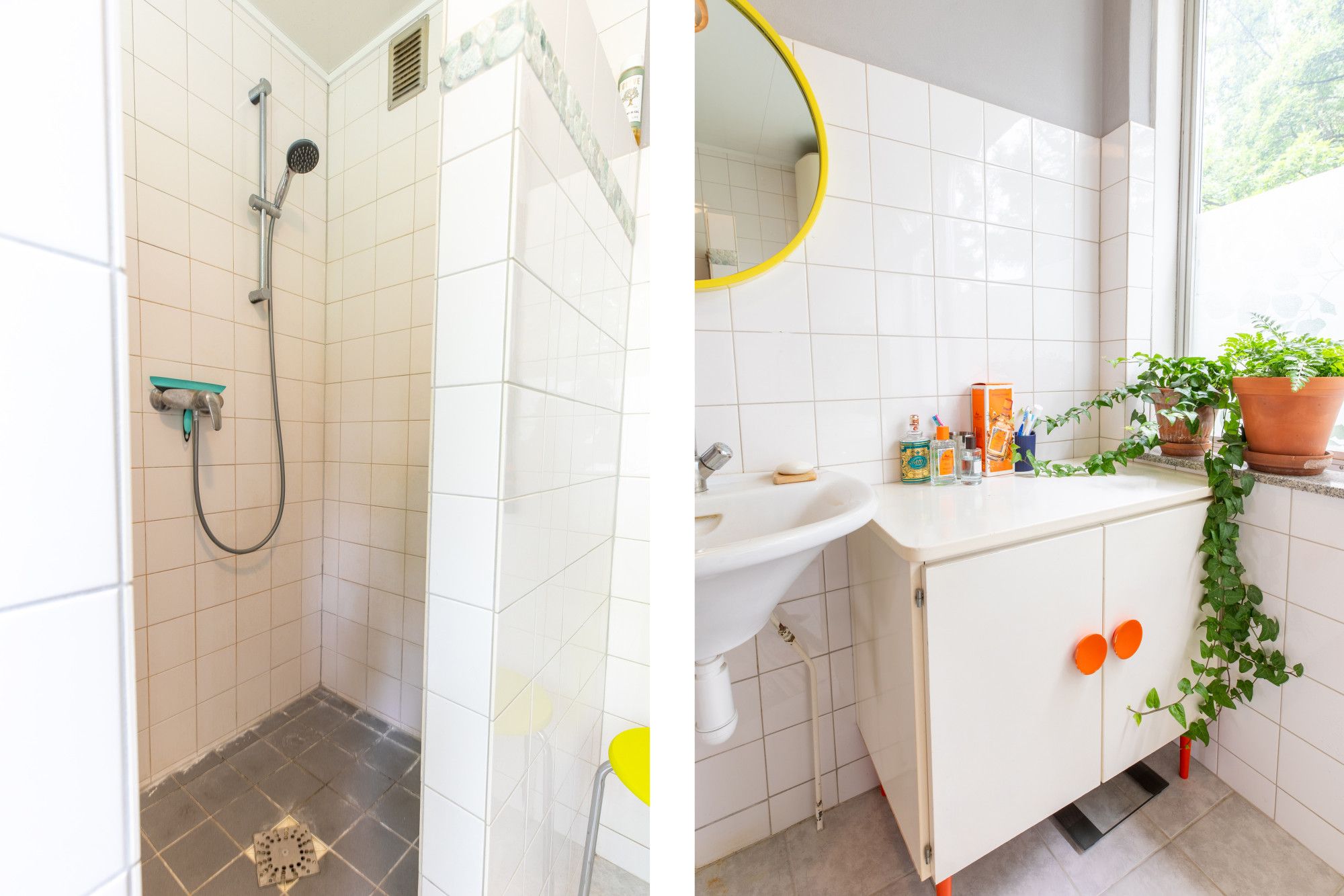 Badkamer (2.49 x 2.27 m) met inloopdouche, vaste wastafel en witgoed aansluiting.