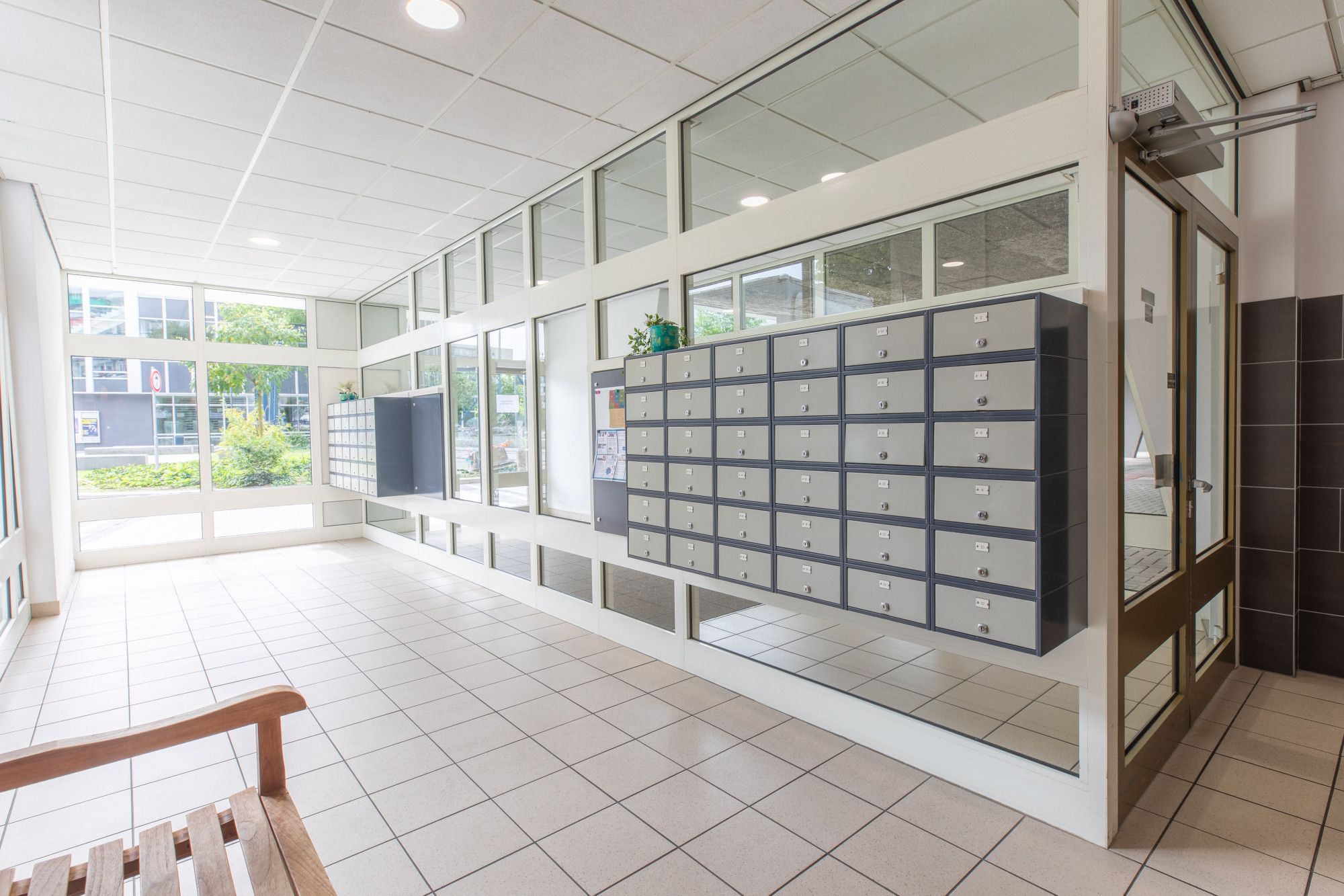 Centrale entree met brievenbussen, bellen plateau en lift installatie.