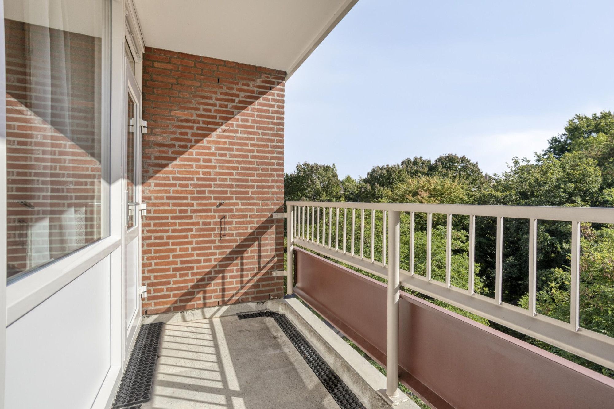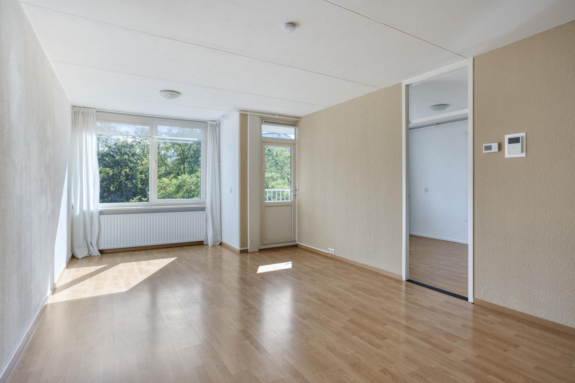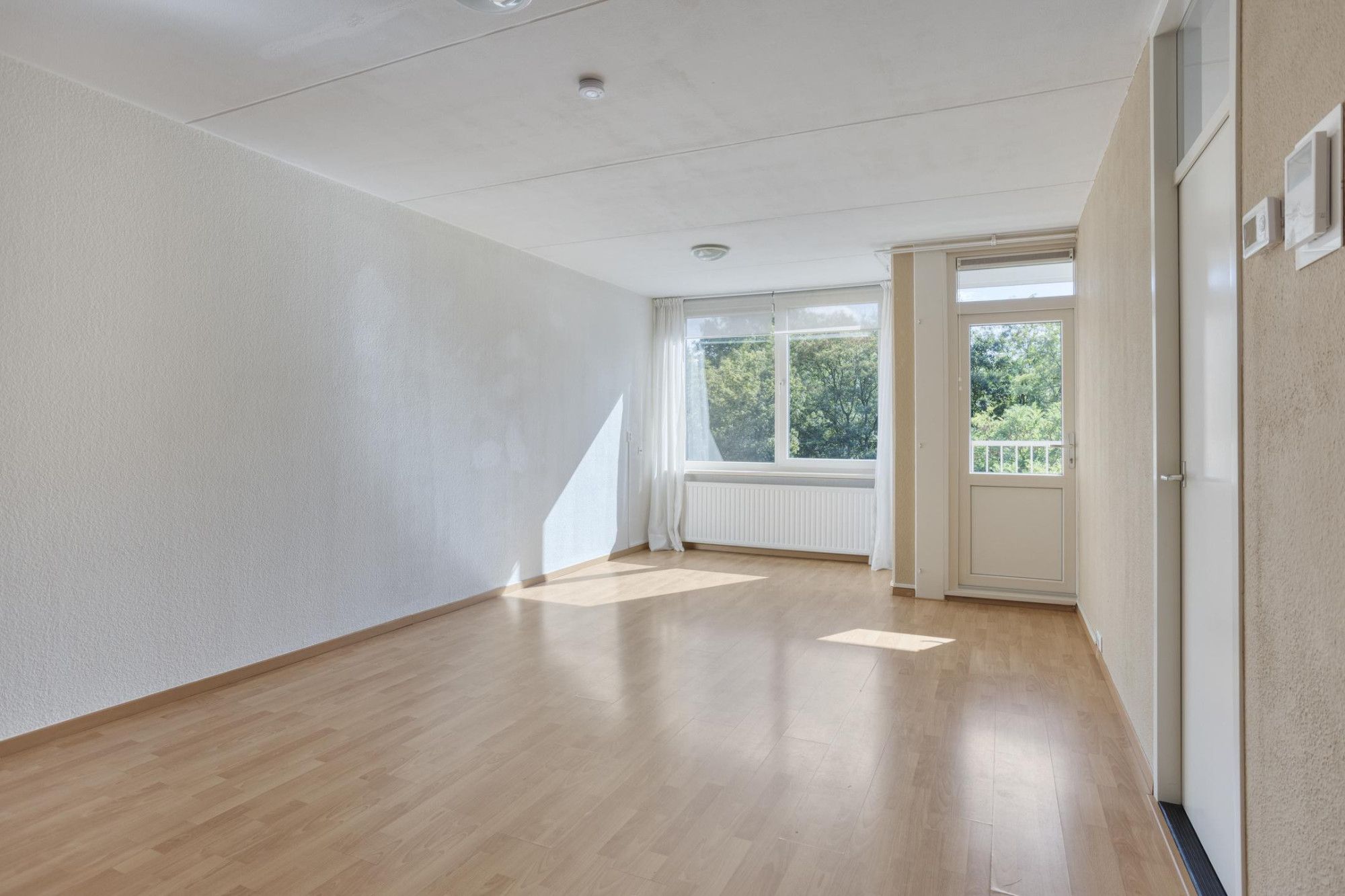 De lichte woonkamer, met uitzicht op het groen, biedt toegang tot het (deels) aangesloten balkon.