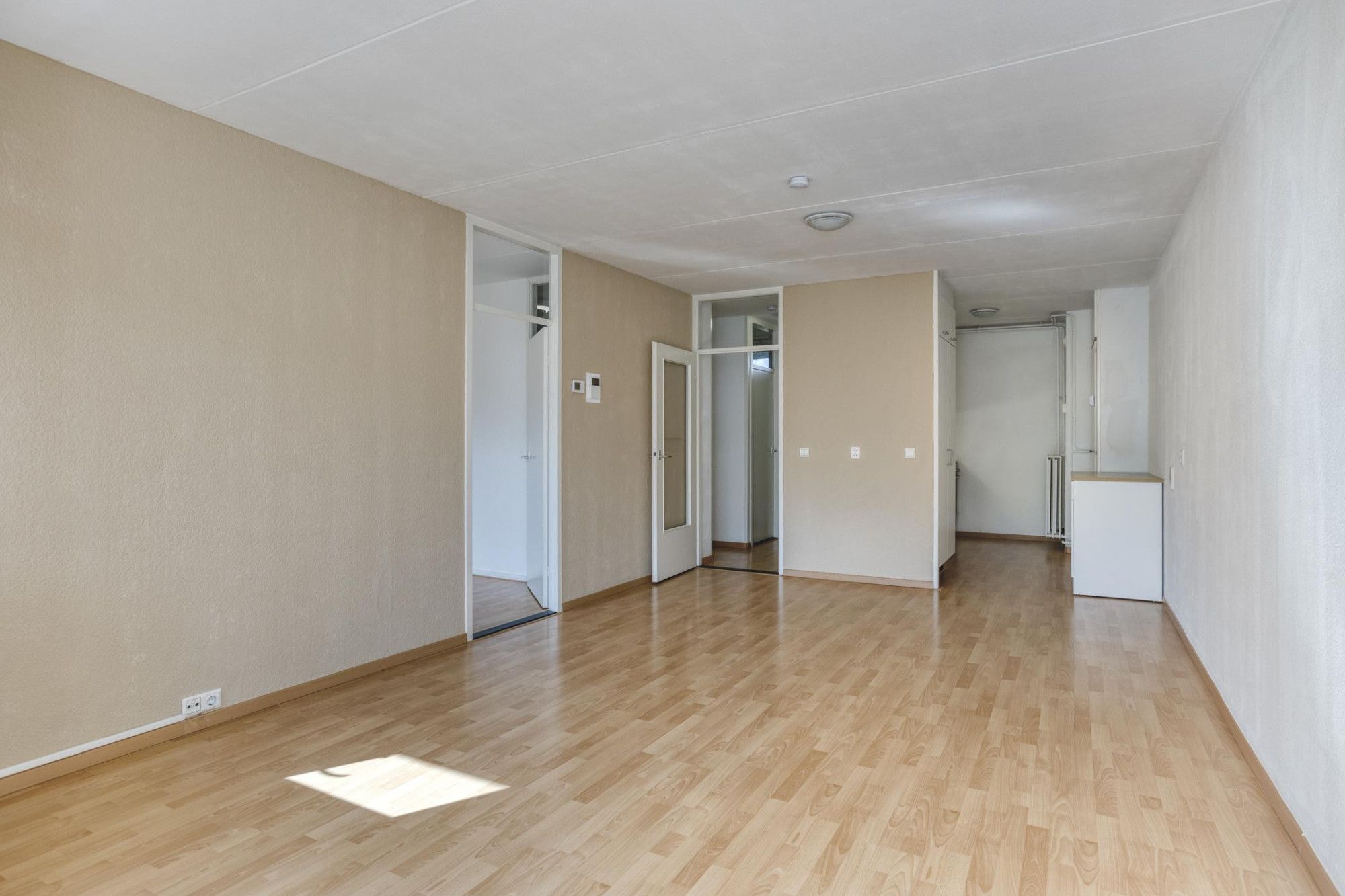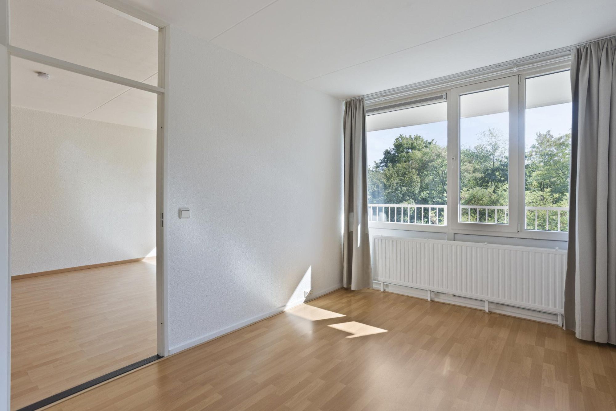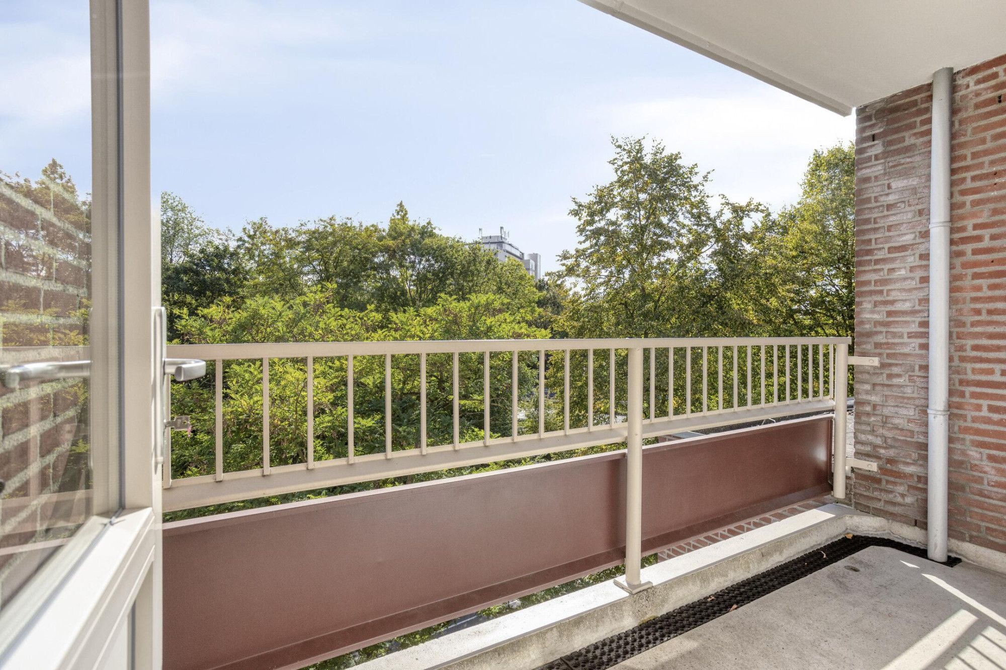 De lichte woonkamer, met uitzicht op het groen, biedt toegang tot het (deels) aangesloten balkon.