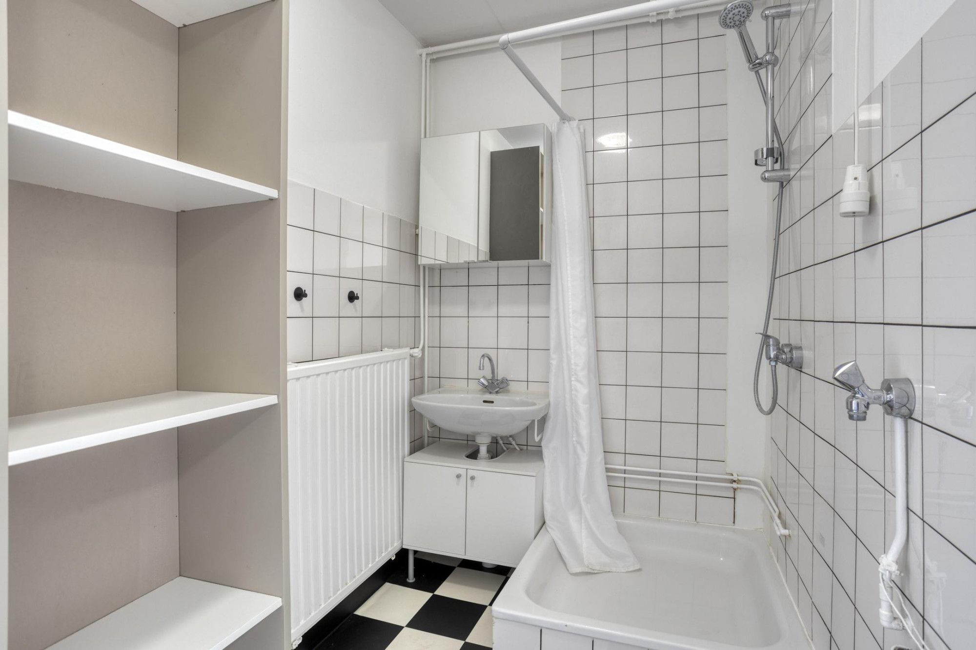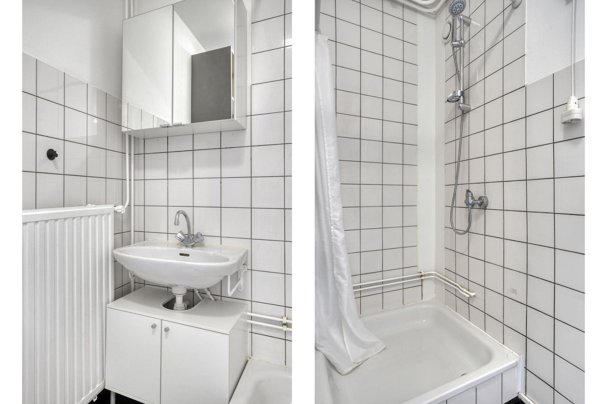 Badkamer, v.v. wastafel met wastafelmeubel, douche en wasmachineaansluiting. De badkamer is zowel via slaapkamer 1 als via de hal/gang te bereiken. Dit biedt de mogelijkheid om de deur in de slaapkamer niet te gebruiken en in plaats hiervan extra opbergruimte in zowel de slaap- als de badkamer te creëren.