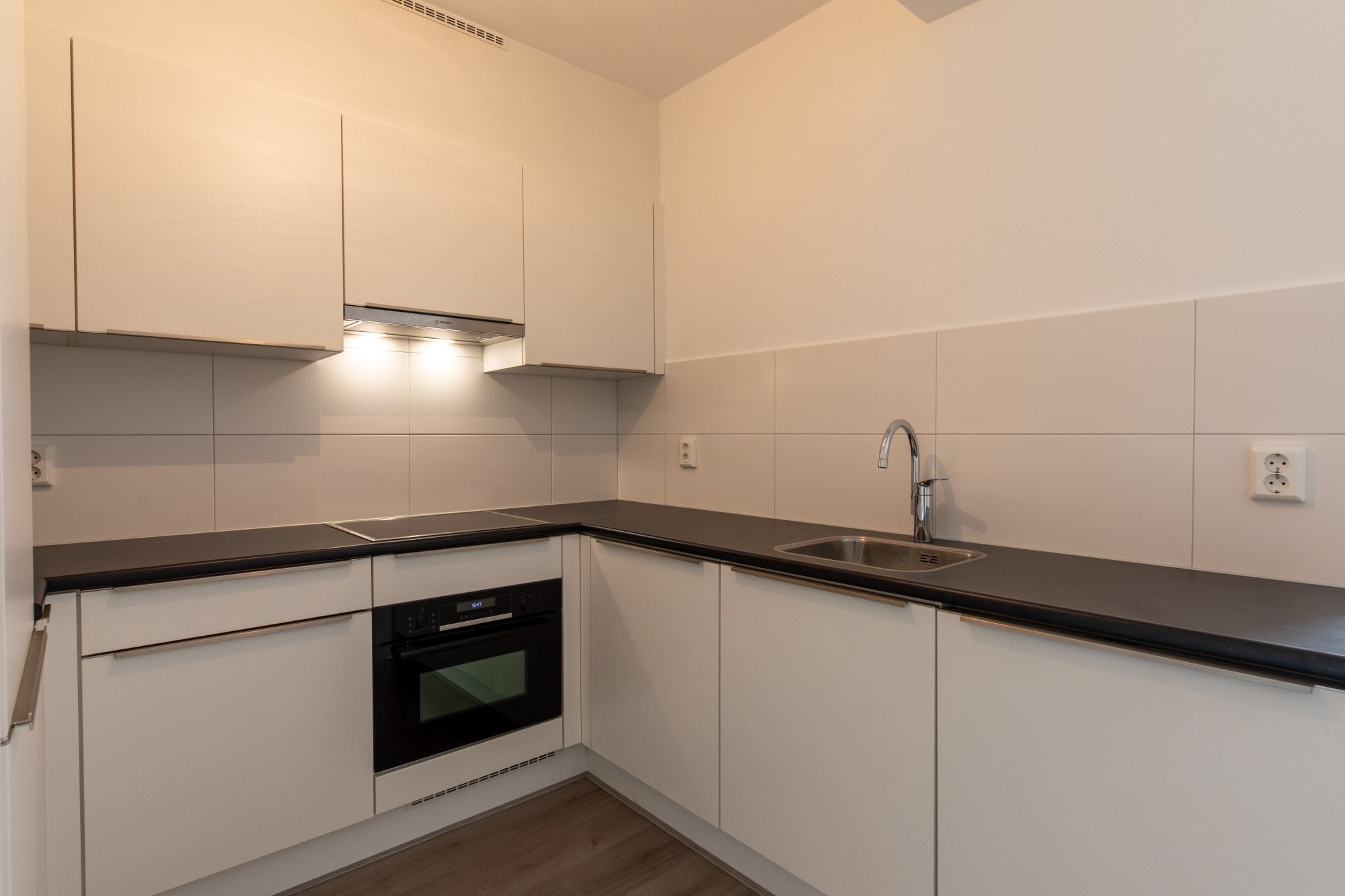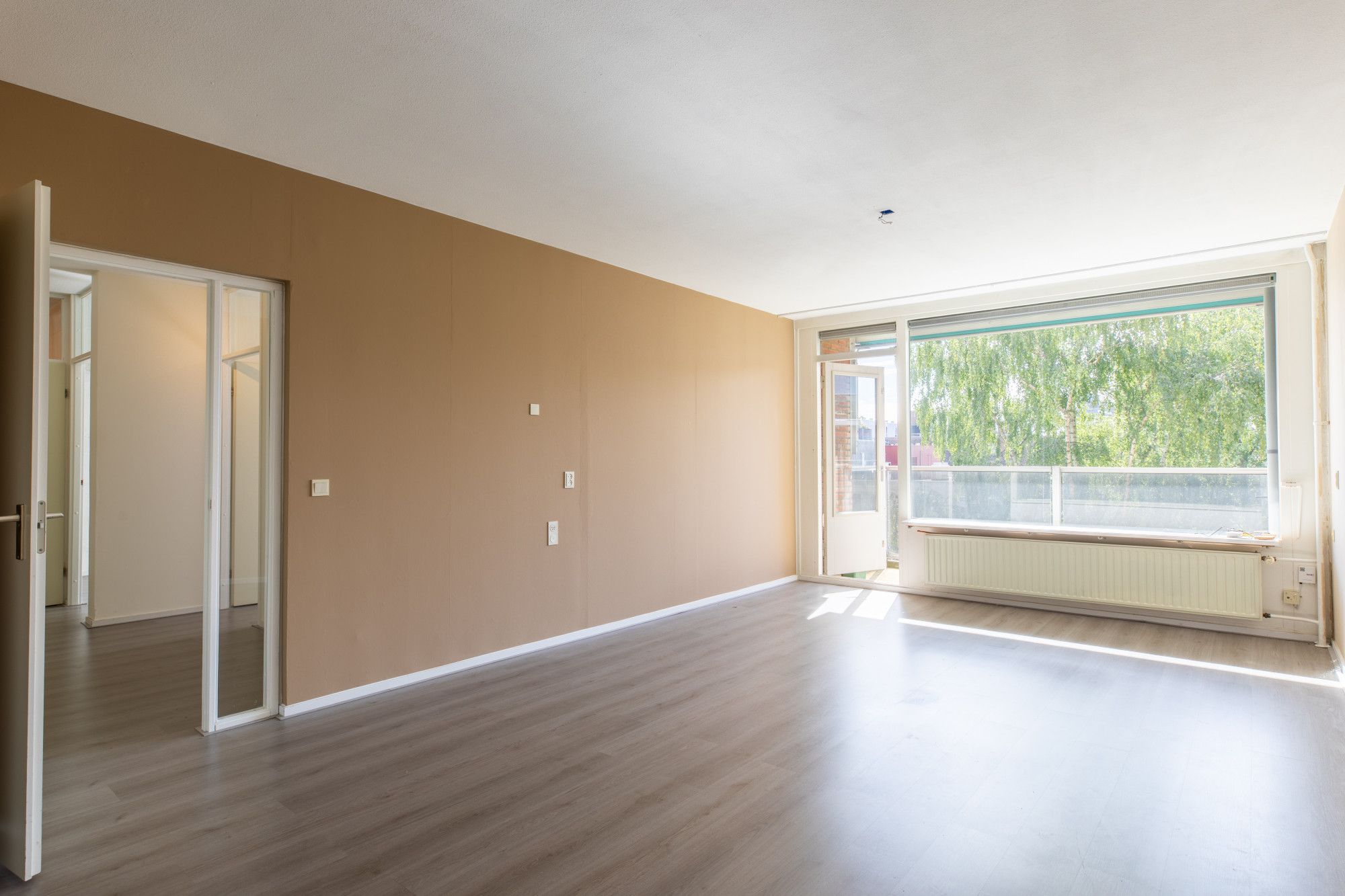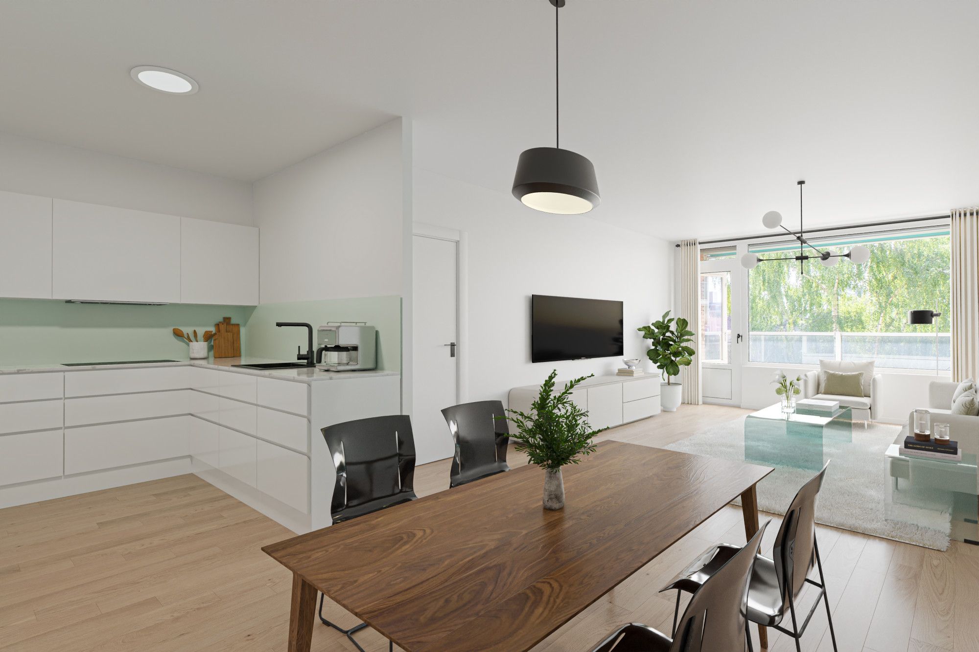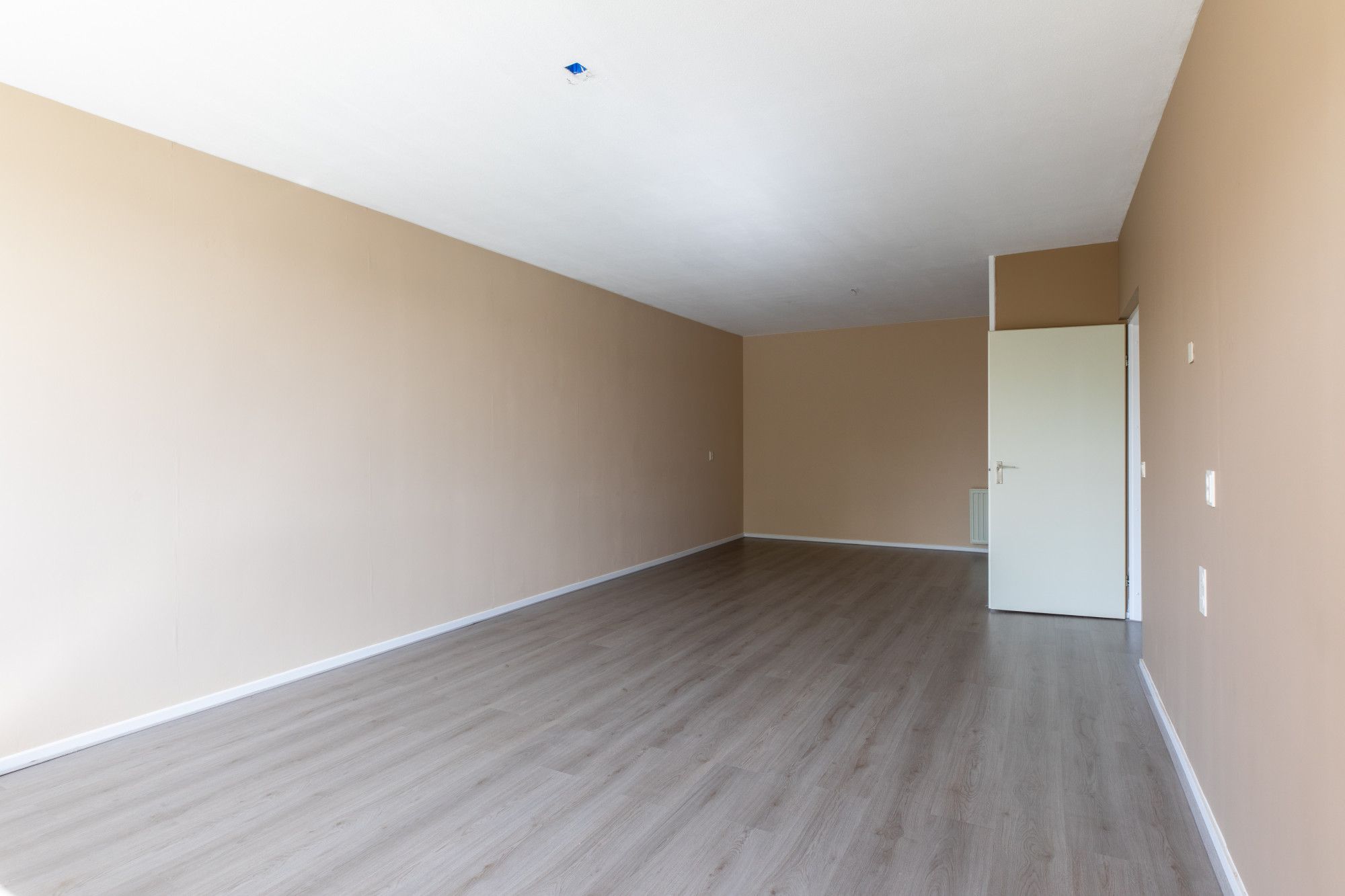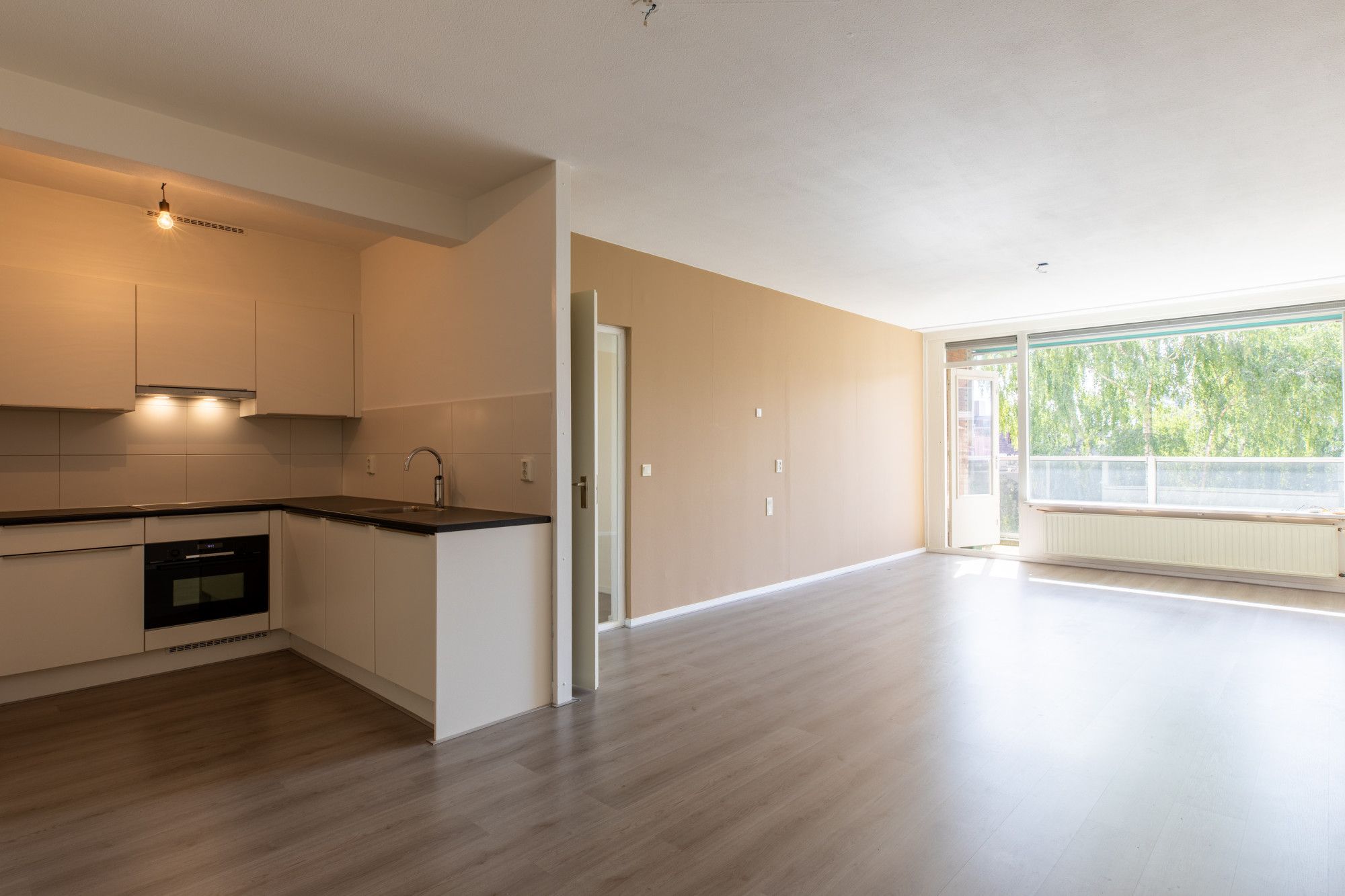 Ruime woonkamer met toegang naar balkon op het zuid-westen. Halfopen keuken voorzien van een moderne keukeninstallatie. Twee slaapkamers.