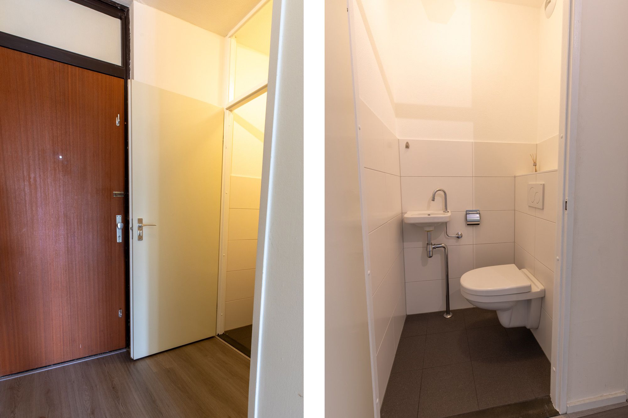 Ontvangsthal met deels betegelde toiletruimte met toilet en fonteintje.
