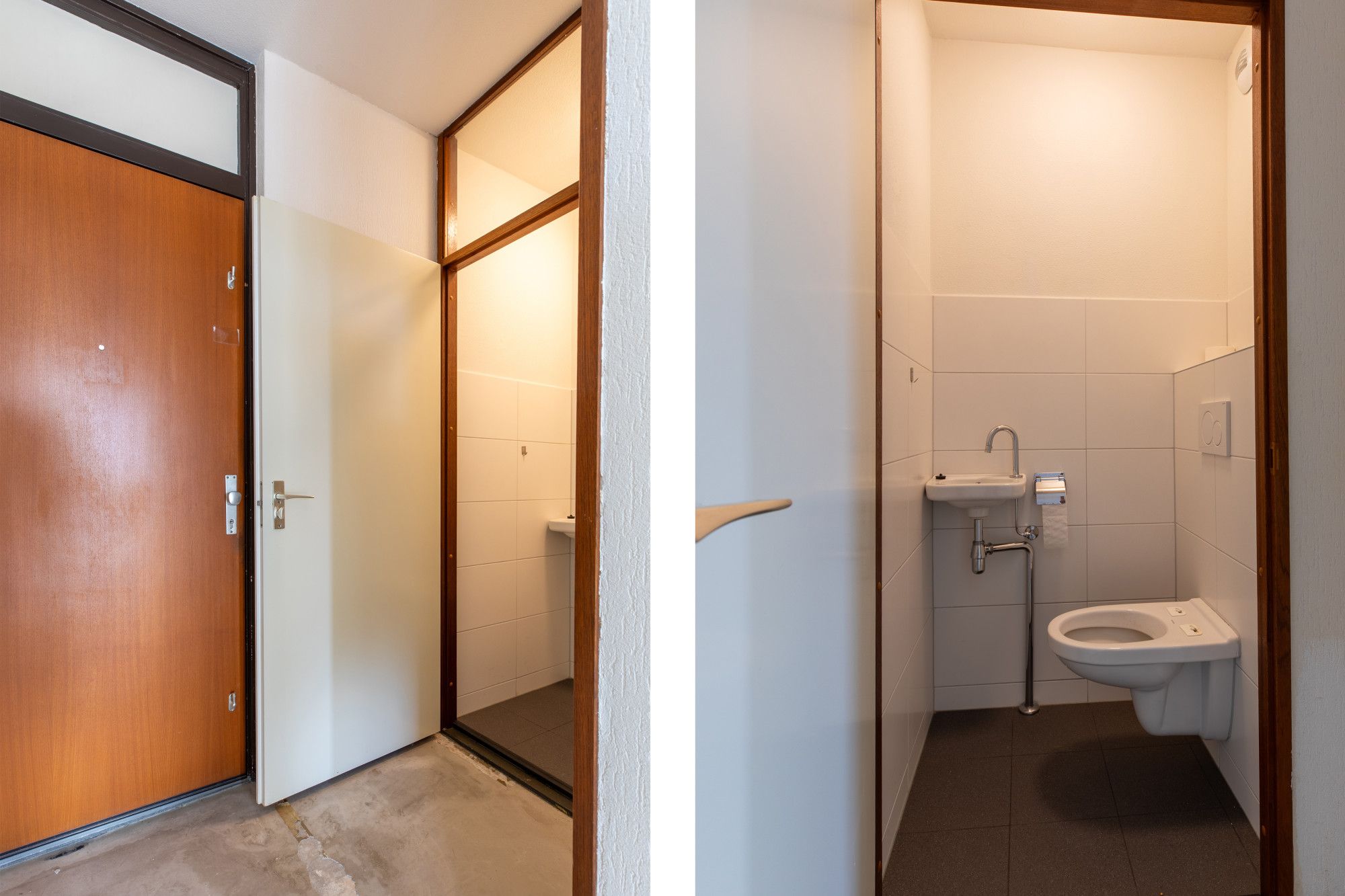 Ontvangsthal met moderne toiletruimte voorzien van zwevend toilet en fonteintje.