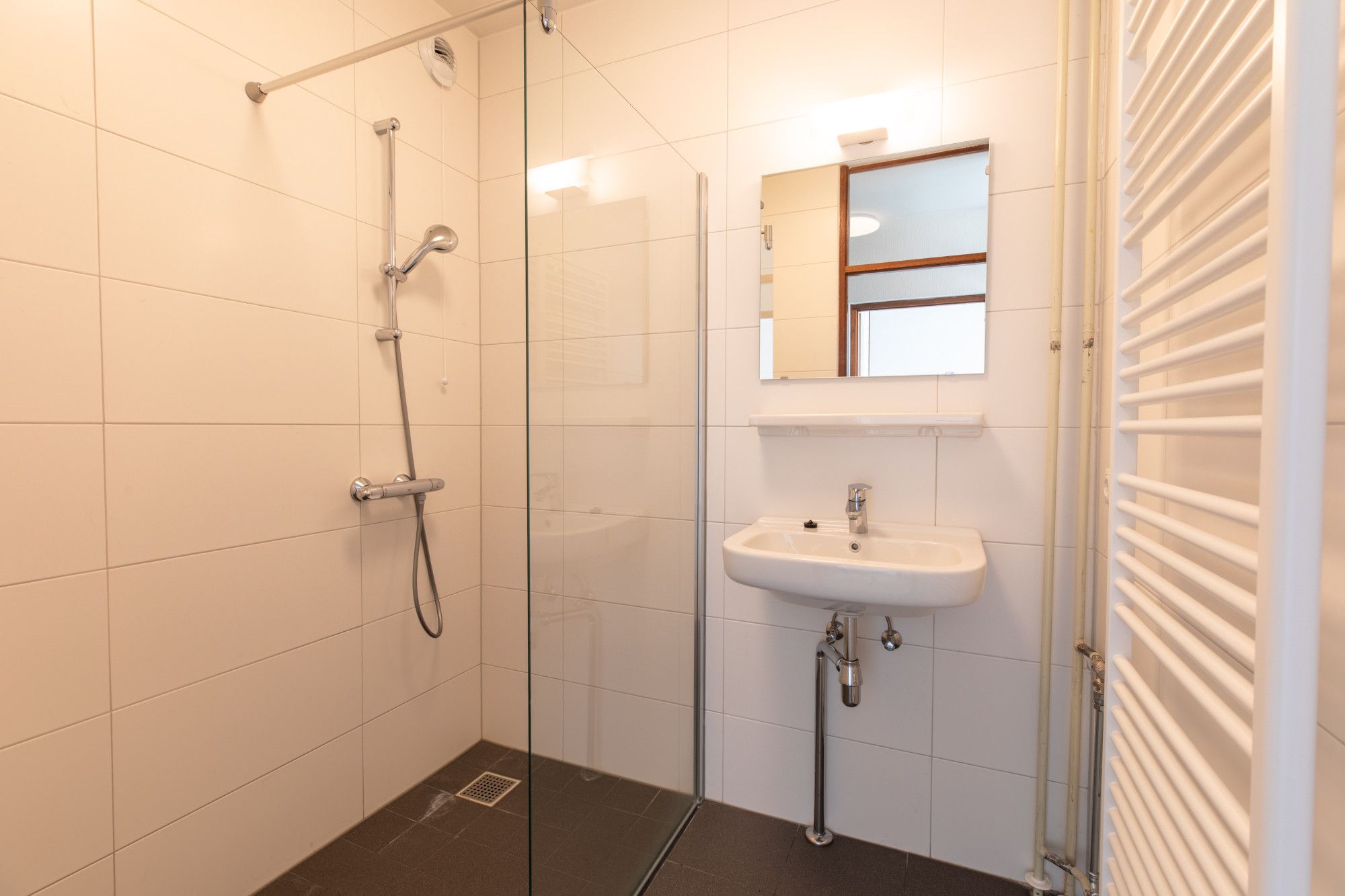 Gerenoveerde badkamer met inloopdouche en vaste wastafel.